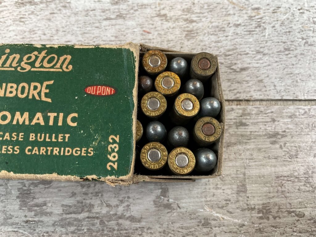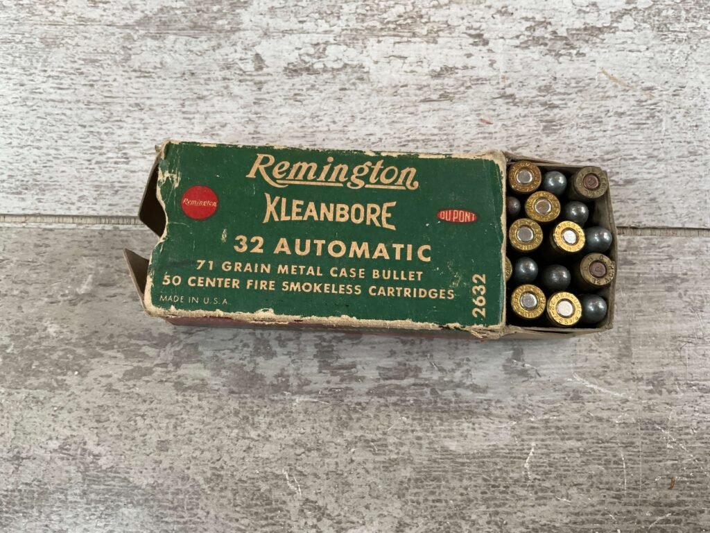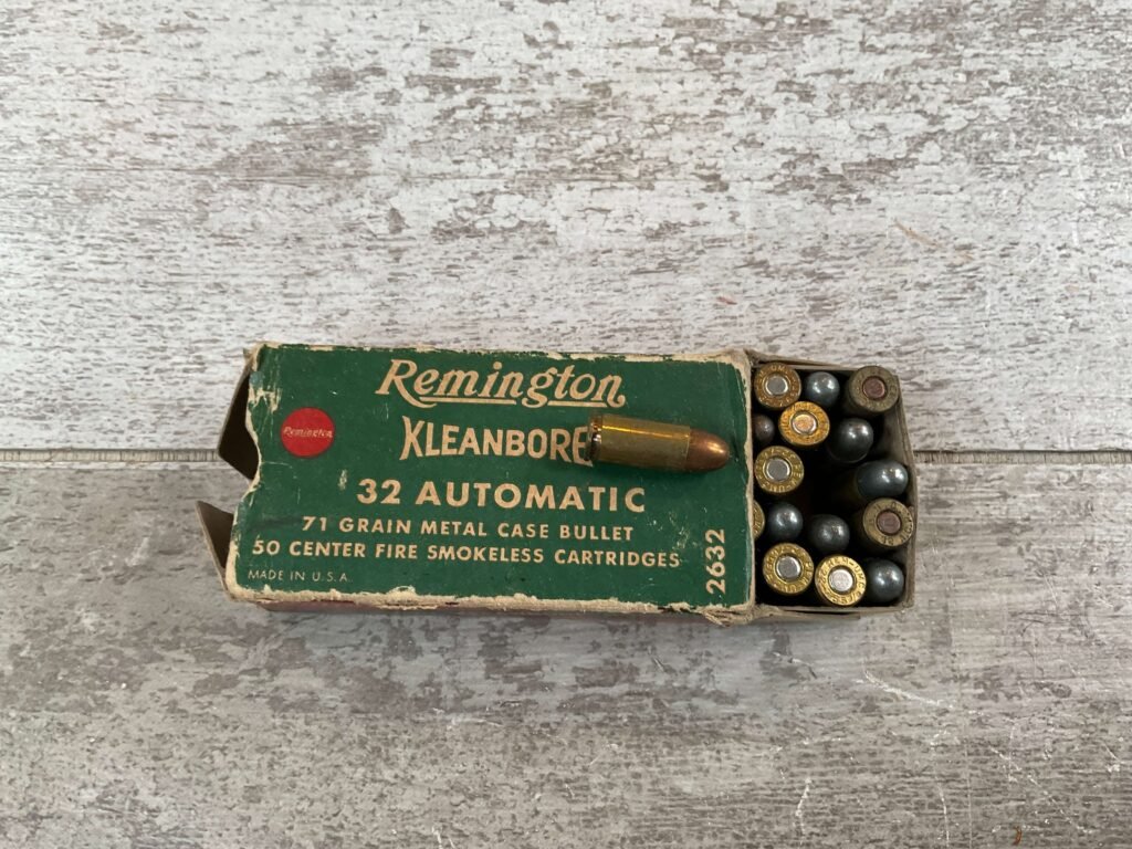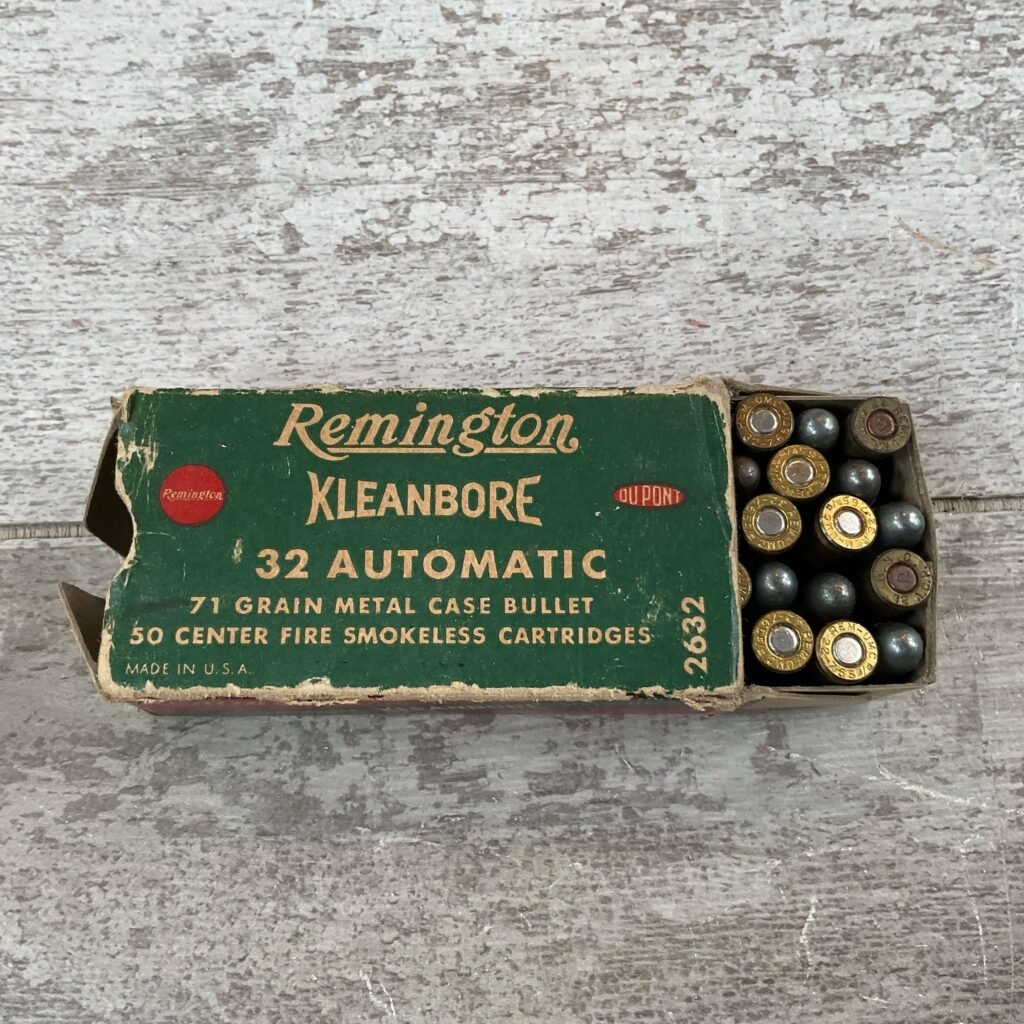 REMINGTON 32 AUTO CENTER FIRE, KLEANBORE AMMUNITION, 71 GRAIN METAL CASE BULLET, VINTAGE BOX IN FAIR CONDITION, ONE END TAB IS MISSING HEAVY EDGE WEAR. QTY 49