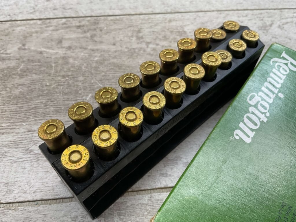 REMINGTON 357 REM MAX AMMO, QTY 15, PLUS BRASS OF 5 SPENT ROUNDS, 158 GRAIN, SEMI JKTD HOLLOW POINT
