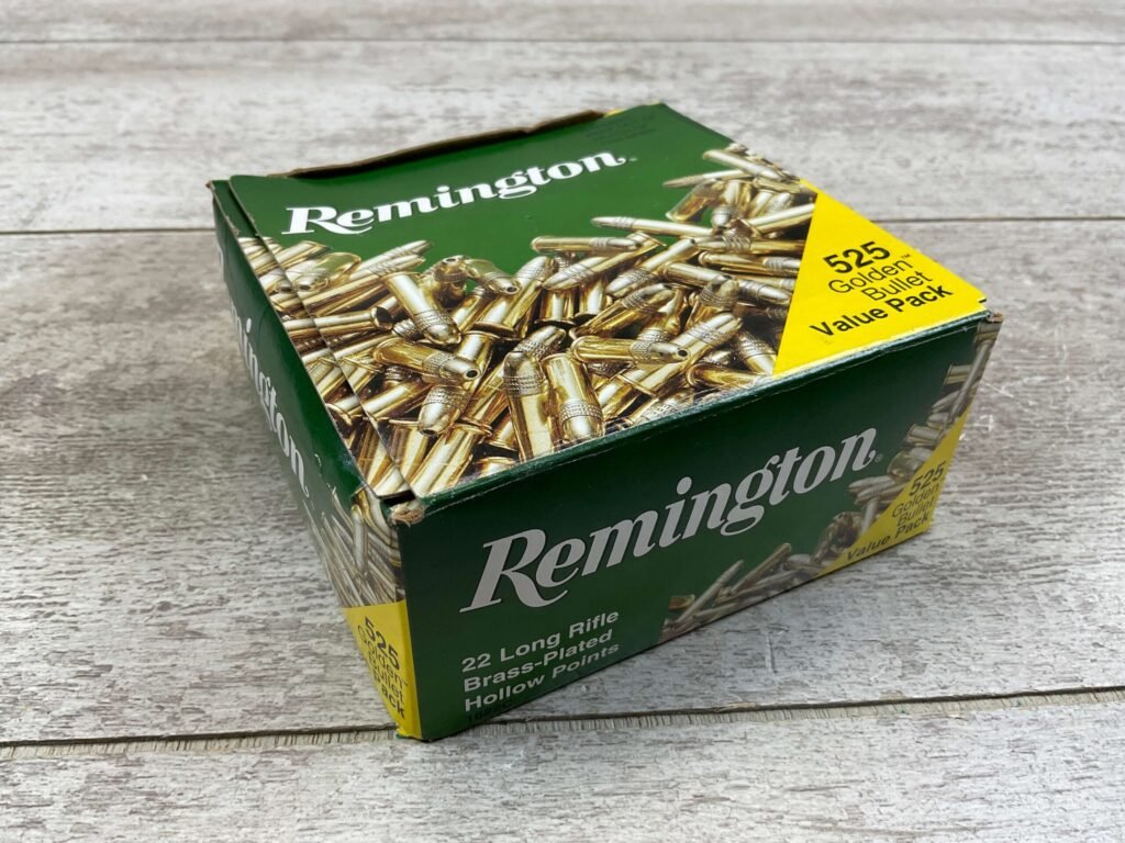 REMINGTON 525 GOLDEN BULLET VALUE PACK 22 LR AMMO, FULL BOX, BOX IS TAPED ON ONE SIDE CORNER DUE TO WEIGHT, OTHERWISE IN EXC CONDITION.