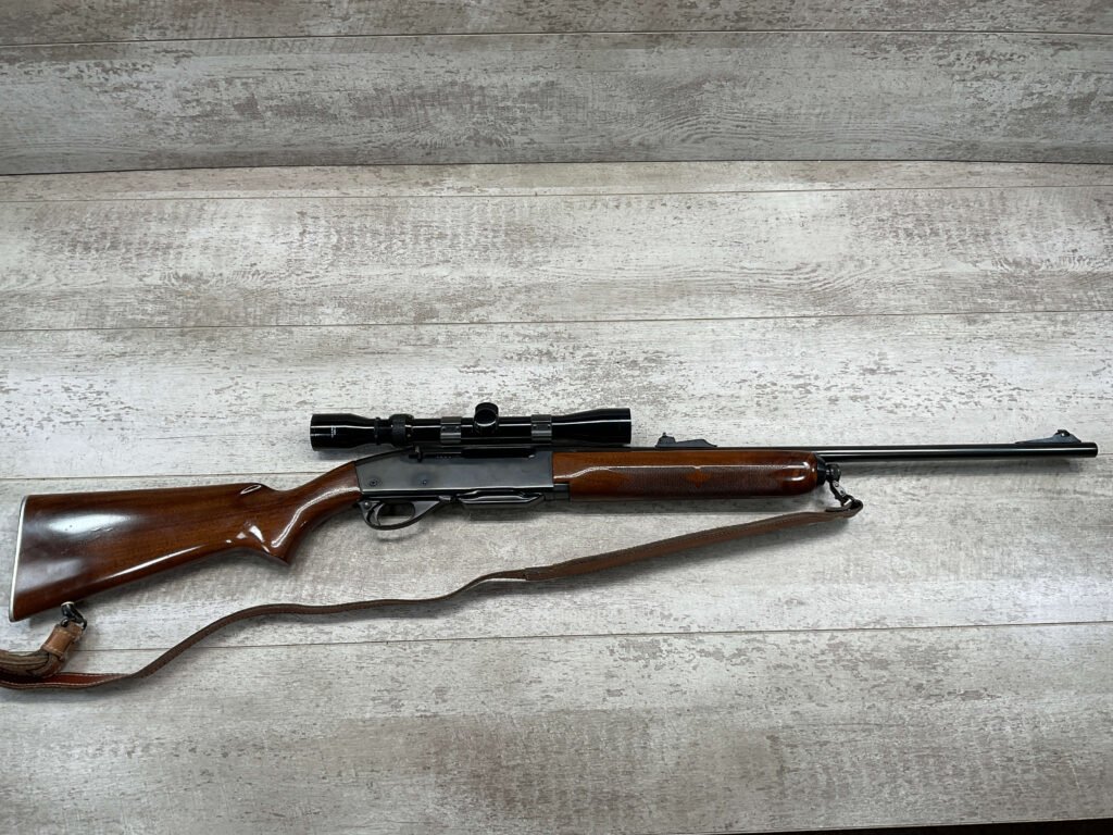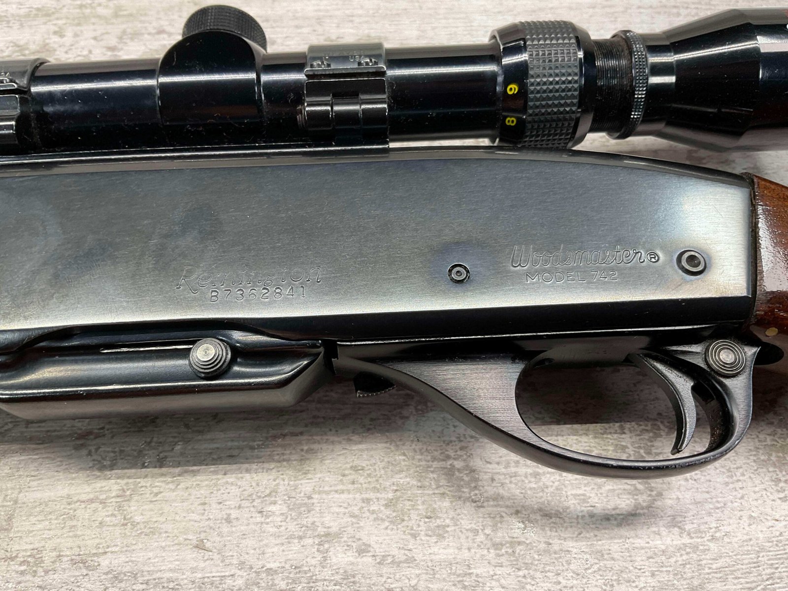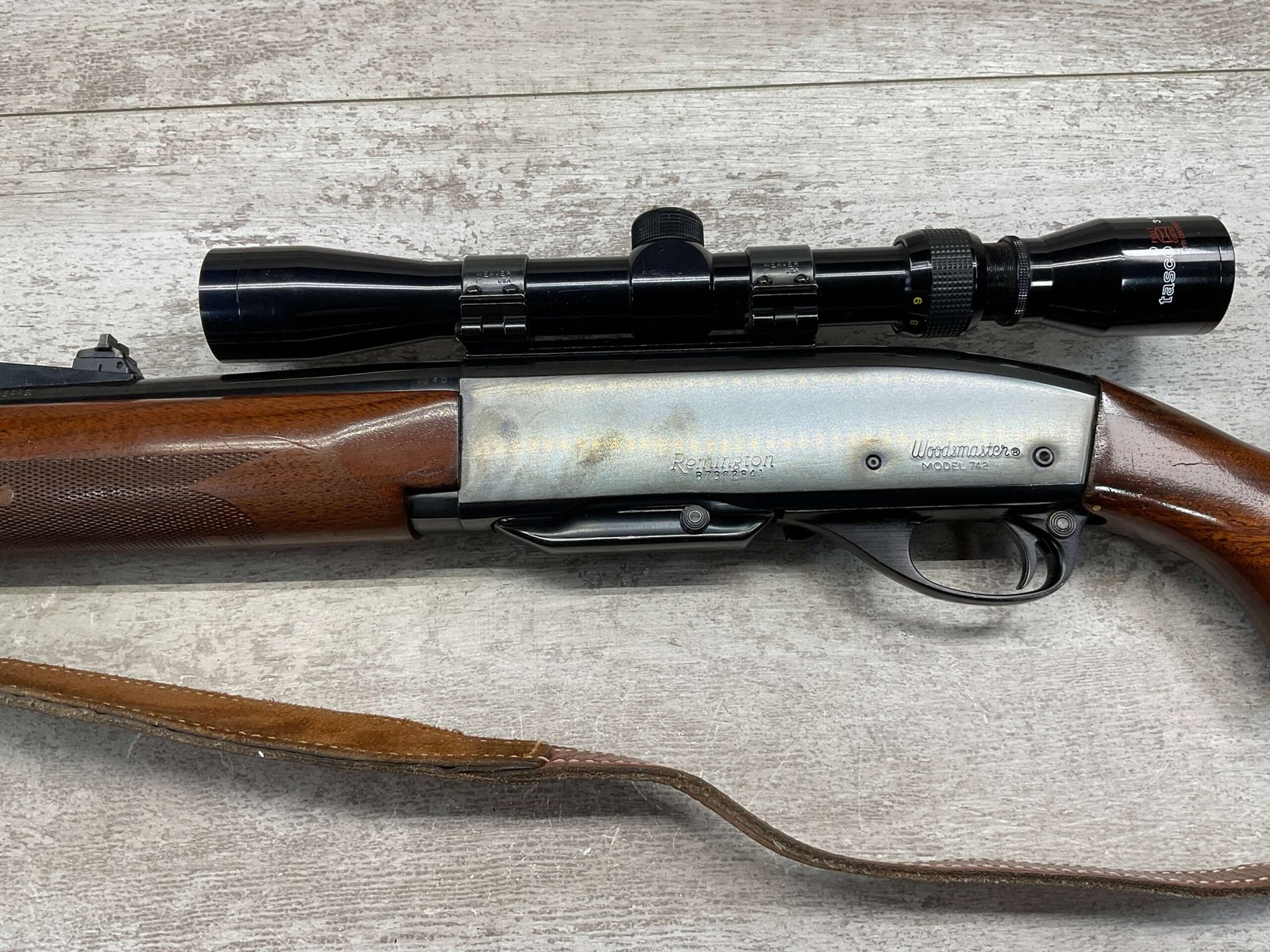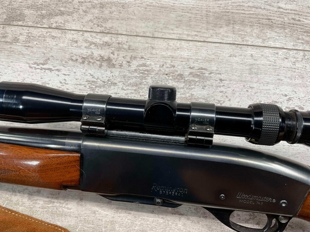 REMINGTON 742 WOODMASTER 30-06 SEMI AUTO RIFLE #B7362841, DELUXE GRADE, “OC” MARKED BBL (JUL 1982), EXC CHECKERED WALNUT STOCK W/VERY LIGHT MARKS FROM USE, EXC BRIGHT BORE & RIFLING, STEEL BUTT PLATE, SLING SWIVELS, LEATHER SLING, EXC ORIGINAL BLUE, TASCO 3-9X32 SCOPE, ORIGINAL SIGHTS STILL PRESENT, 1 – 4 ROUND REMOVABLE MAGAZINE, EXC OVERALL & READY TO HUNT!!