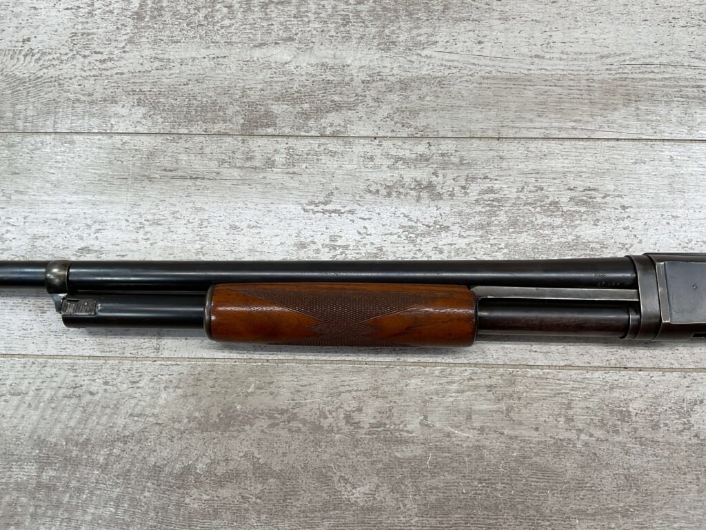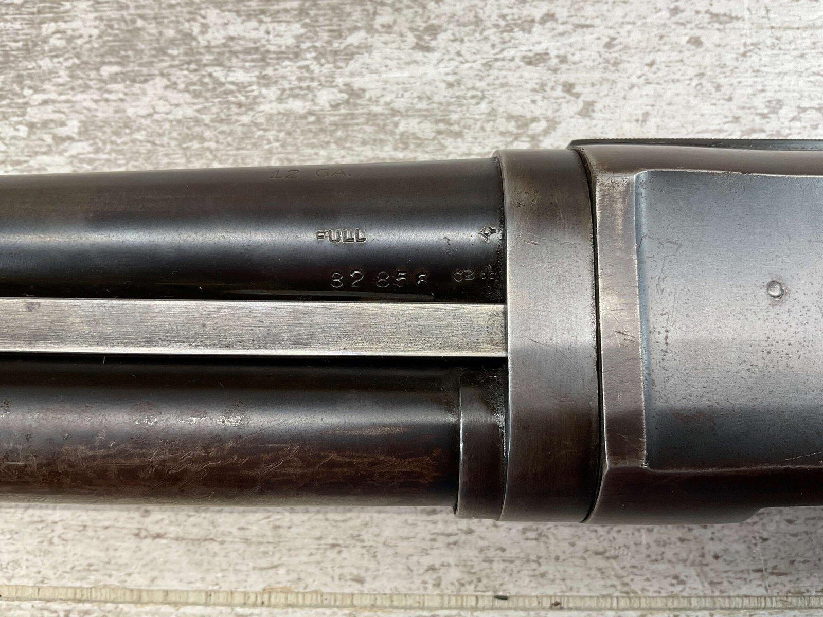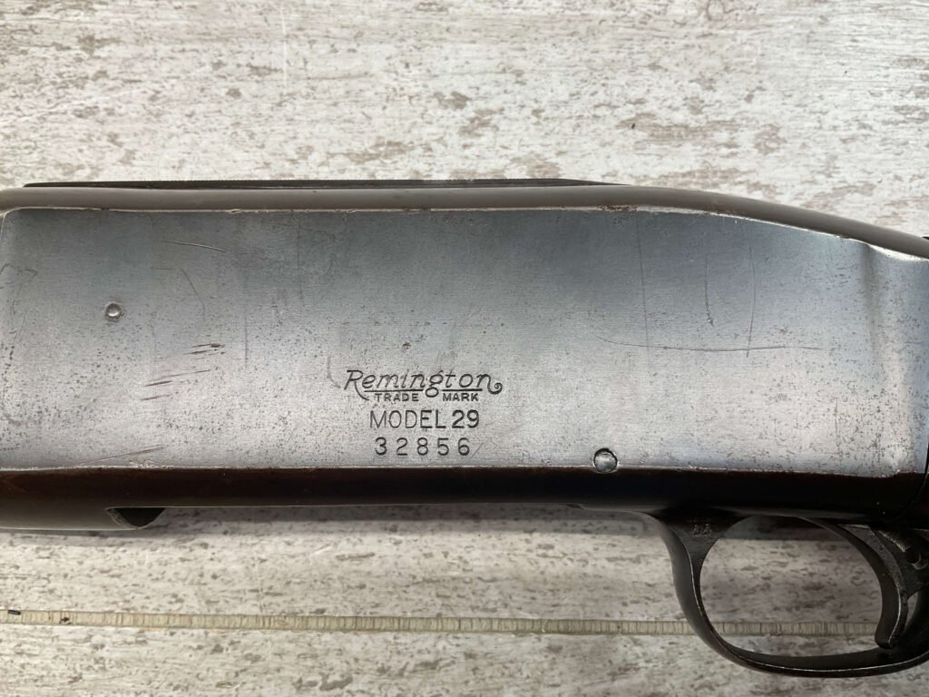 REMINGTON ARMS CO MODEL 29 12GA PUMP ACTION SHOTGUN #32856, 30″ BBL, VG BLUE W/AREAS OF LIGHT FRECKLING & HIGH EDGE WEAR, EXC CHECKERED WALNUT PISTOL GRIP STOCK, EXC BRIGHT BOR, FULL CHOKE, FRONT BEAD SIGHT, BBL & RECEIVER MATCH, BOTTOM EJECTION, 5 SHOT MAGAZINE, BLACK PLASTIC RECOIL PAD, “CB” MAN CODE (APRIL 1933), THESE ARE BECOMING INCREASINGLY HARD TO FIND IN THIS CONDITION!