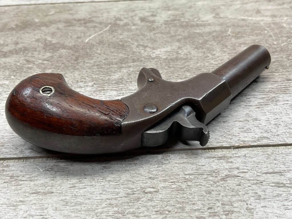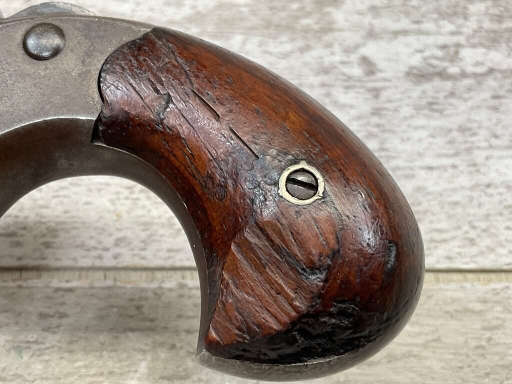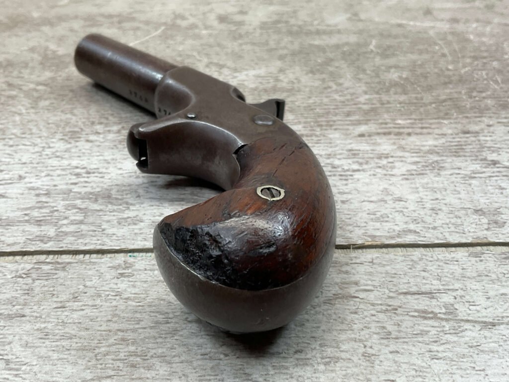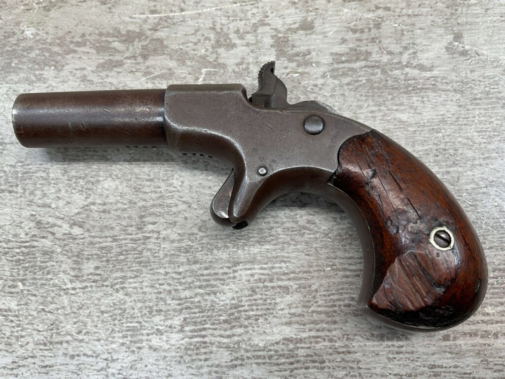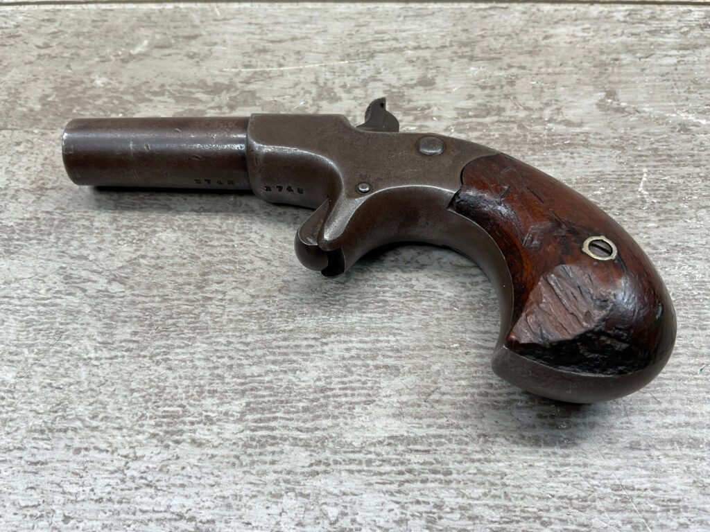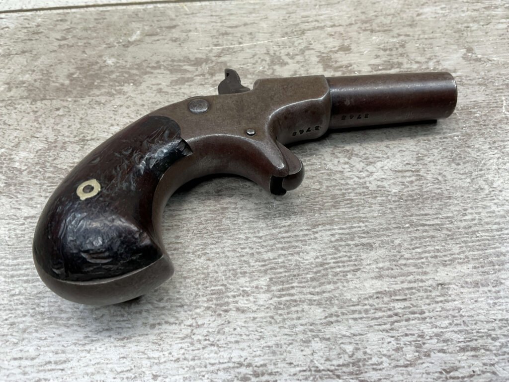 REMINGTON ELLIOT .41RF DERRINGER SINGLE SHOT PISTOL, ANTIQUE & RARE #3748, .41 RIMFIRE, GOOD BORE & RIFLING, FINISH HAS TURNED BROWN PATINA, ALL MATCHING, LEFT GRIP SHOWS WEAR & SMALL PIECE MISSING, SPUR TRIGGER, CASE COLOR HAMMER W/ REAR SIGHT BUILT IN, BARREL MARKED “REMINGTONS, ILION, N.Y. ELLIOT PAT. AUG. 27, 1867”, TIGHT ACTION, STRONG SPRINGS, NOT A REPRODUCTION, OVERALL CONDITION AS SEEN IN PHOTOS