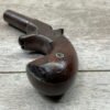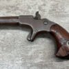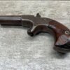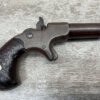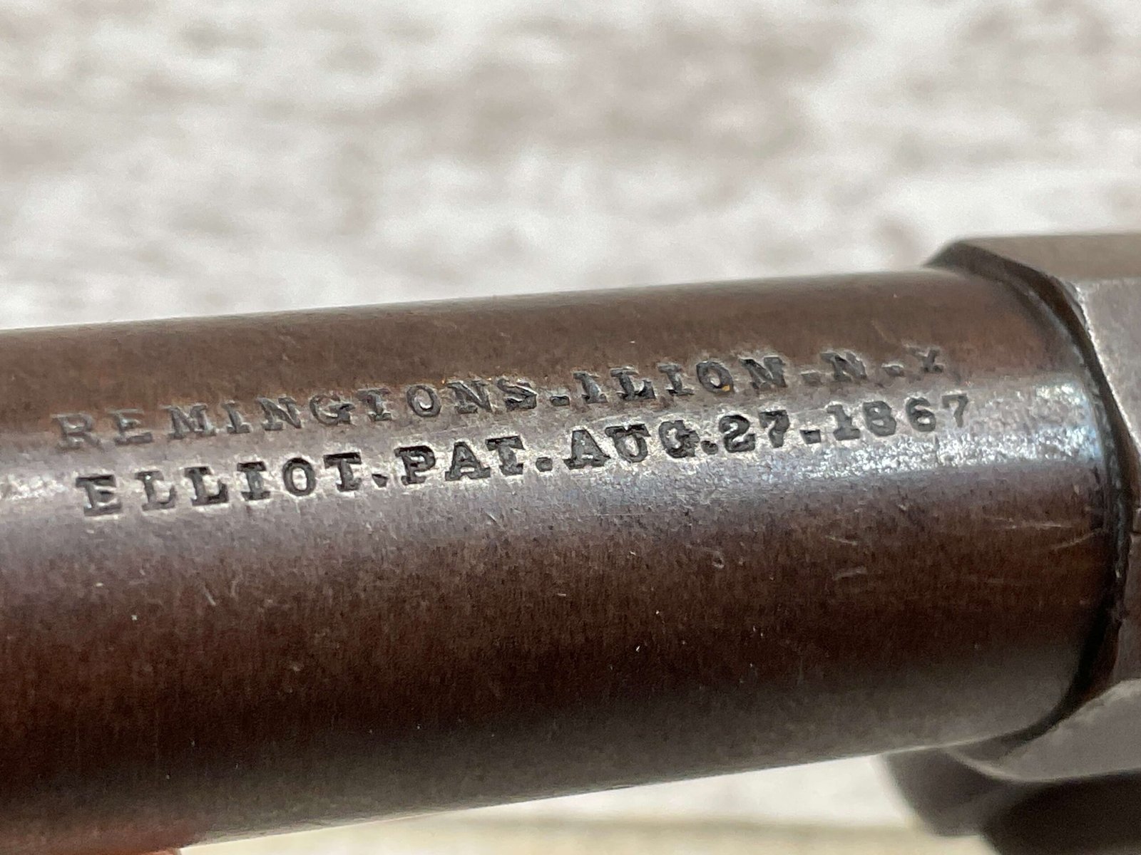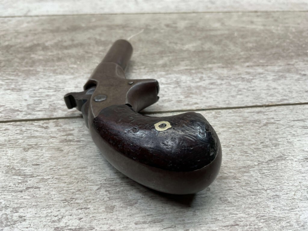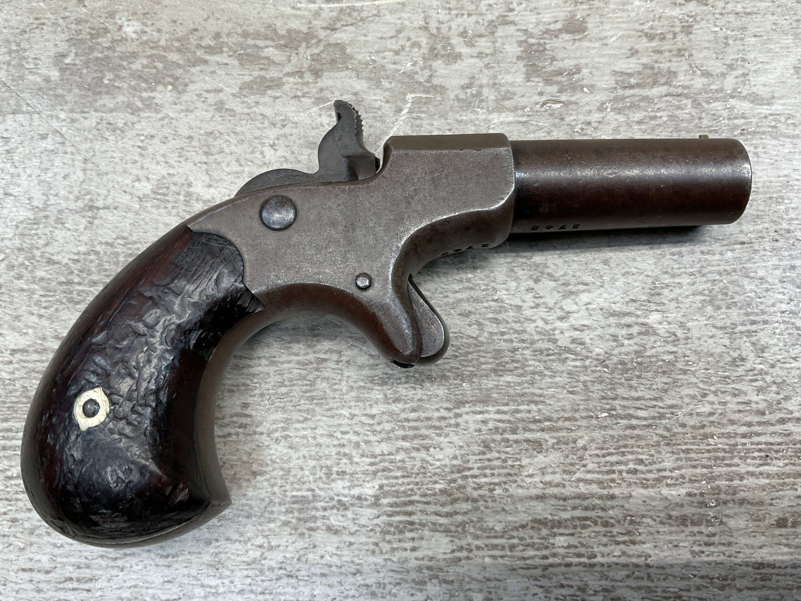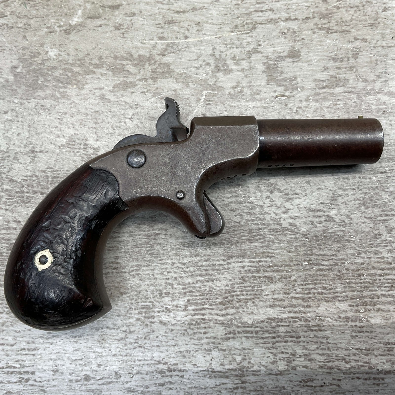 REMINGTON ELLIOT .41RF DERRINGER SINGLE SHOT PISTOL, ANTIQUE & RARE #3748, .41 RIMFIRE, GOOD BORE & RIFLING, FINISH HAS TURNED BROWN PATINA, ALL MATCHING, LEFT GRIP SHOWS WEAR & SMALL PIECE MISSING, SPUR TRIGGER, CASE COLOR HAMMER W/ REAR SIGHT BUILT IN, BARREL MARKED “REMINGTONS, ILION, N.Y. ELLIOT PAT. AUG. 27, 1867”, TIGHT ACTION, STRONG SPRINGS, NOT A REPRODUCTION, OVERALL CONDITION AS SEEN IN PHOTOS