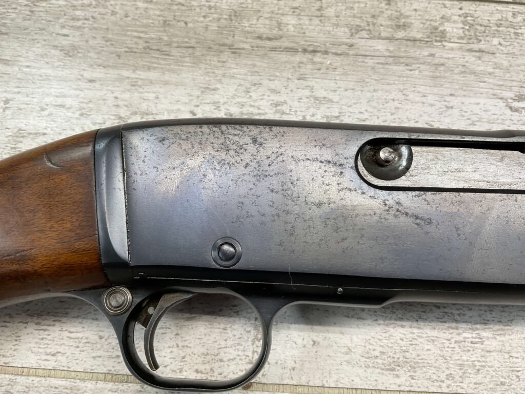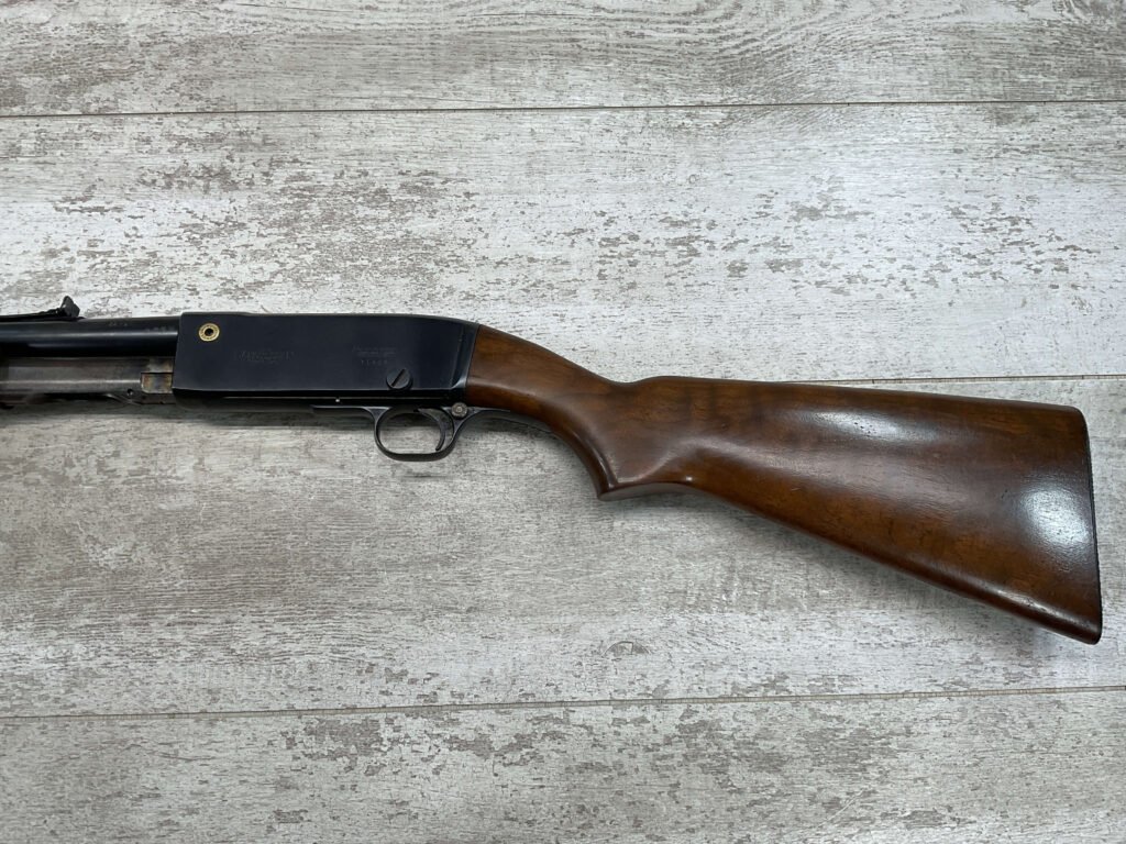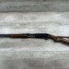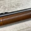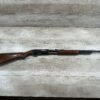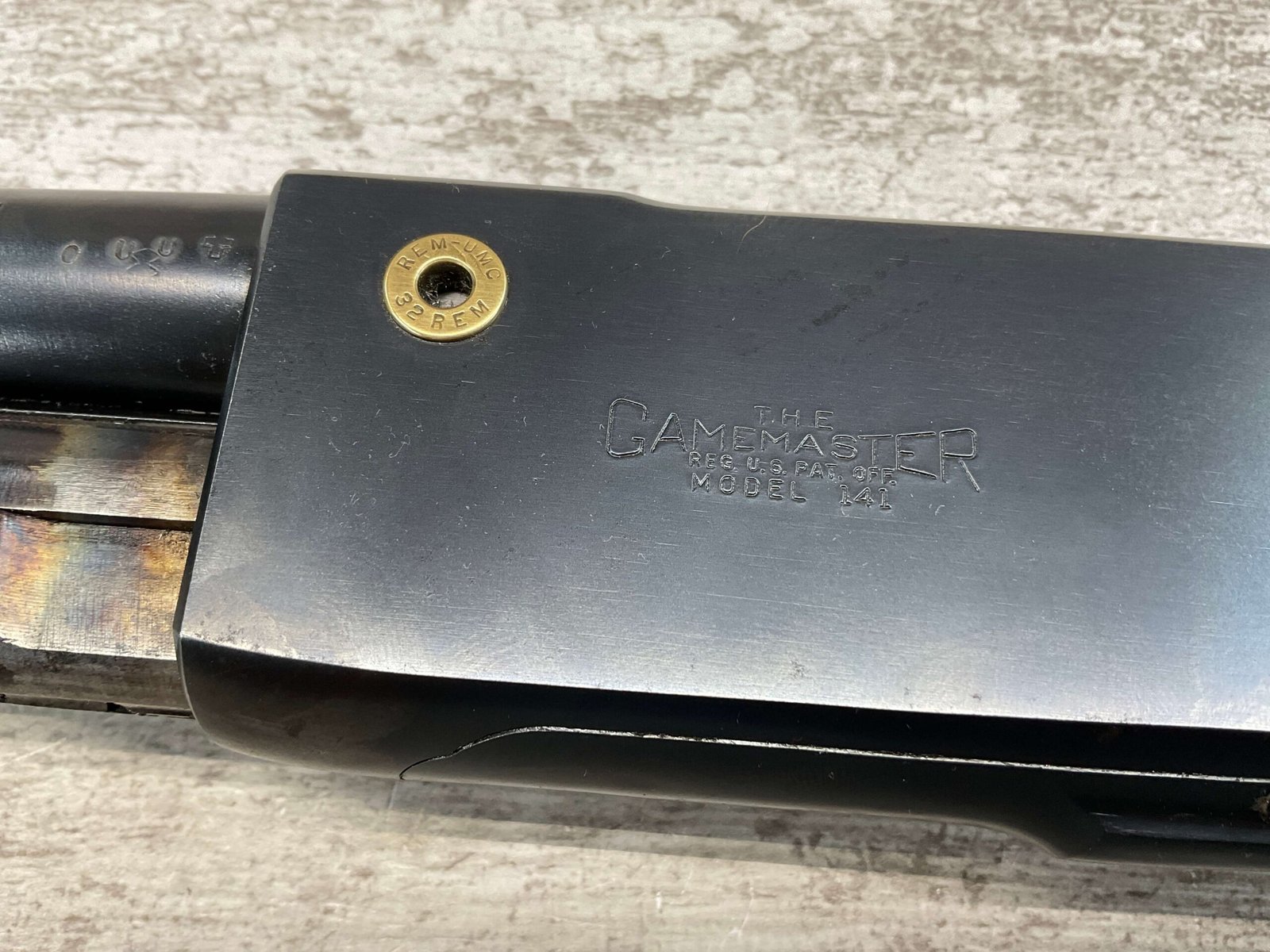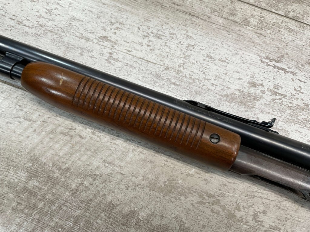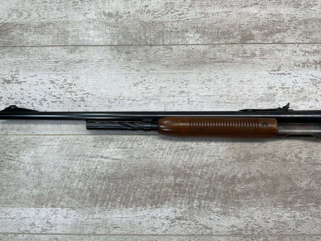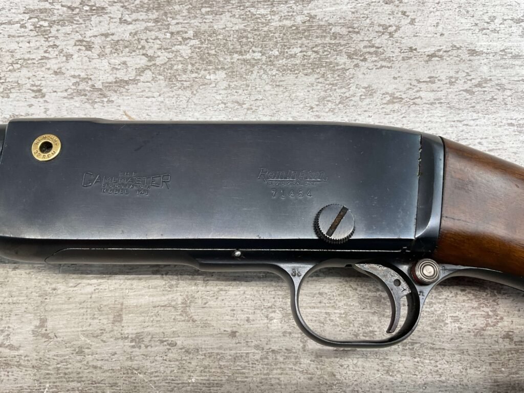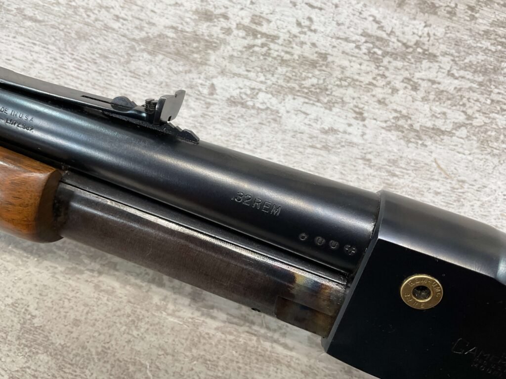 REMINGTON MODEL 141 .32 REM PUMP RIFLE #71464, 1949 MFR, TAKEDOWN MODEL, 24″ BARREL, EXC BORE & RIFLING, VG-EXC ORIGINAL DEEP BLUE FINISH W/SOME AREAS OF LIGHT FRECKLING, EXC AMERICAN WALNUT STOCK W/LIGHT DINGS & NICKS FROM USE/AGE, .32 REM SHELL CASING EMBEDDED ON LEFT SIDE OF RECEIVER, ADJ REAR SIGHT, FIXED FRONT SIGHT, REMINGTON PLASTIC BUTT PAD, RIFLE OPERATES & CYCLES SMOOTHLY, 95% OVERALL