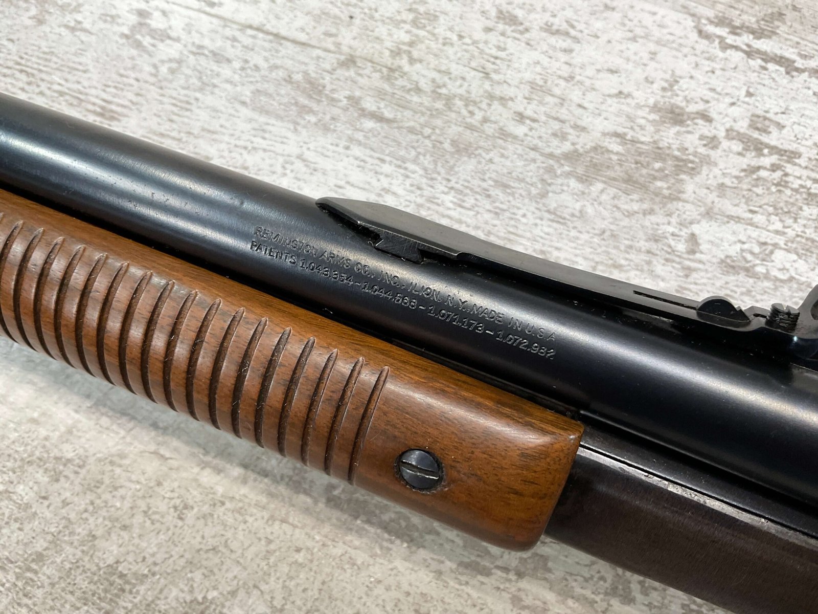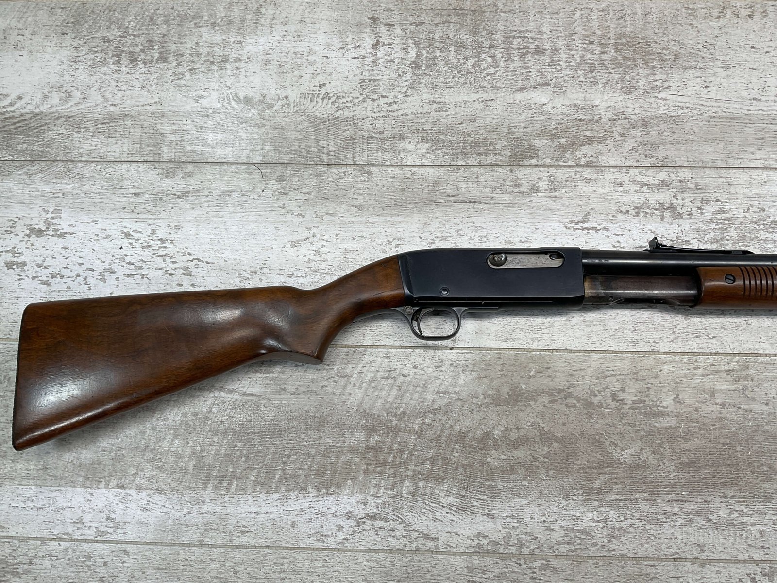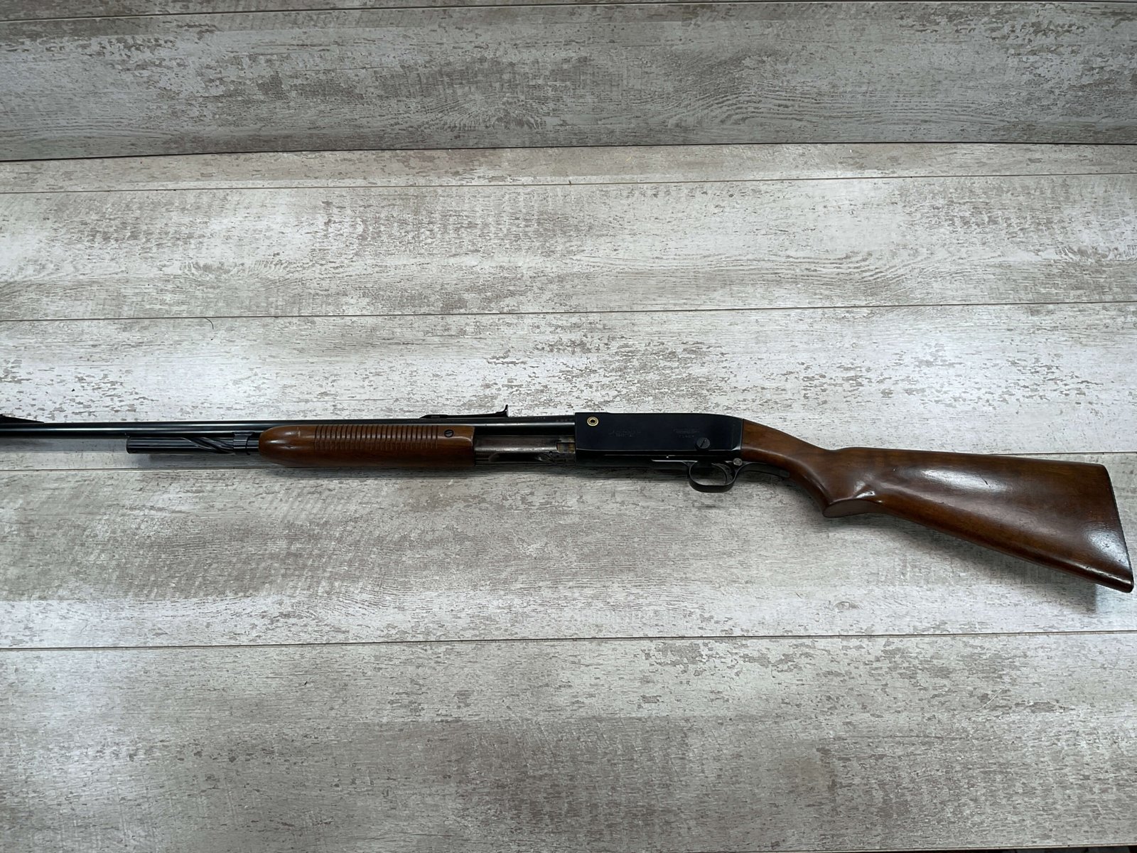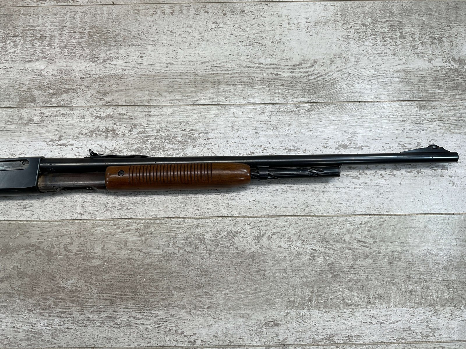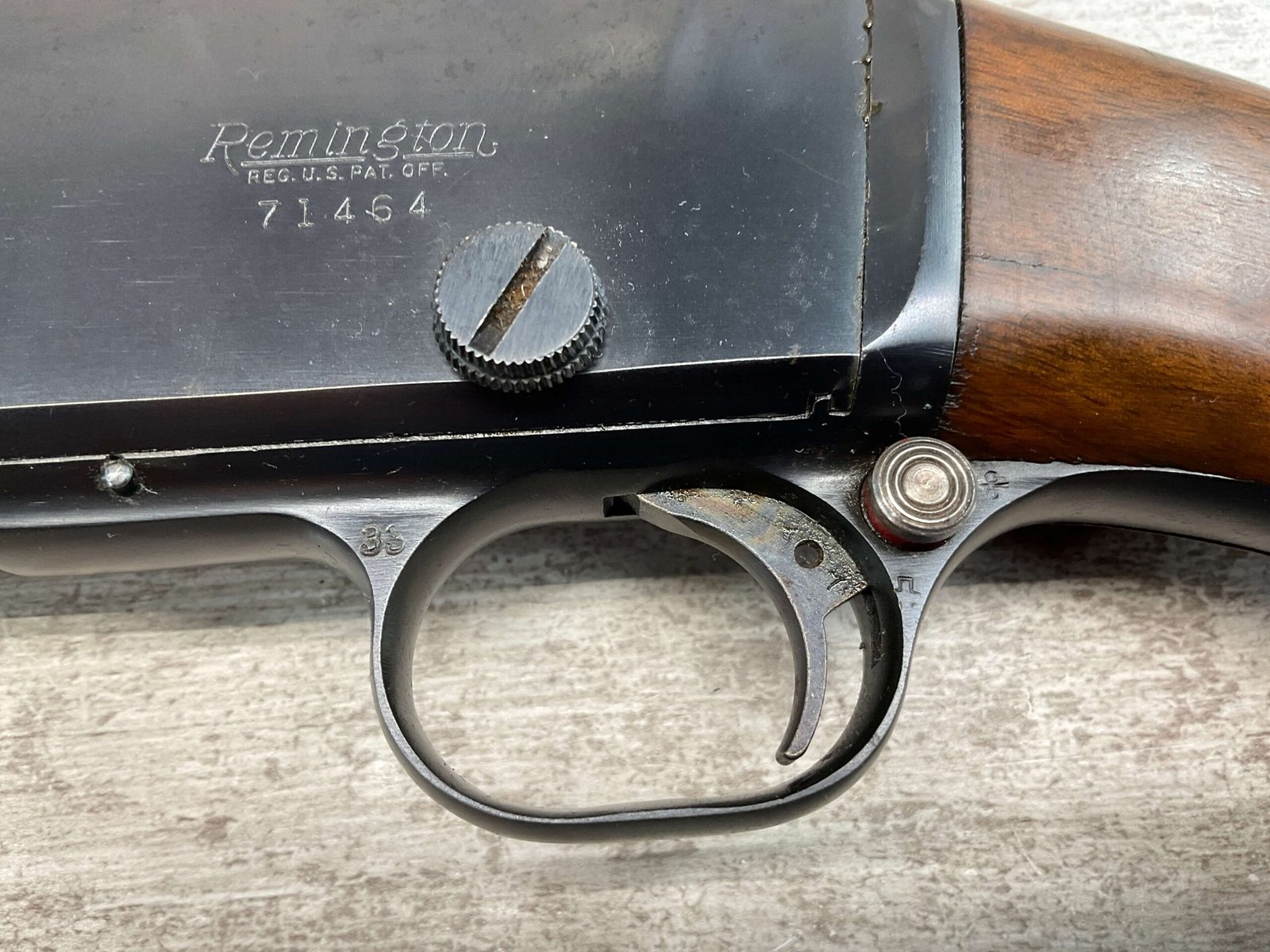 REMINGTON MODEL 141 .32 REM PUMP RIFLE #71464, 1949 MFR, TAKEDOWN MODEL, 24″ BARREL, EXC BORE & RIFLING, VG-EXC ORIGINAL DEEP BLUE FINISH W/SOME AREAS OF LIGHT FRECKLING, EXC AMERICAN WALNUT STOCK W/LIGHT DINGS & NICKS FROM USE/AGE, .32 REM SHELL CASING EMBEDDED ON LEFT SIDE OF RECEIVER, ADJ REAR SIGHT, FIXED FRONT SIGHT, REMINGTON PLASTIC BUTT PAD, RIFLE OPERATES & CYCLES SMOOTHLY, 95% OVERALL