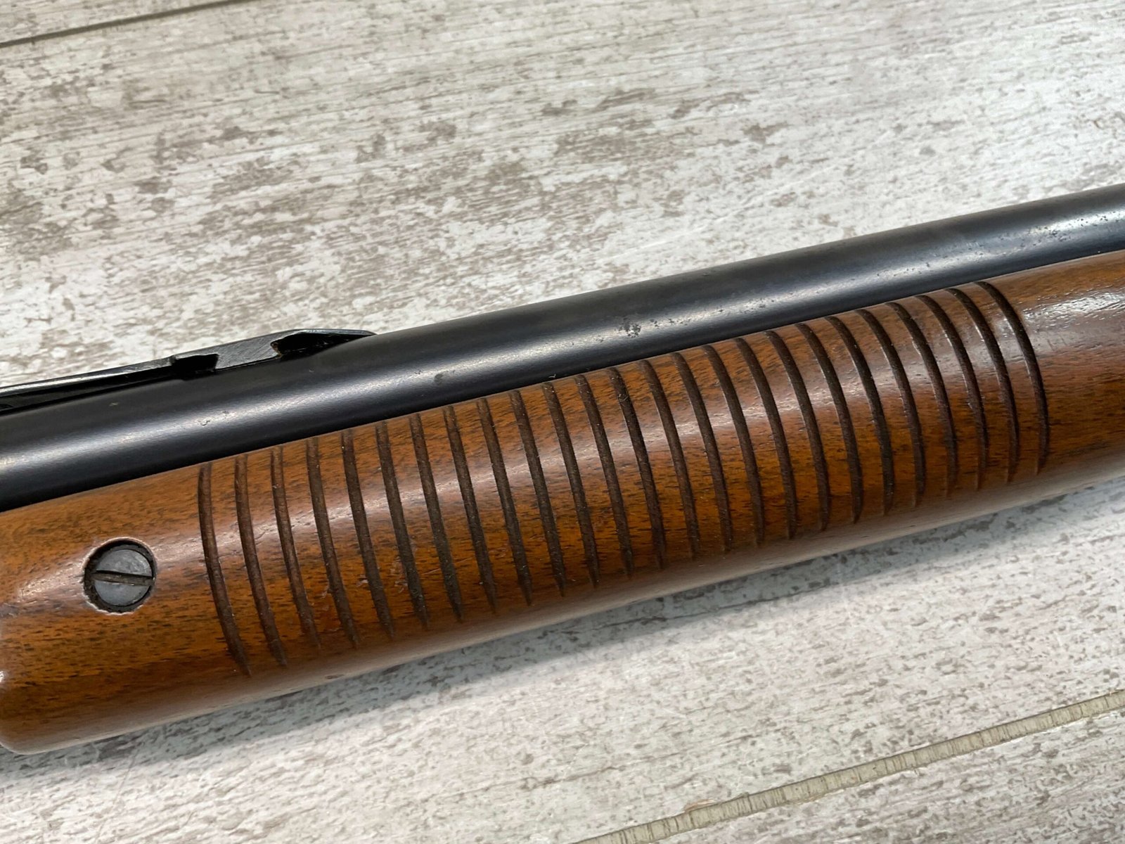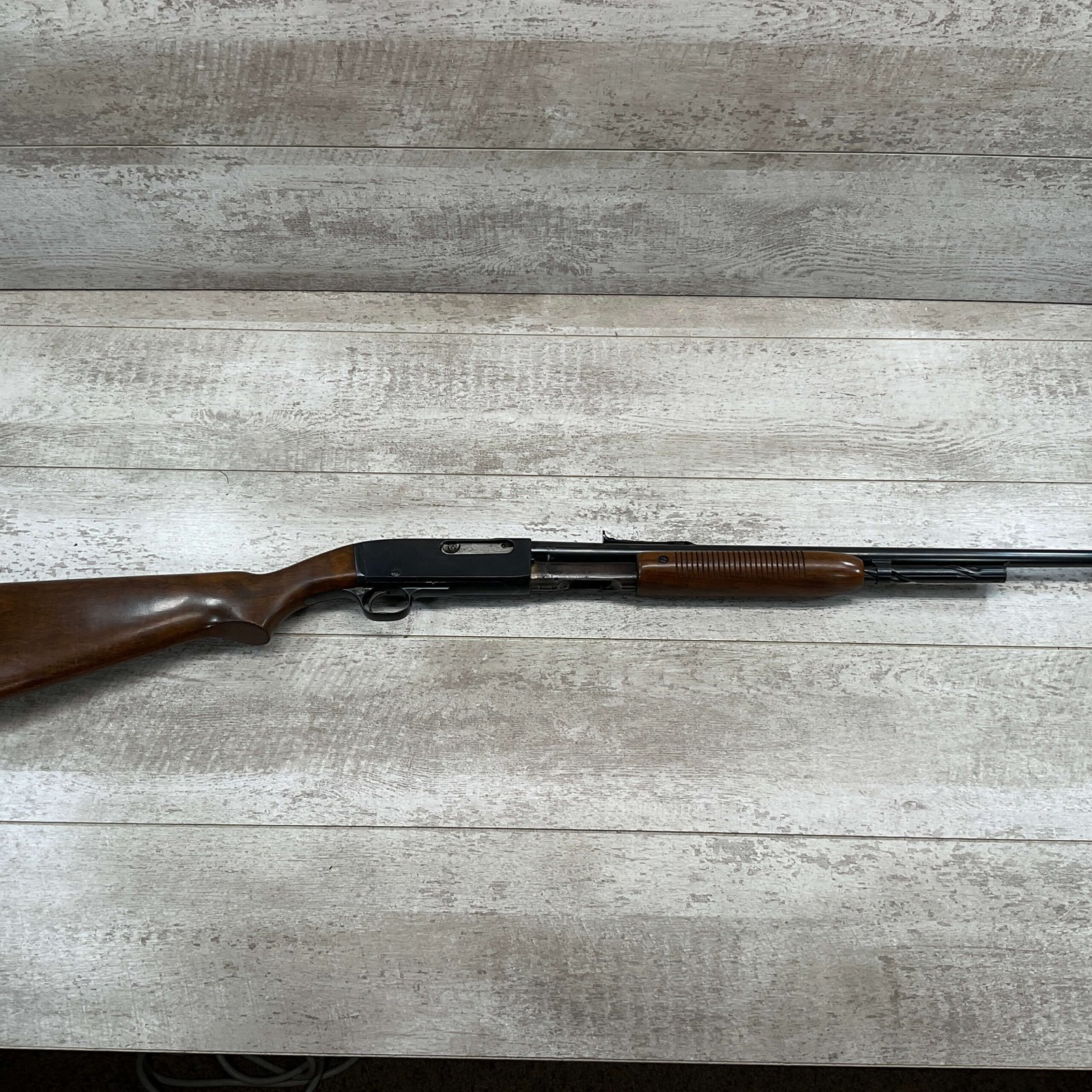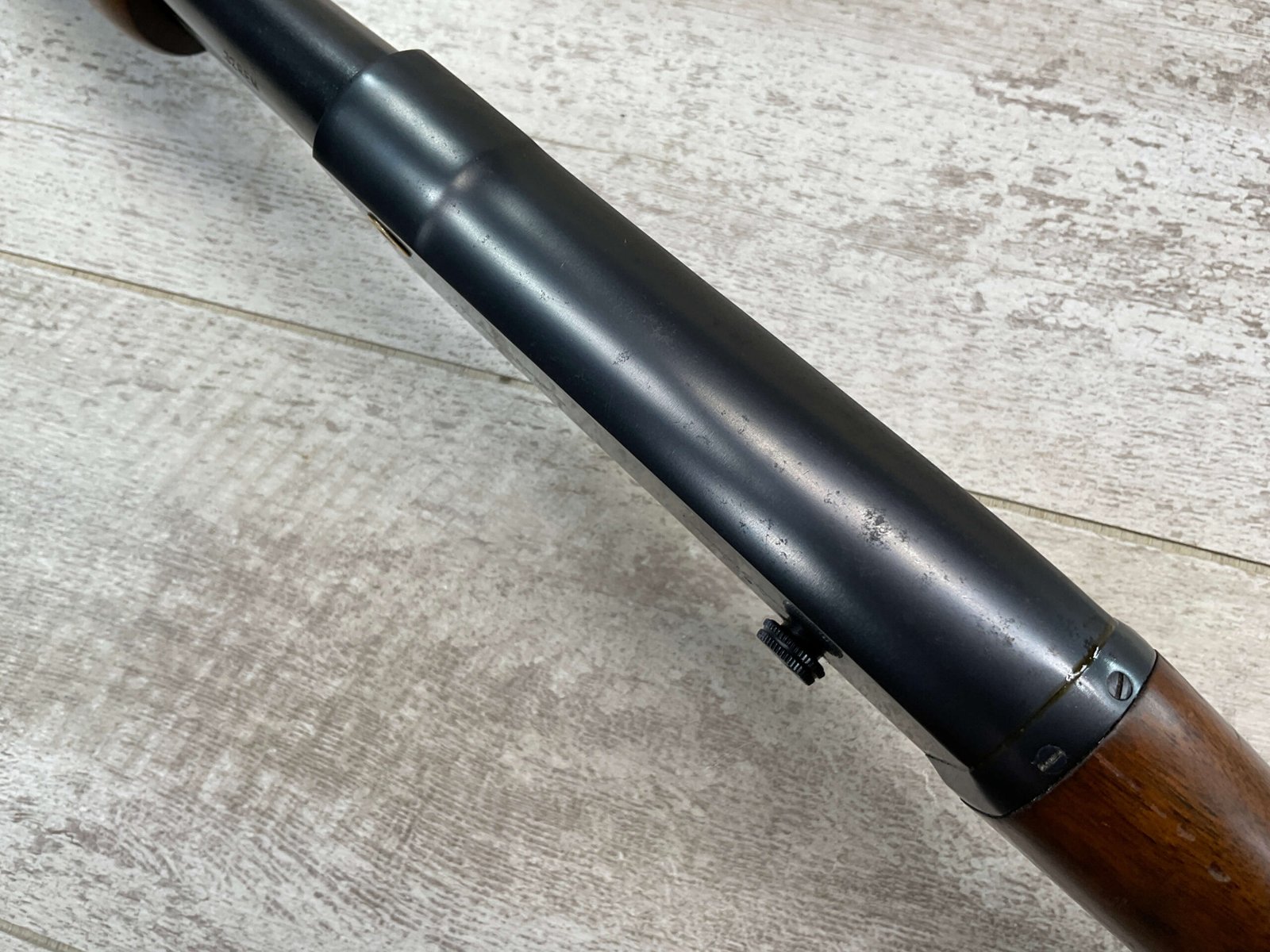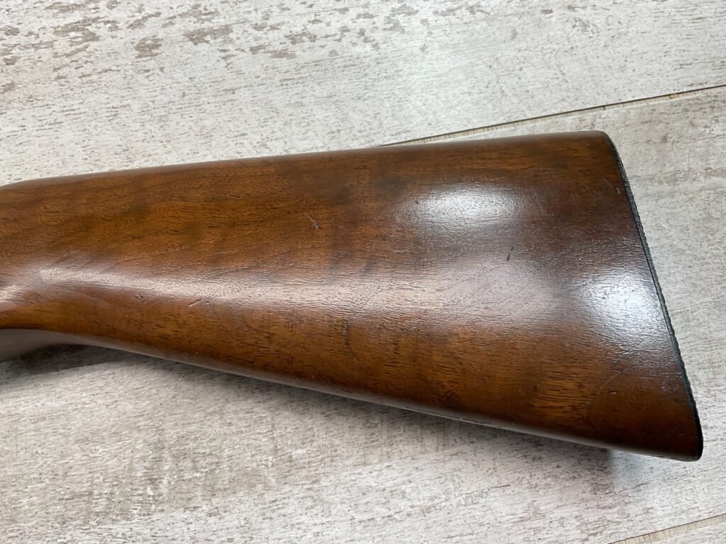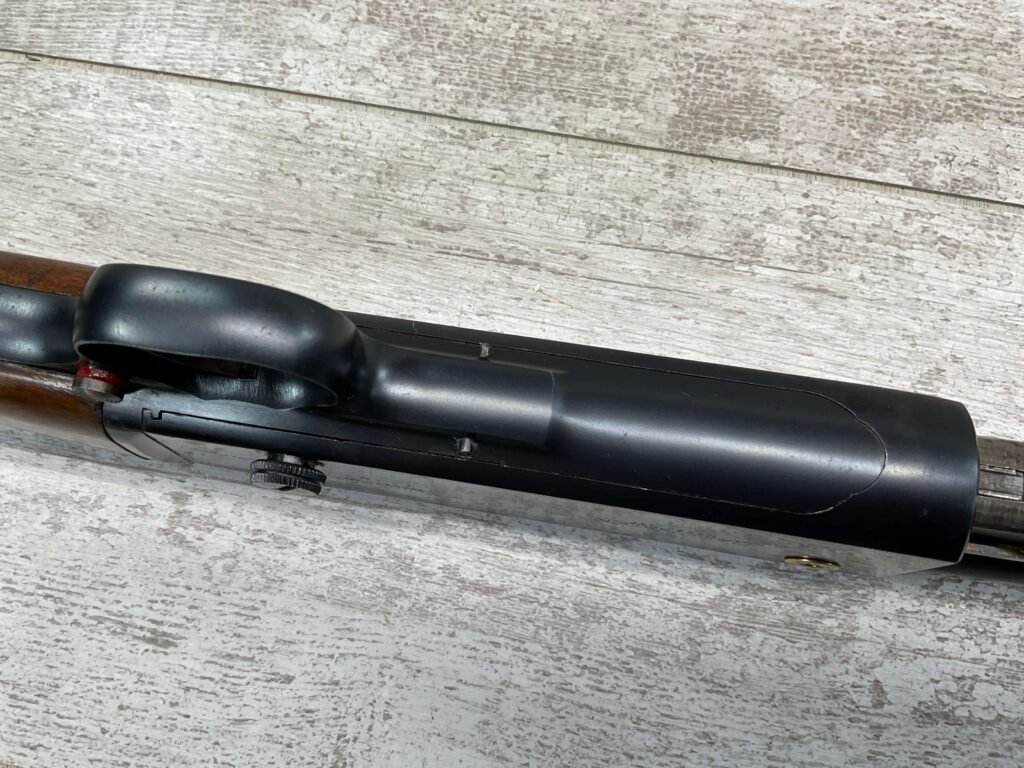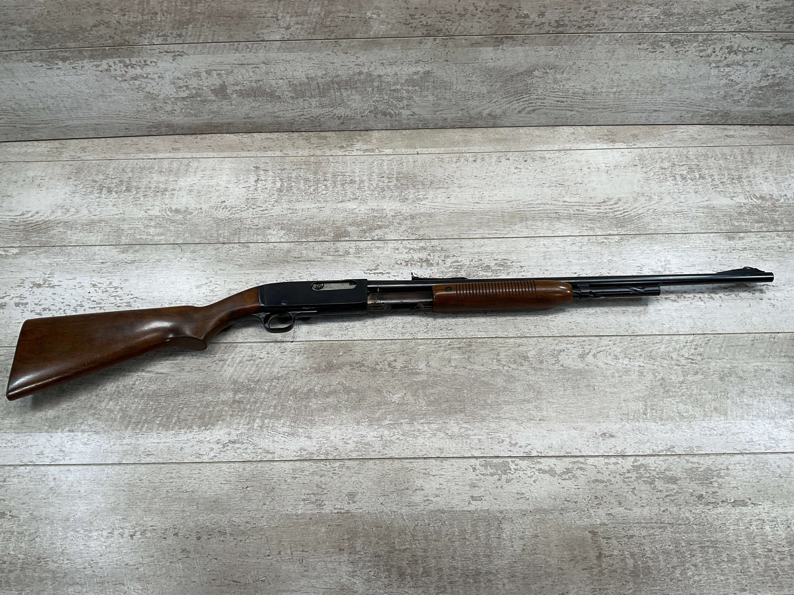 REMINGTON MODEL 141 .32 REM PUMP RIFLE #71464, 1949 MFR, TAKEDOWN MODEL, 24″ BARREL, EXC BORE & RIFLING, VG-EXC ORIGINAL DEEP BLUE FINISH W/SOME AREAS OF LIGHT FRECKLING, EXC AMERICAN WALNUT STOCK W/LIGHT DINGS & NICKS FROM USE/AGE, .32 REM SHELL CASING EMBEDDED ON LEFT SIDE OF RECEIVER, ADJ REAR SIGHT, FIXED FRONT SIGHT, REMINGTON PLASTIC BUTT PAD, RIFLE OPERATES & CYCLES SMOOTHLY, 95% OVERALL