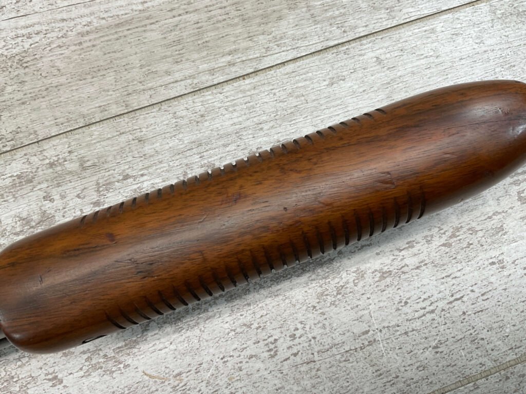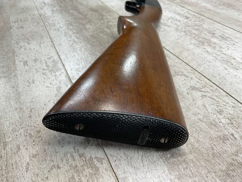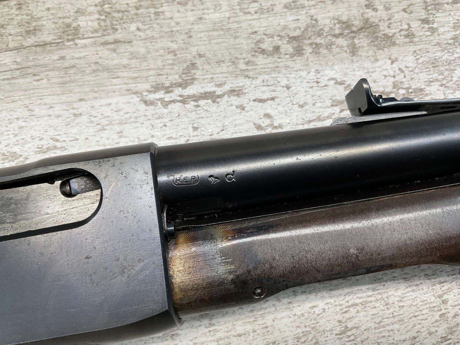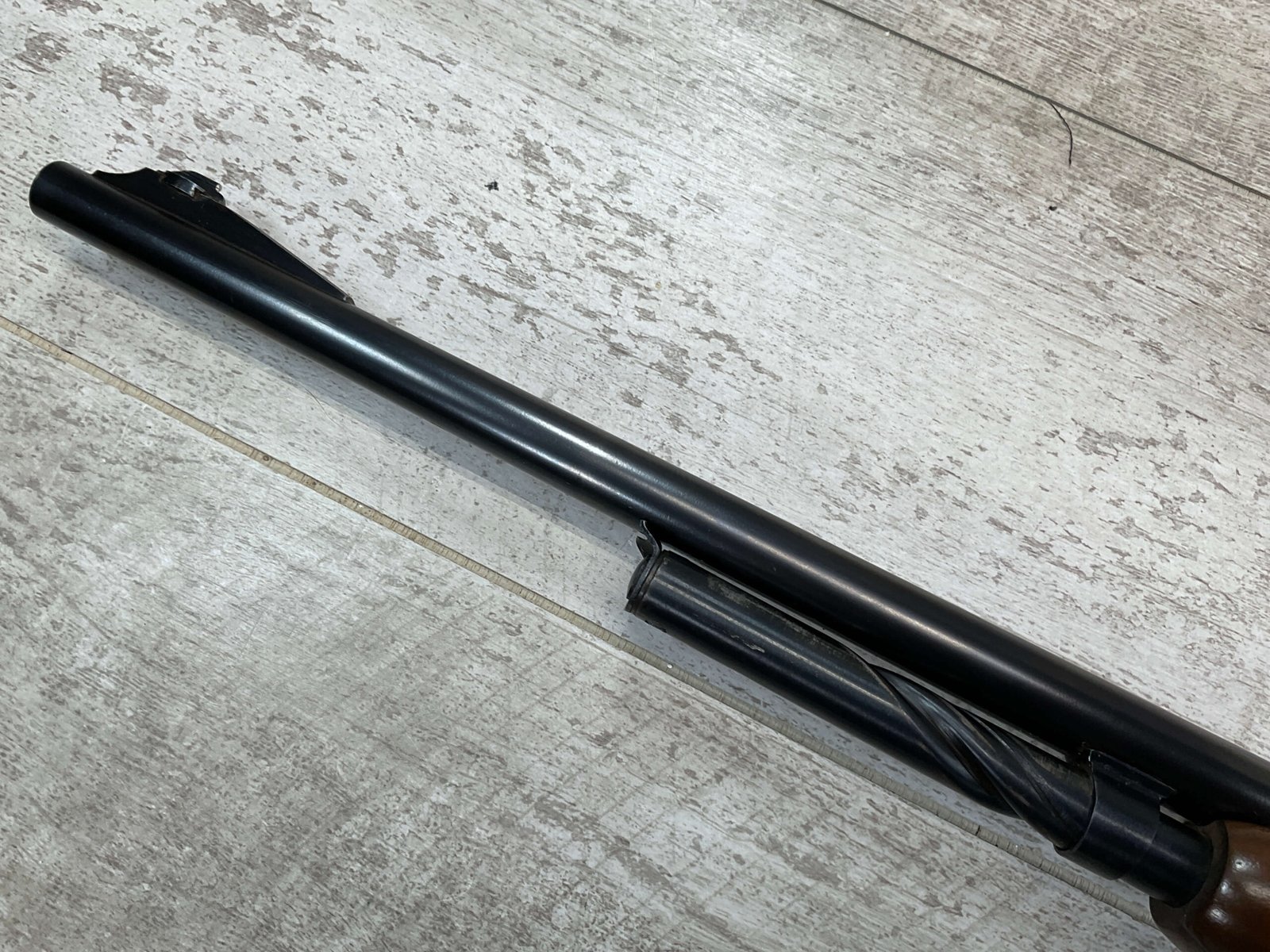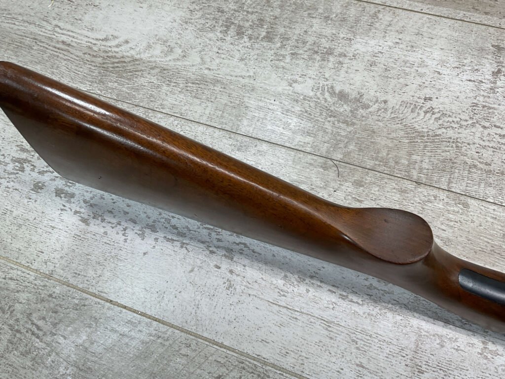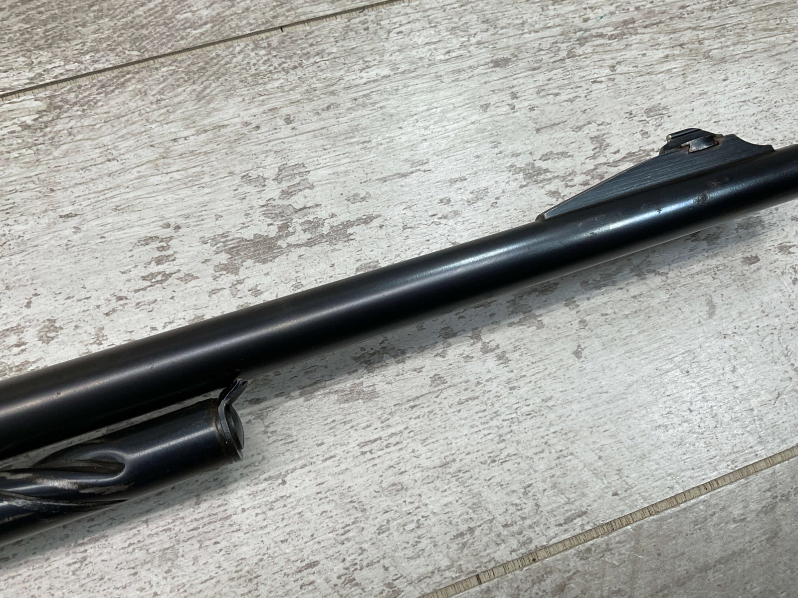 REMINGTON MODEL 141 .32 REM PUMP RIFLE #71464, 1949 MFR, TAKEDOWN MODEL, 24″ BARREL, EXC BORE & RIFLING, VG-EXC ORIGINAL DEEP BLUE FINISH W/SOME AREAS OF LIGHT FRECKLING, EXC AMERICAN WALNUT STOCK W/LIGHT DINGS & NICKS FROM USE/AGE, .32 REM SHELL CASING EMBEDDED ON LEFT SIDE OF RECEIVER, ADJ REAR SIGHT, FIXED FRONT SIGHT, REMINGTON PLASTIC BUTT PAD, RIFLE OPERATES & CYCLES SMOOTHLY, 95% OVERALL