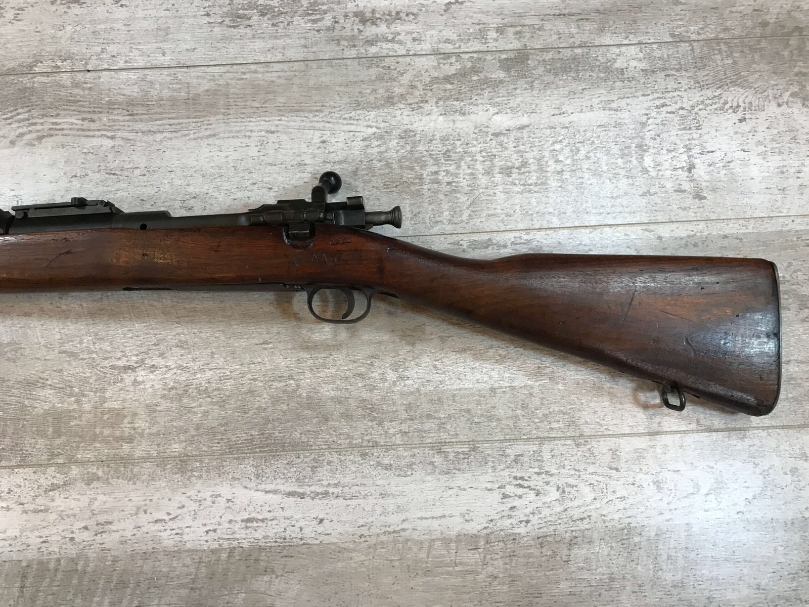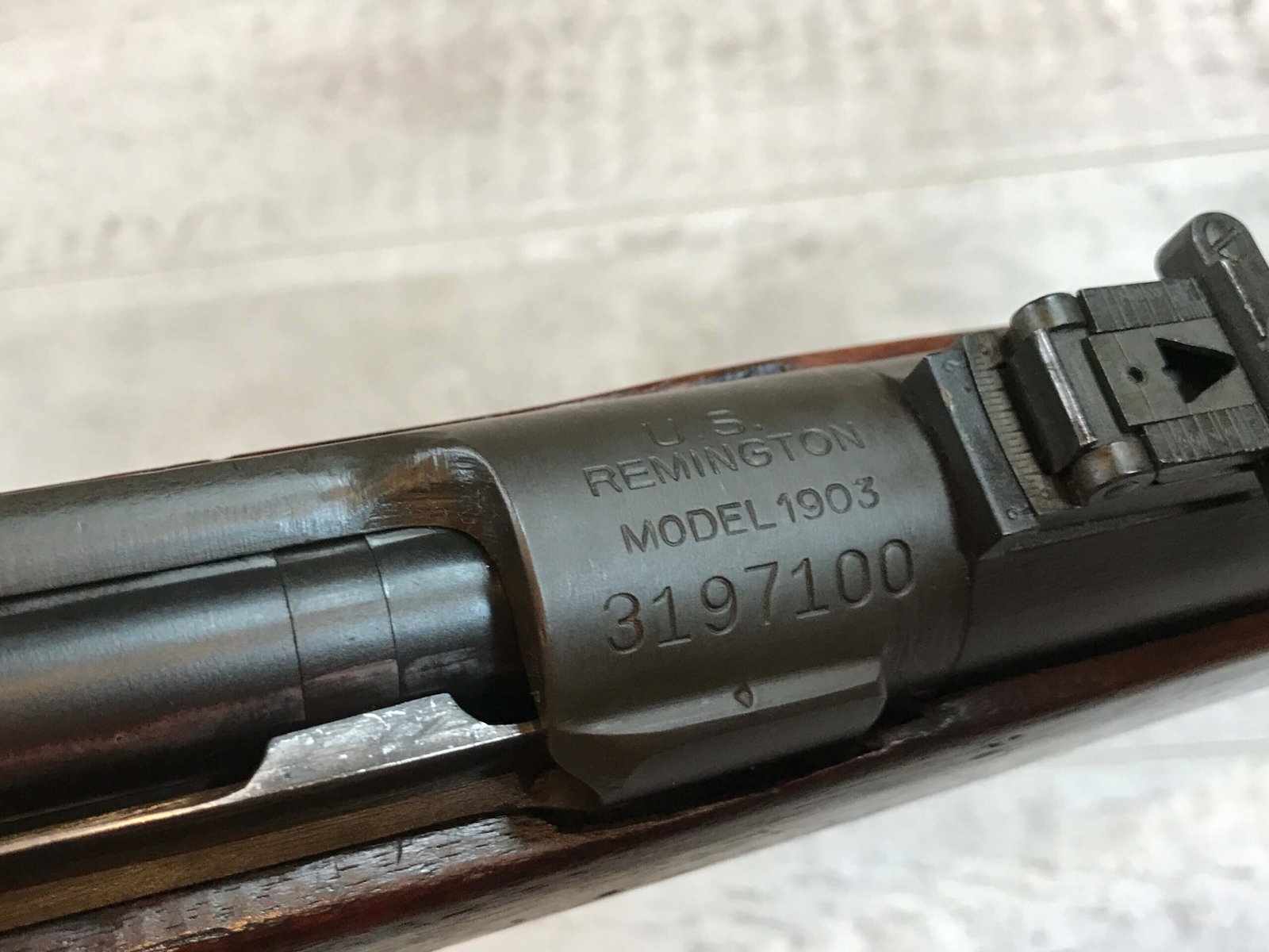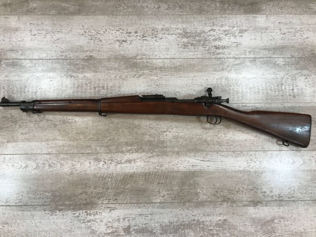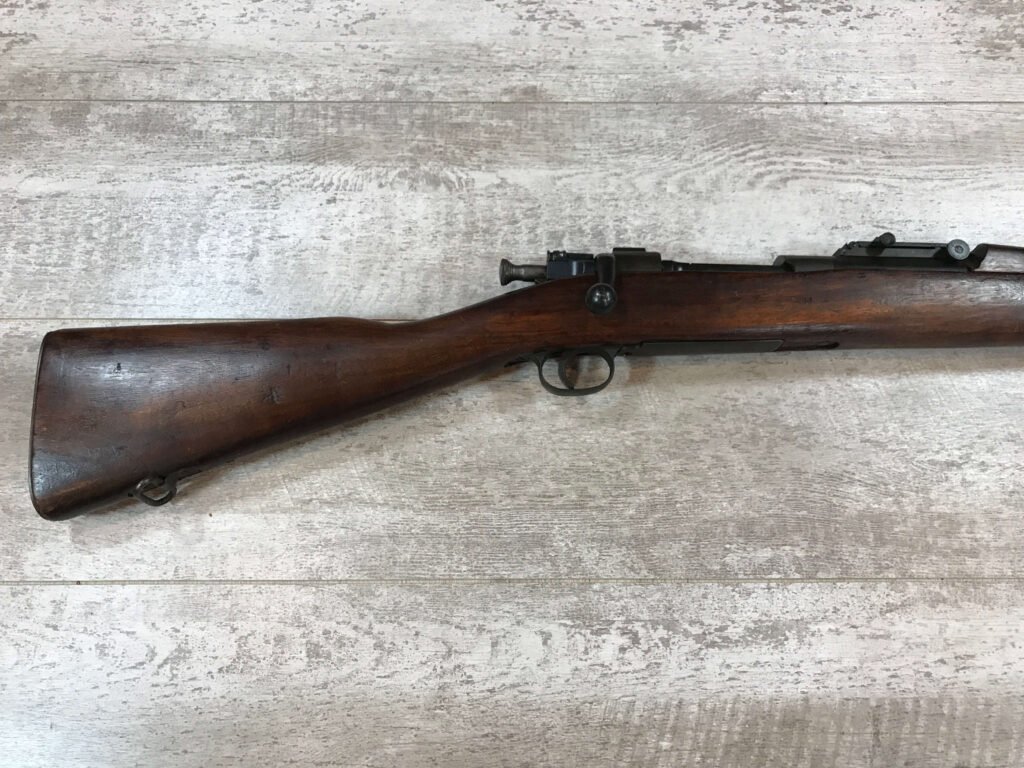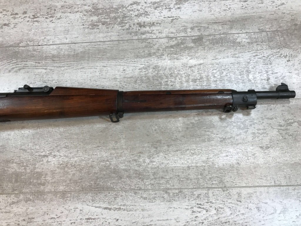SKU#271 REMINGTON M1903 30-06 BOLT ACTION RIFLE 7-42 MFR, #3197100, BARREL MARKED RA/FLAMING BOMB/7-42, CIRCLE P BEHIND TRIGGER GUARD “M” IN FRONT OF REAR SLING SWIVEL, VG C-STOCK WITH NORMAL DINGS AND SCRATCHED, “AAP”, “RA-P” AND “FJA”, MARKED WALNUT STOCK, “NS” MARKED BOLT ACQUIRED EITHER DURING THE “RA-P” OR AAP” ARSENAL VISIT, LIGHTLY FROSTED BORE 7.5/10, STRONG RIFLING, ME- 0, 92% OVERALL