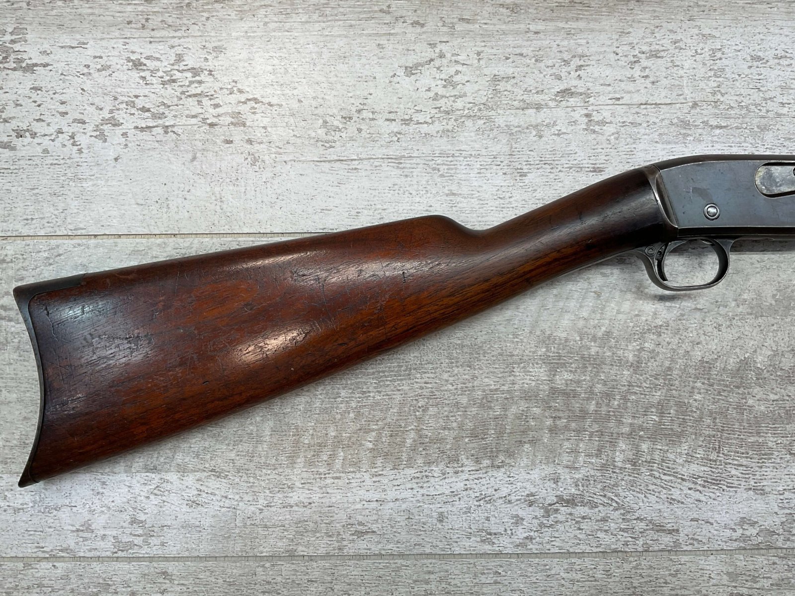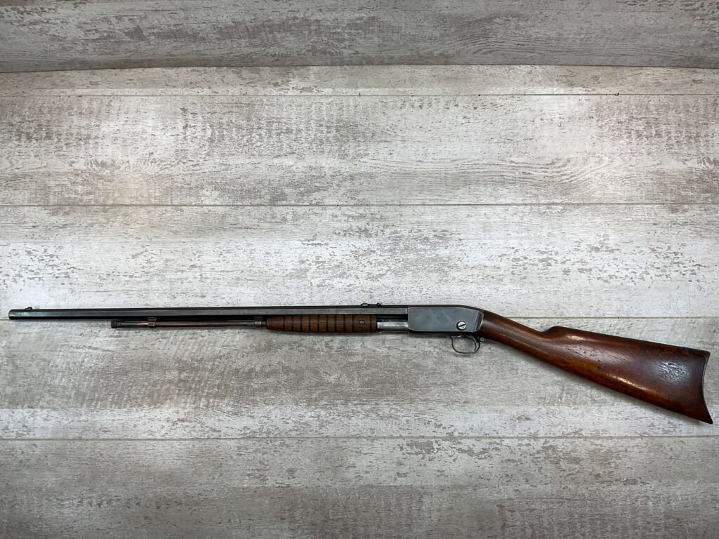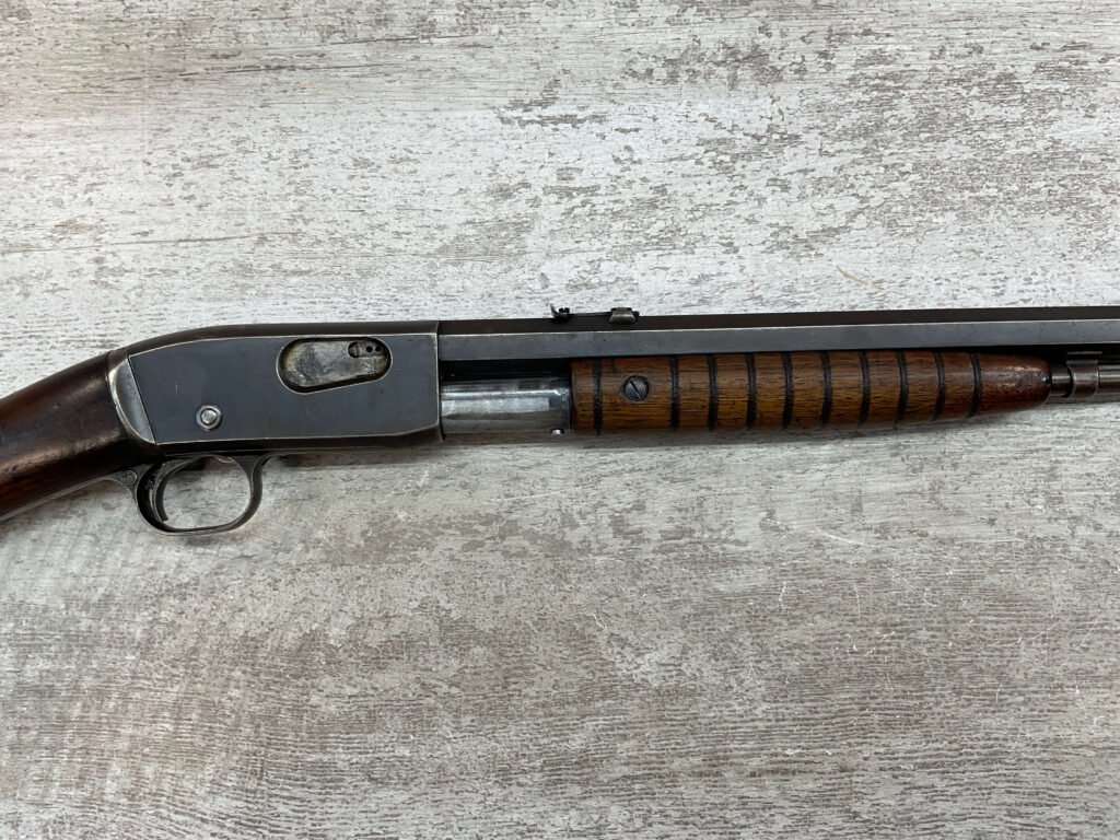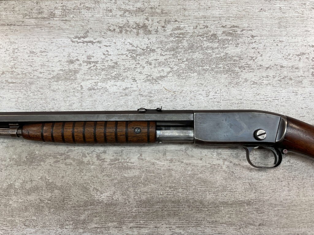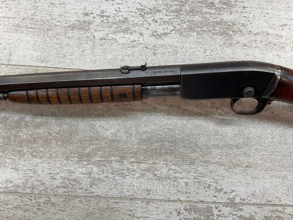REMINGTON MODEL 12 .22 REM SPECIAL (.22WRF) SLIDE ACTION RIFLE #RW 222601, 1913 MFR, 24″ OCTAGON BARREL, HAMMERLESS, OPEN SIGHTS, VG WALNUT STRAIGHT GRIP STOCK, TUBE MAGAZINE, CRESCENT METAL BUTT PLATE, SMOOTH ACTION, FAIR BORE W/GOOD RIFLING & FROSTING THROUGHOUT, ALL ORIGINAL & RARE .22 REM SPECIAL CALIBER!!