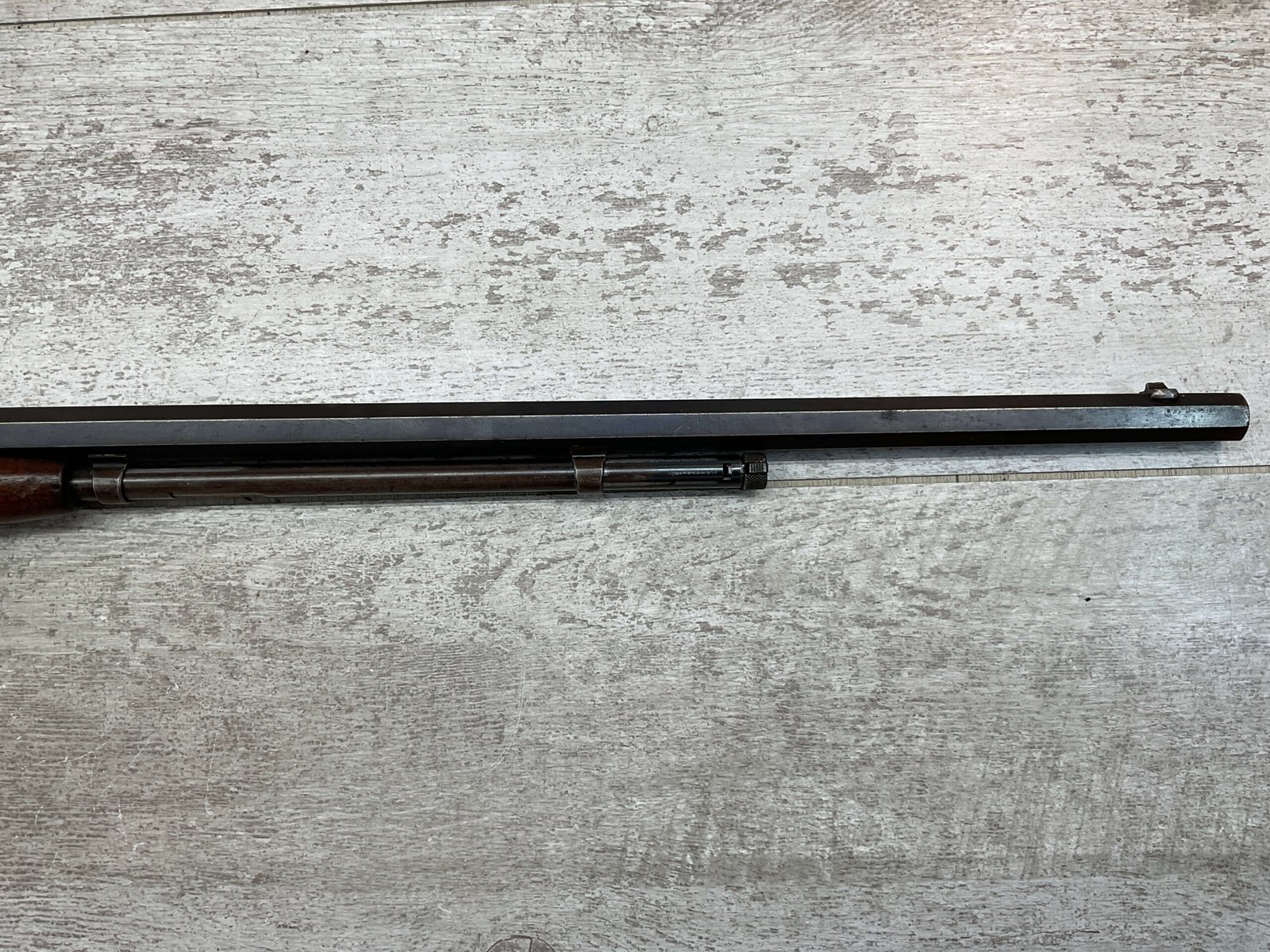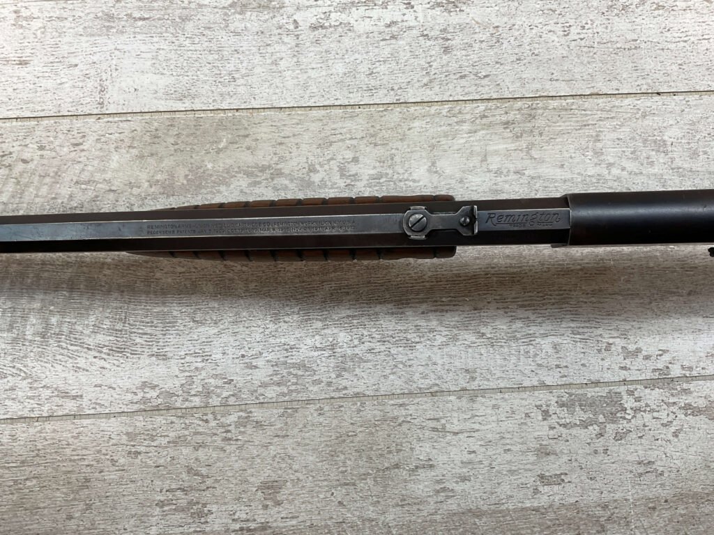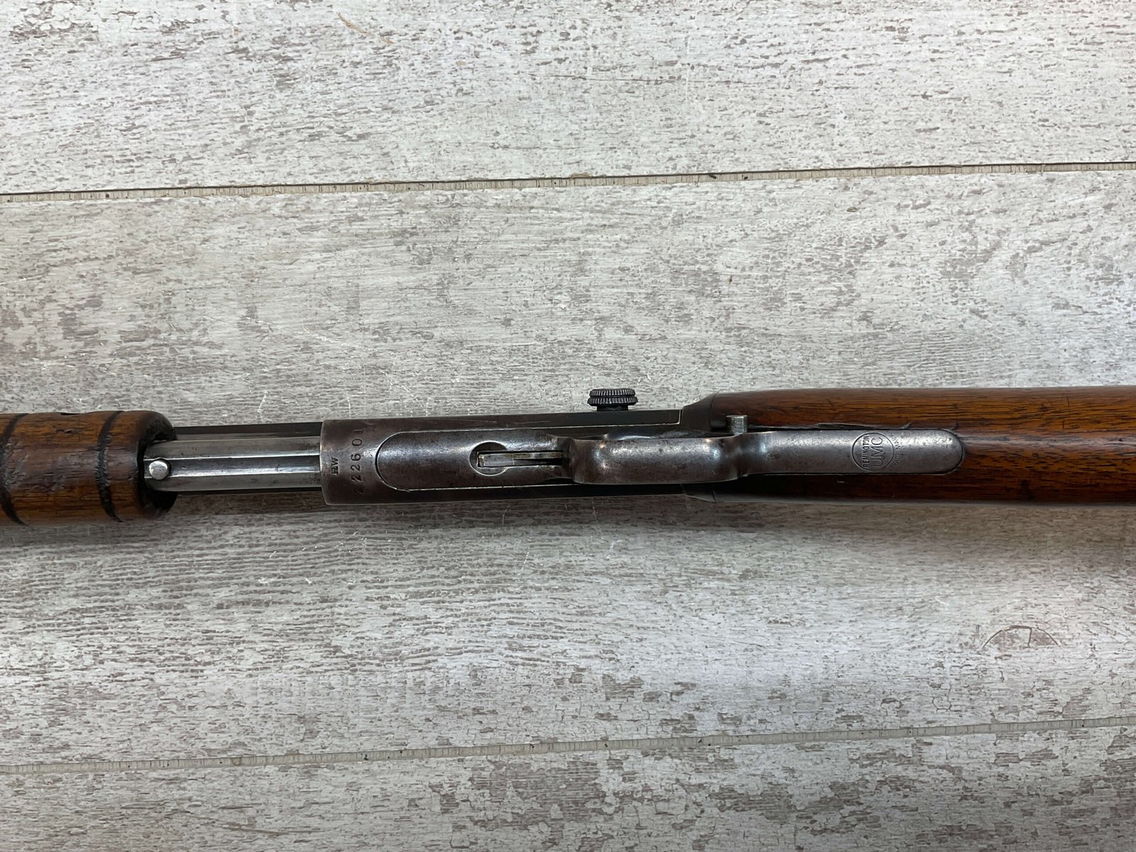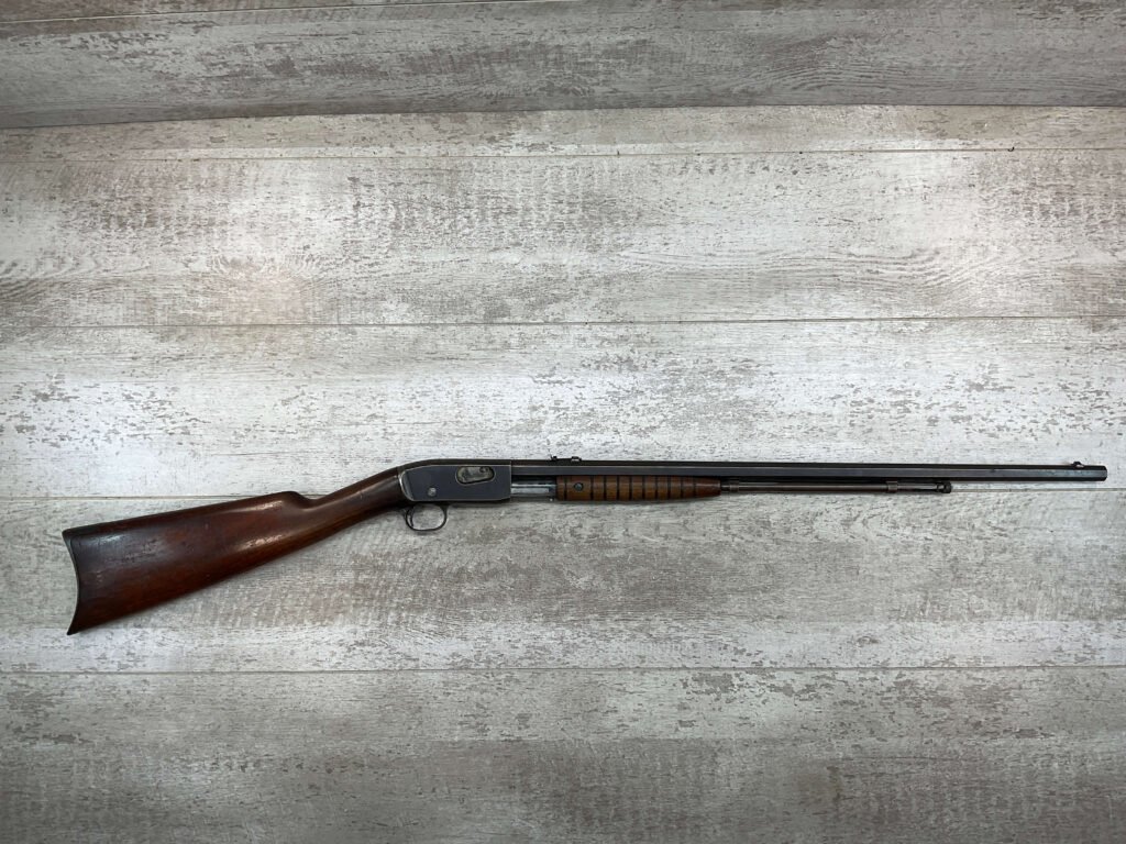 REMINGTON MODEL 12 .22 REM SPECIAL (.22WRF) SLIDE ACTION RIFLE #RW 222601, 1913 MFR, 24″ OCTAGON BARREL, HAMMERLESS, OPEN SIGHTS, VG WALNUT STRAIGHT GRIP STOCK, TUBE MAGAZINE, CRESCENT METAL BUTT PLATE, SMOOTH ACTION, FAIR BORE W/GOOD RIFLING & FROSTING THROUGHOUT, ALL ORIGINAL & RARE .22 REM SPECIAL CALIBER!!