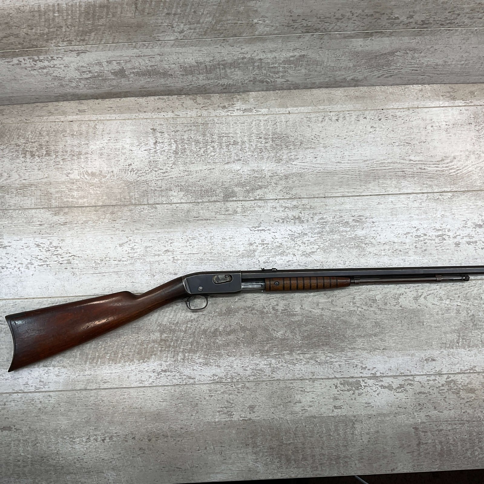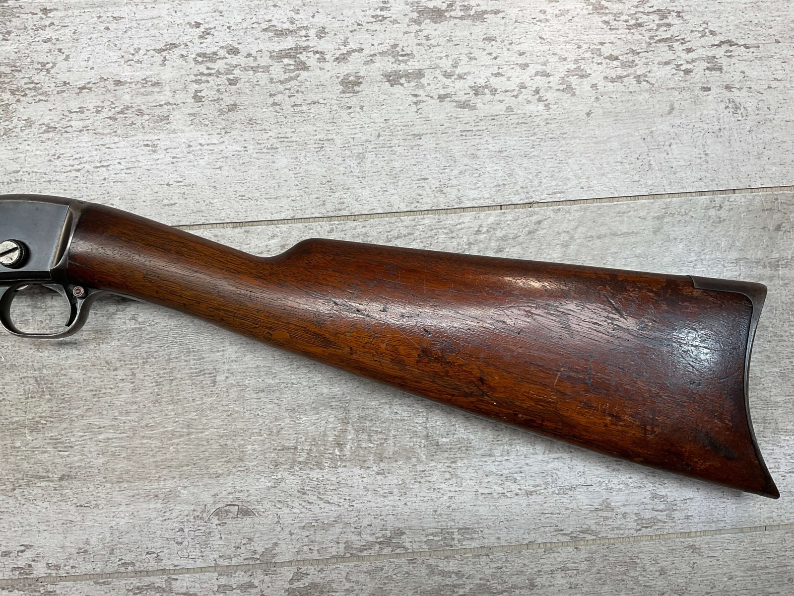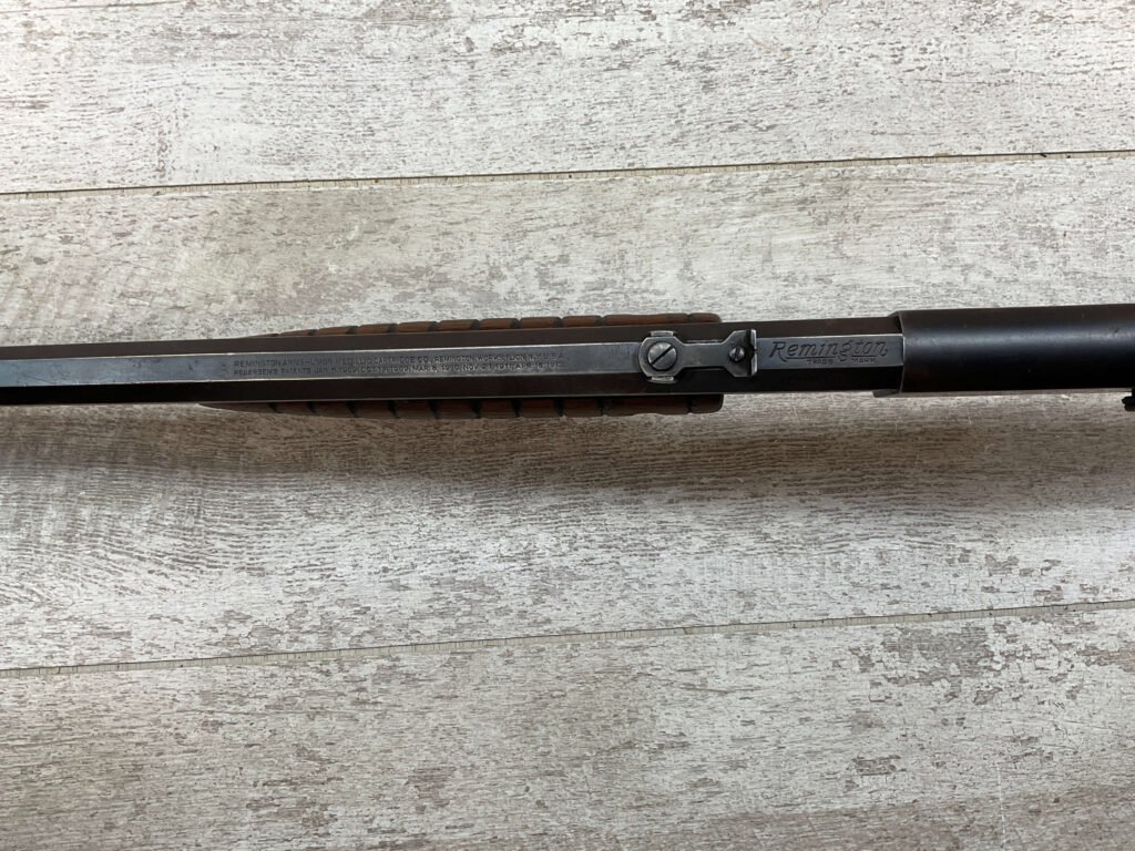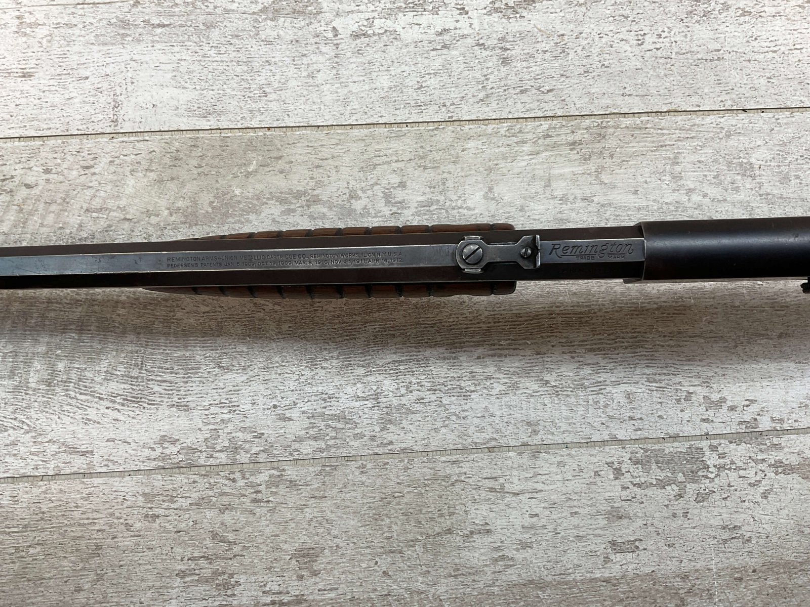 REMINGTON MODEL 12 .22 REM SPECIAL (.22WRF) SLIDE ACTION RIFLE #RW 222601, 1913 MFR, 24″ OCTAGON BARREL, HAMMERLESS, OPEN SIGHTS, VG WALNUT STRAIGHT GRIP STOCK, TUBE MAGAZINE, CRESCENT METAL BUTT PLATE, SMOOTH ACTION, FAIR BORE W/GOOD RIFLING & FROSTING THROUGHOUT, ALL ORIGINAL & RARE .22 REM SPECIAL CALIBER!!