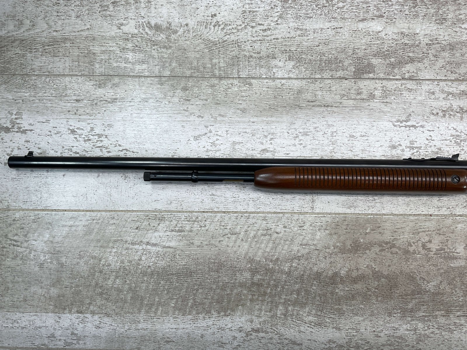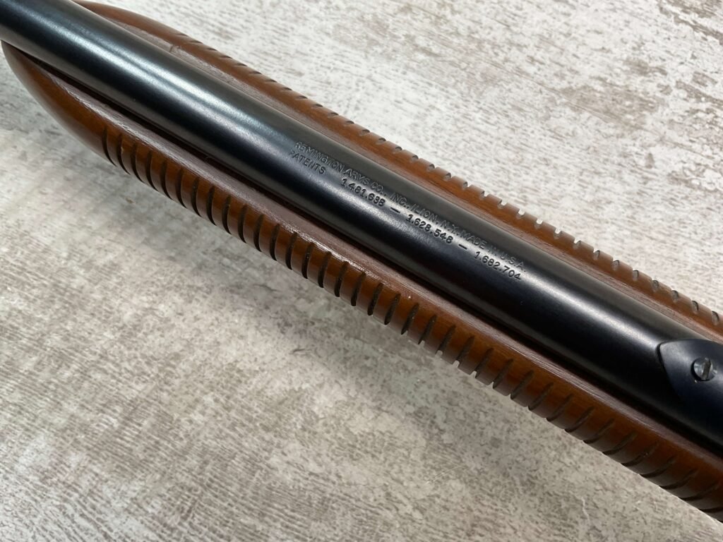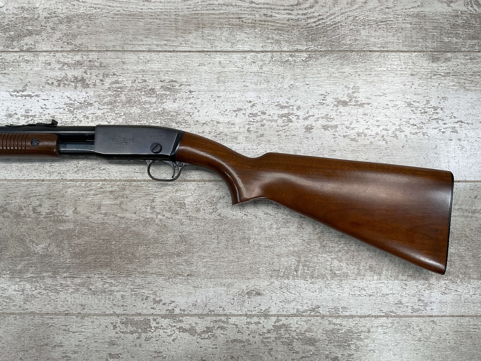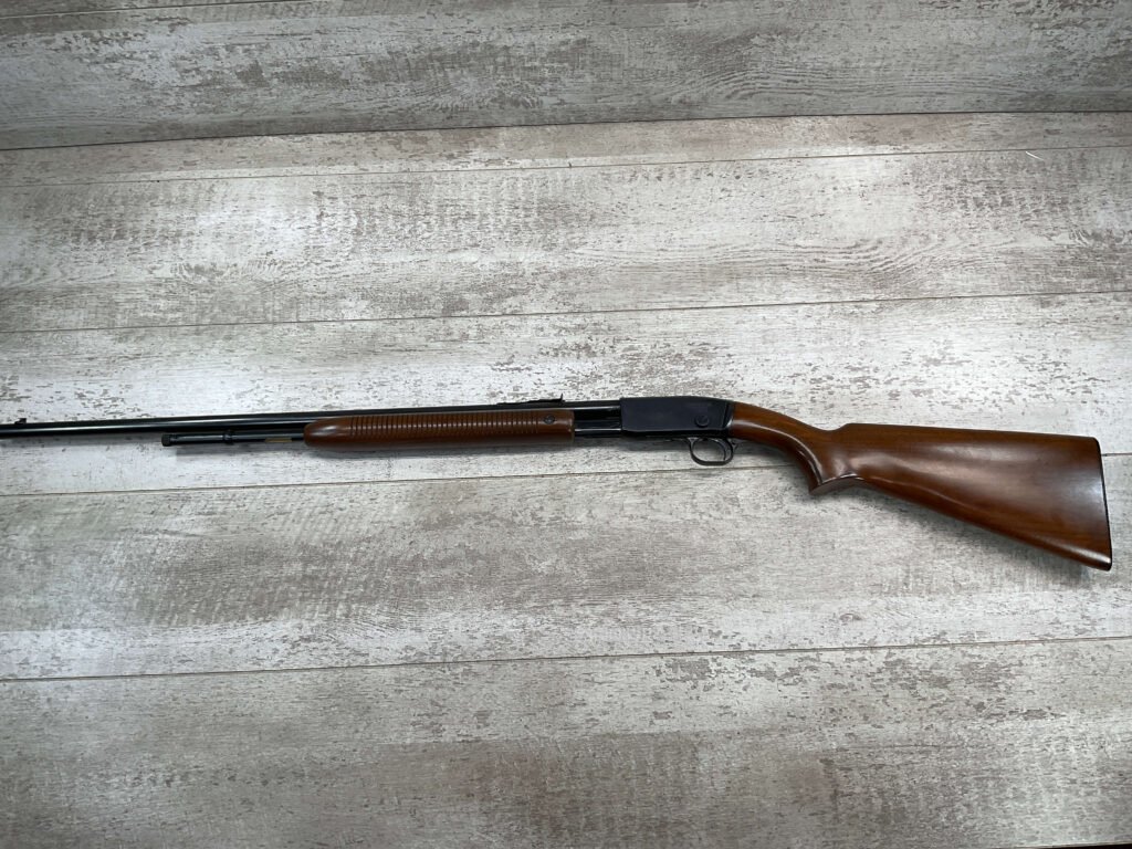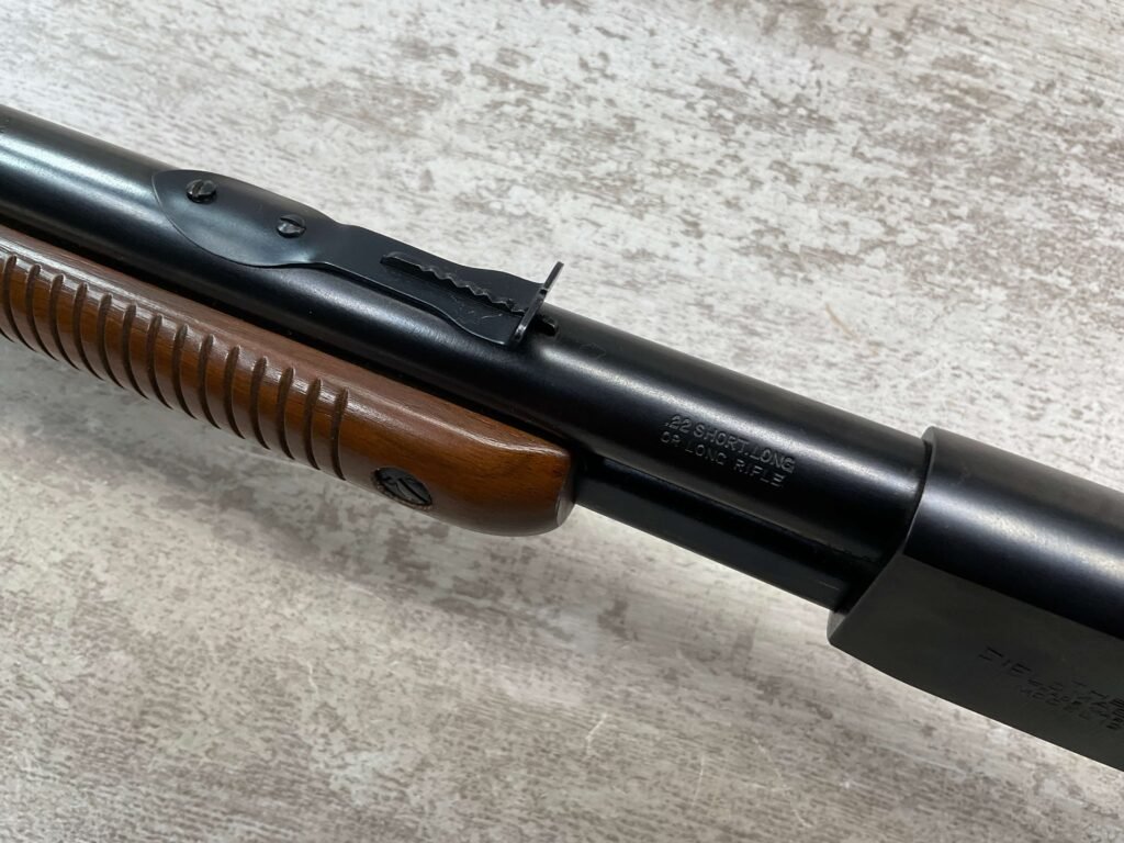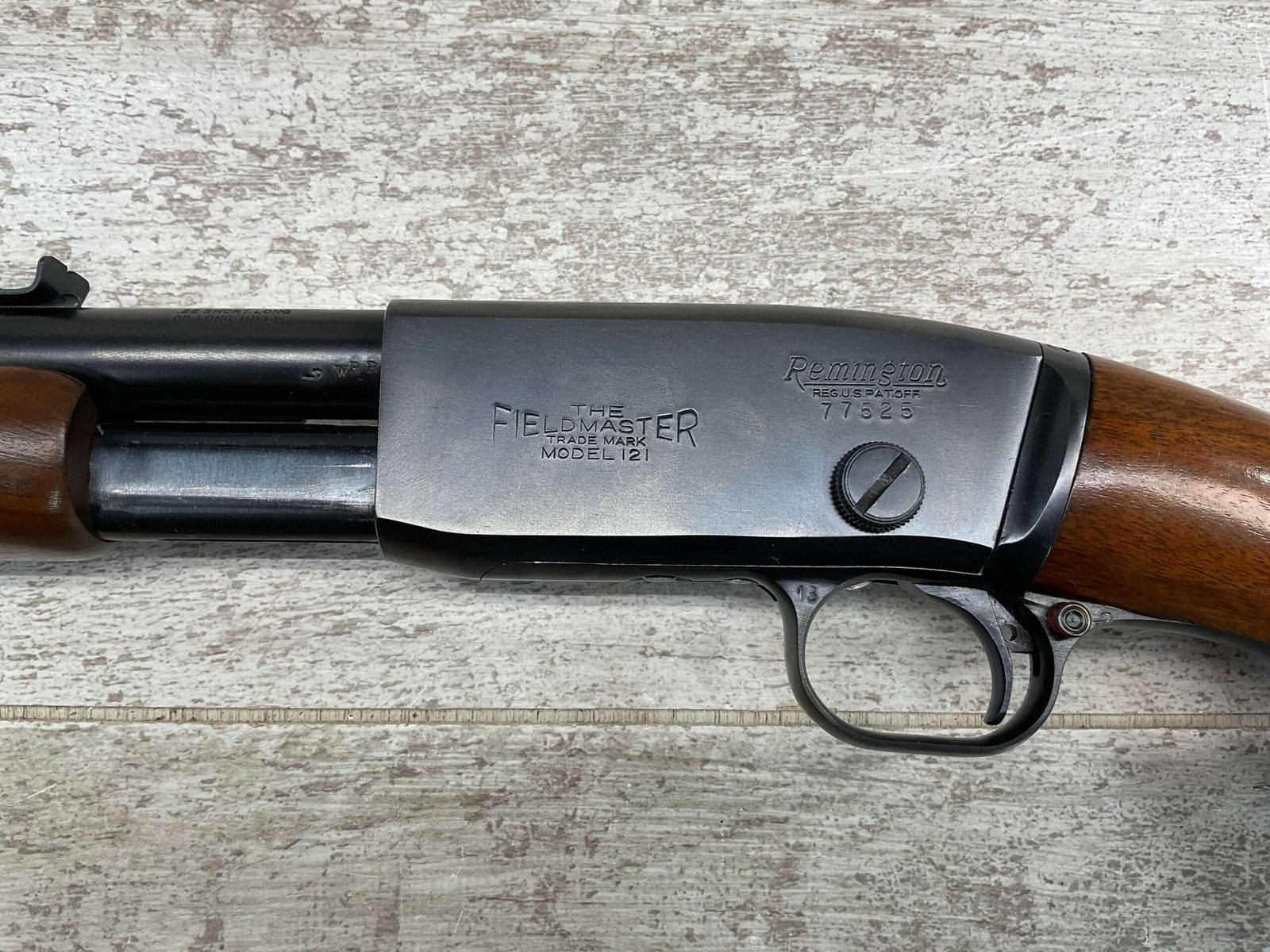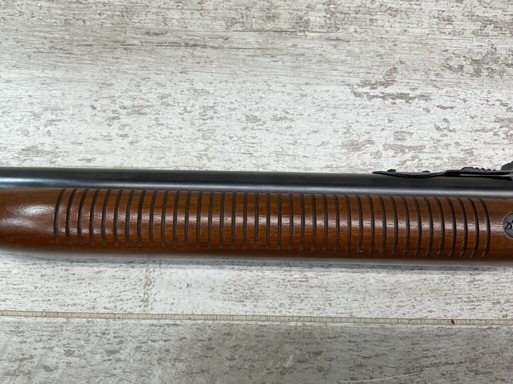 REMINGTON MODEL 121 FIELDMASTER .22LR PUMP RIFLE, MINTY 1946 MFR #77525, 24″ ROUND BARREL, EXC BLUE THROUGHOUT (9.9/10), EXC MIRROR BORE & RIFLING (10/10), FIXED FRONT SIGHT, STEP ADJ REAR SIGHT, EXC WALNUT WOOD W/VIRTUALLY NO HANDLING MARKS, PISTOL GRIP, RIBBED FOREARM, CHECKERED REMINGTON BUTT PLATE, EXCEPTIONAL FIREARM, 98+%