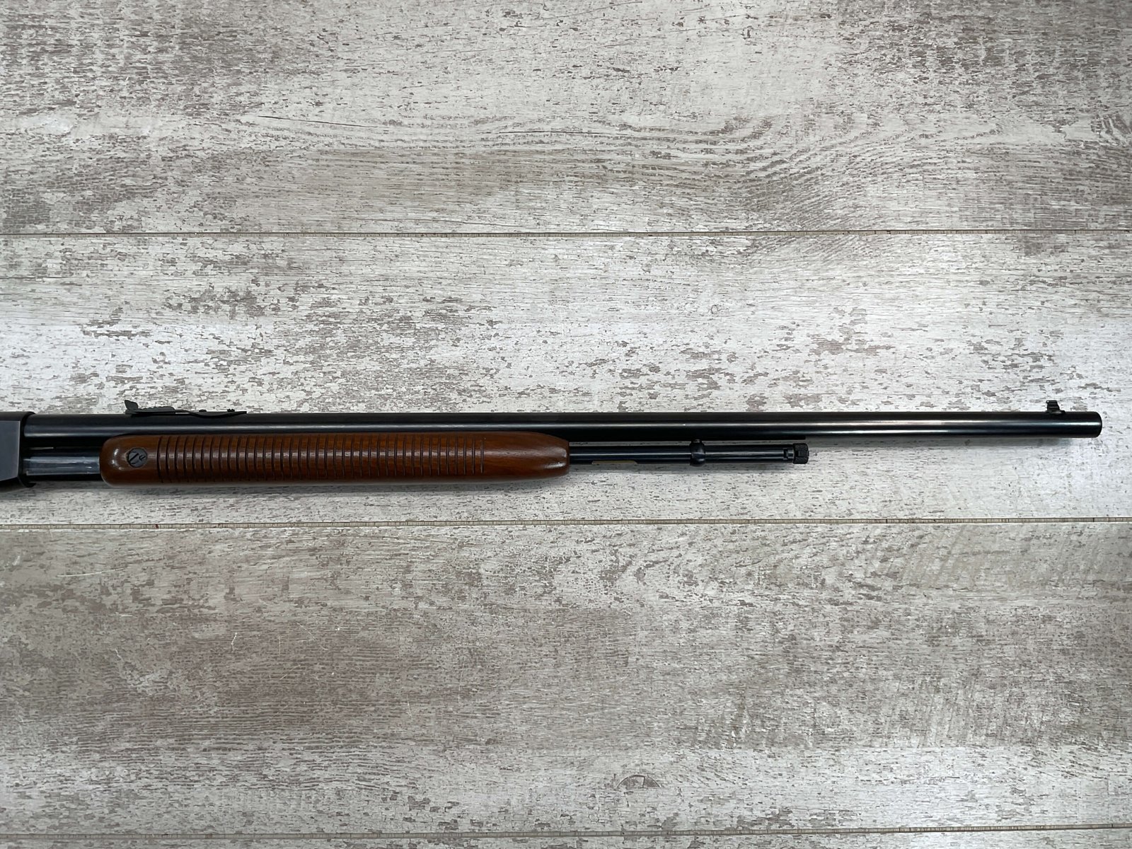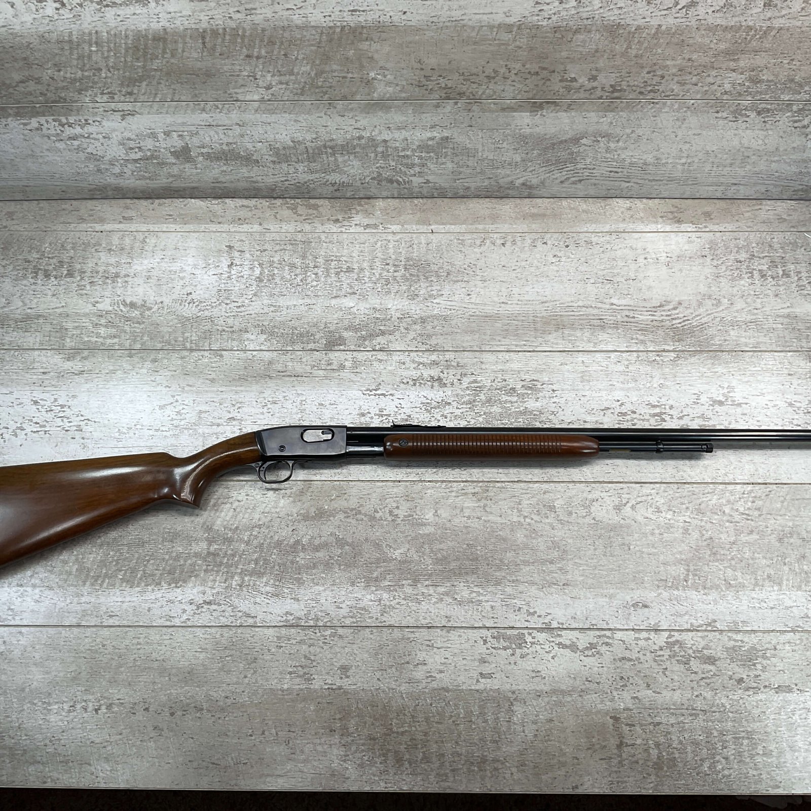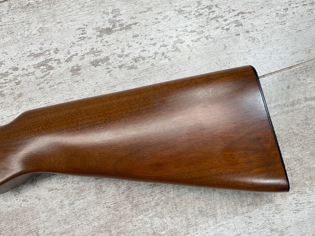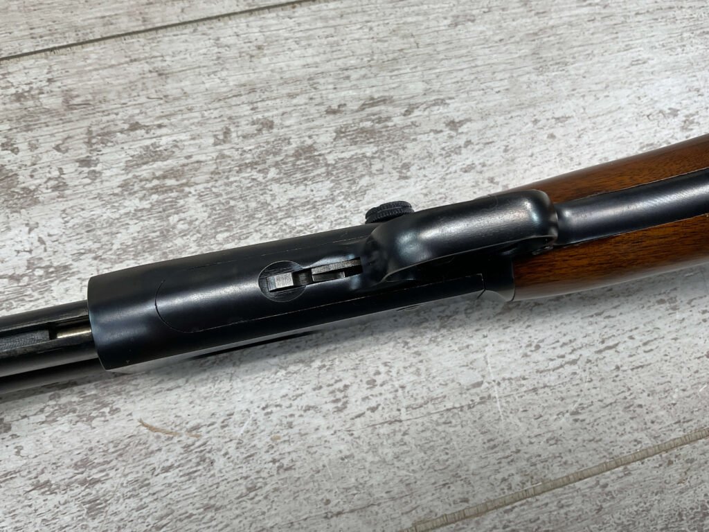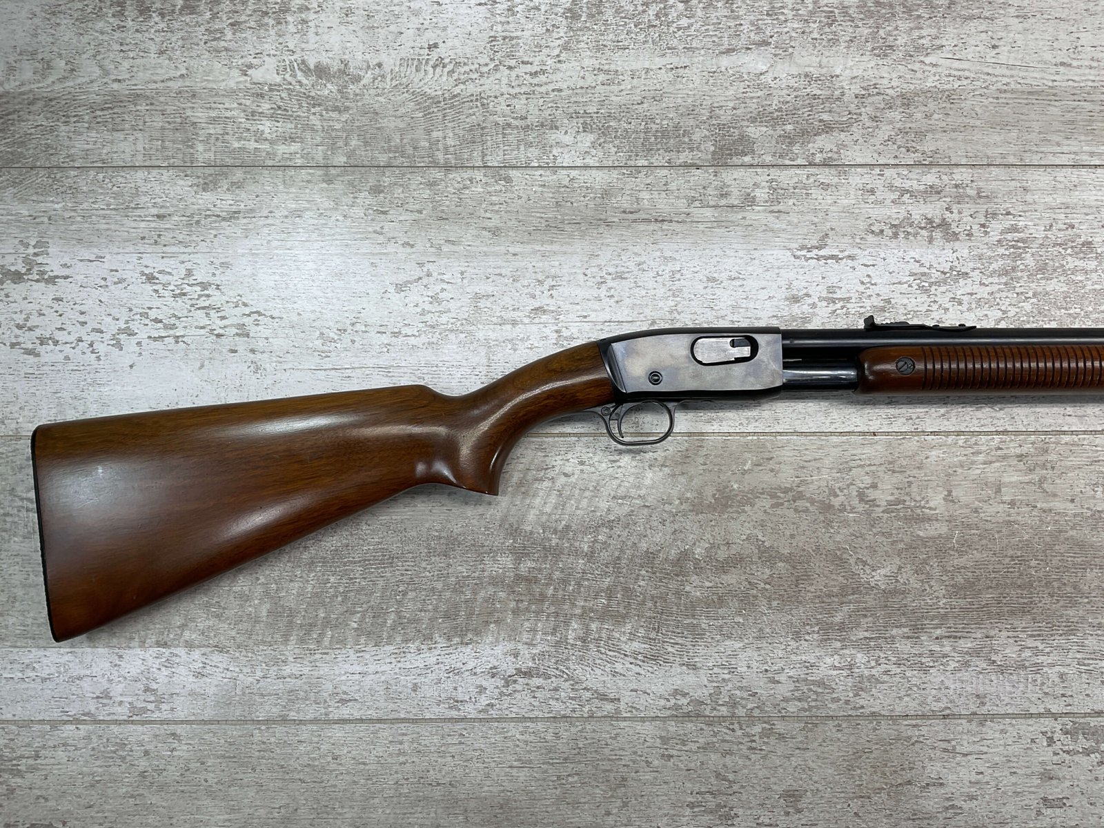 REMINGTON MODEL 121 FIELDMASTER .22LR PUMP RIFLE, MINTY 1946 MFR #77525, 24″ ROUND BARREL, EXC BLUE THROUGHOUT (9.9/10), EXC MIRROR BORE & RIFLING (10/10), FIXED FRONT SIGHT, STEP ADJ REAR SIGHT, EXC WALNUT WOOD W/VIRTUALLY NO HANDLING MARKS, PISTOL GRIP, RIBBED FOREARM, CHECKERED REMINGTON BUTT PLATE, EXCEPTIONAL FIREARM, 98+%