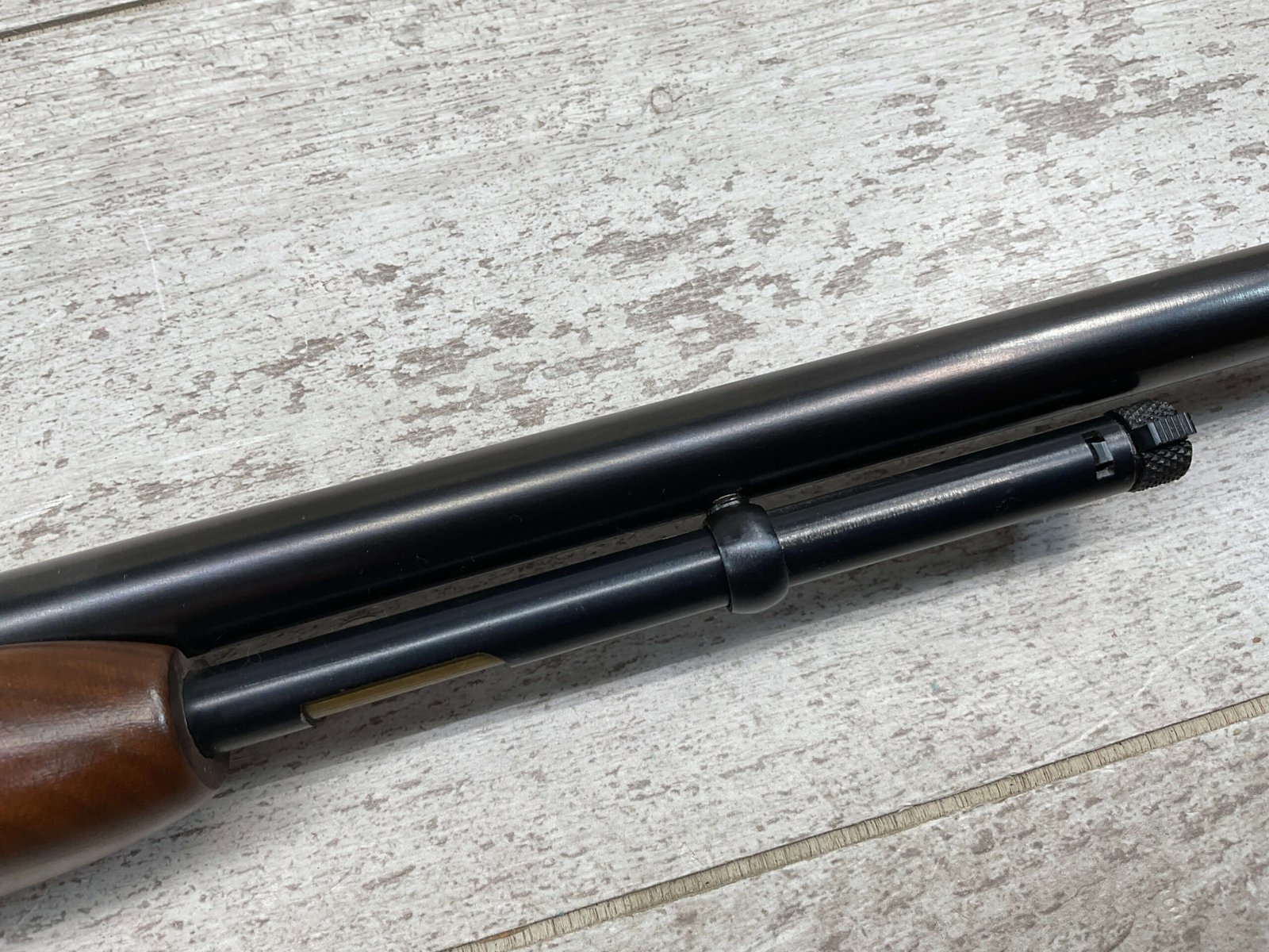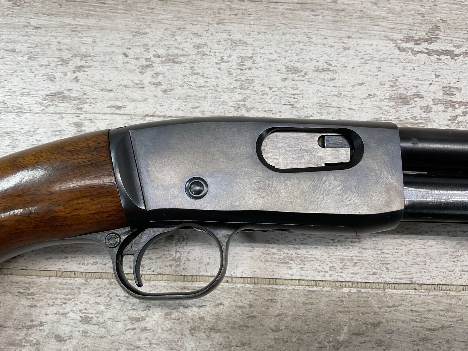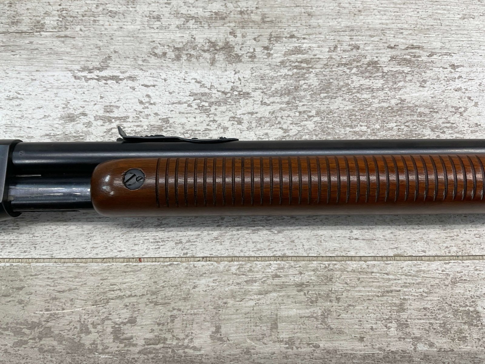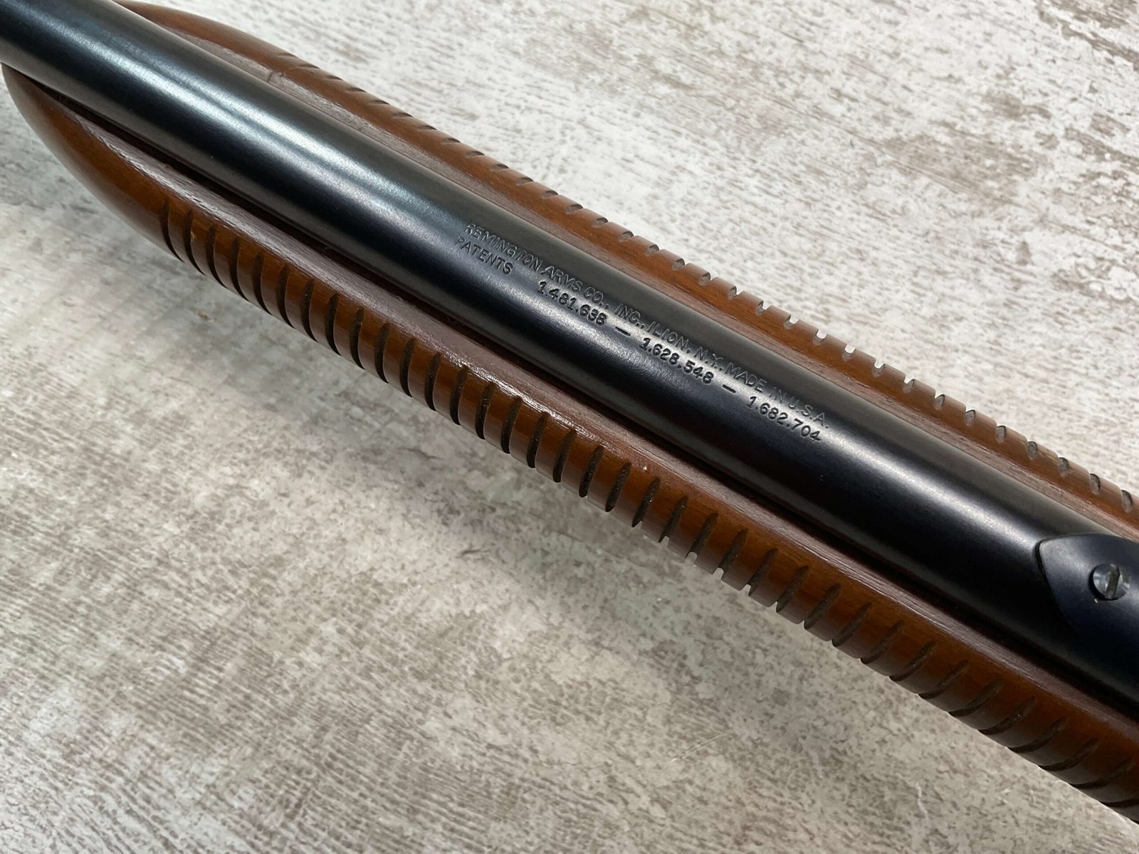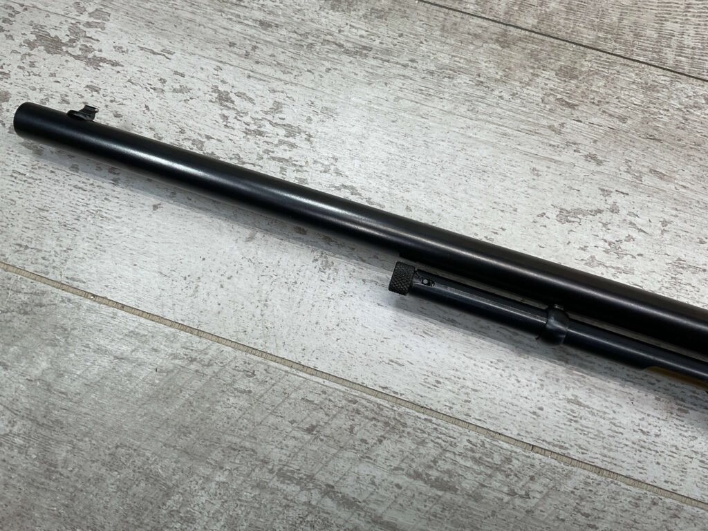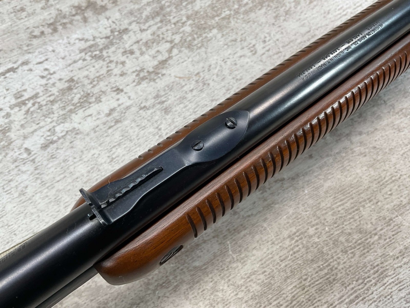 REMINGTON MODEL 121 FIELDMASTER .22LR PUMP RIFLE, MINTY 1946 MFR #77525, 24″ ROUND BARREL, EXC BLUE THROUGHOUT (9.9/10), EXC MIRROR BORE & RIFLING (10/10), FIXED FRONT SIGHT, STEP ADJ REAR SIGHT, EXC WALNUT WOOD W/VIRTUALLY NO HANDLING MARKS, PISTOL GRIP, RIBBED FOREARM, CHECKERED REMINGTON BUTT PLATE, EXCEPTIONAL FIREARM, 98+%
