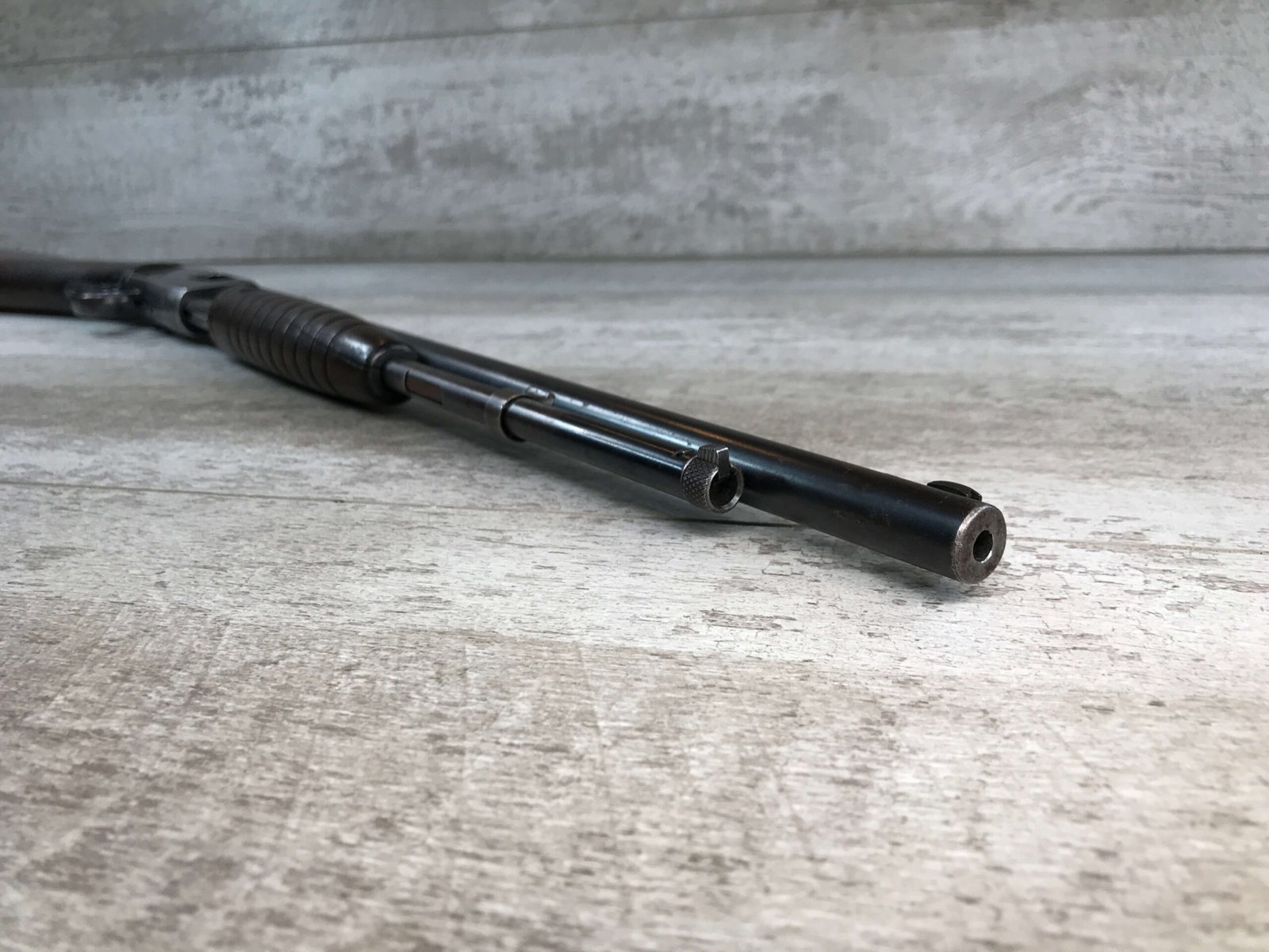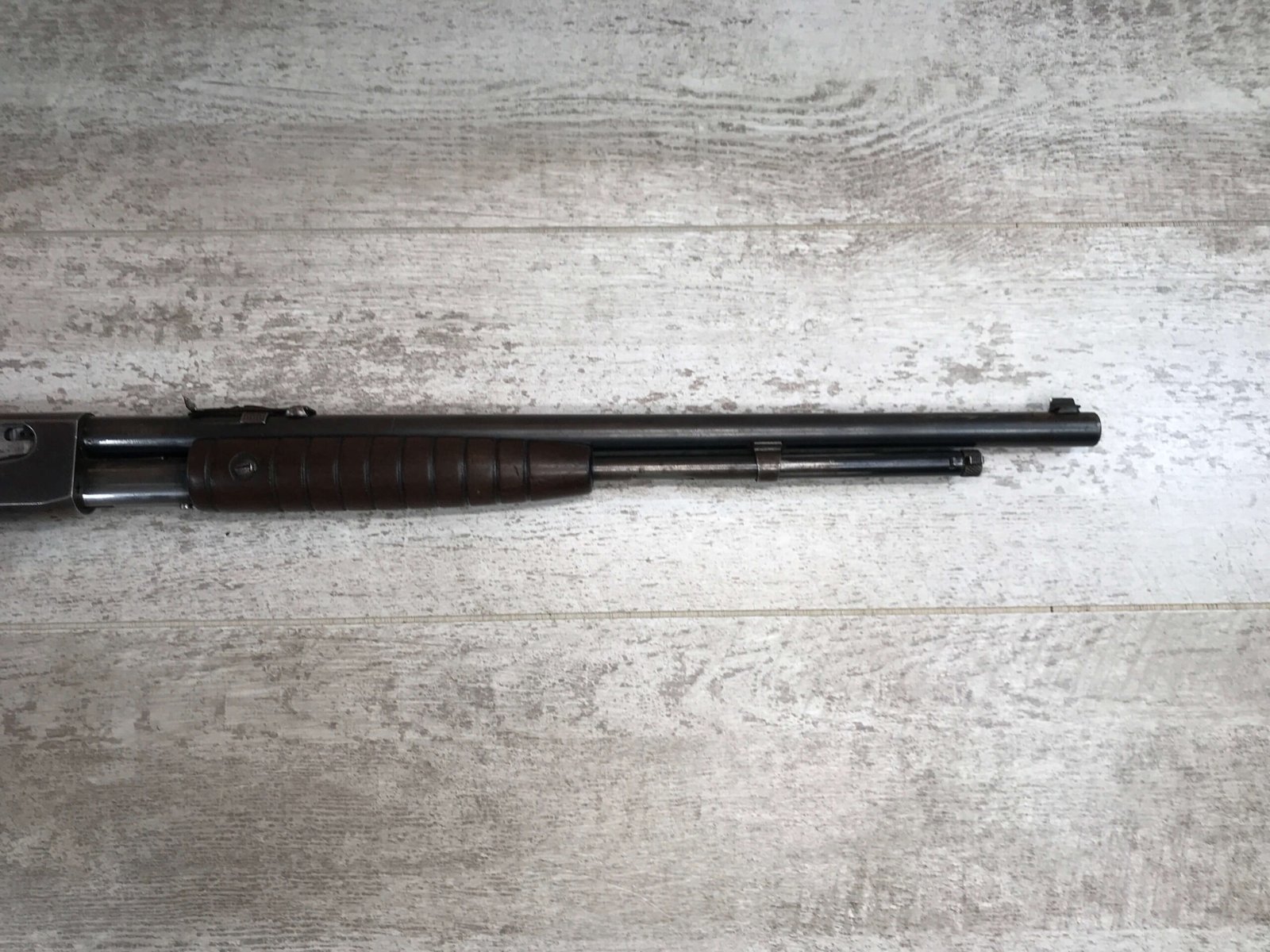 SKU#332 REMINGTON MODEL 12A .22 S/L/LR PUMP RIFLE #470242 MAGAZINE FEED TUBE, PUMP ACTION, BRASS BUTT PLATE, EXC WOOD, LIGHT RUST ON OCTAGON BARREL, SMOOTH ACTION, “CUSTOM” FLASH SUPRESSOR (THREADED BARREL), VG OVERALL CONDITION, 80%