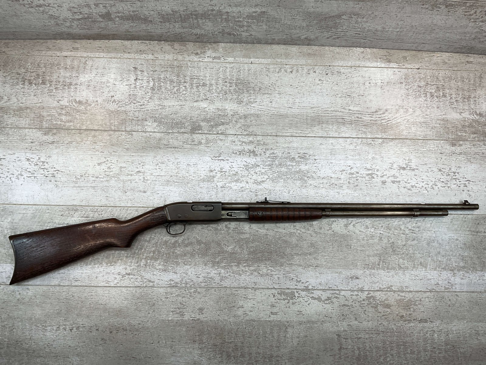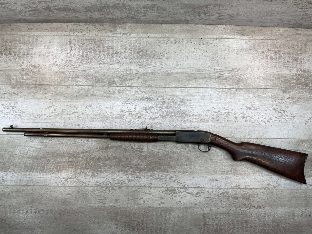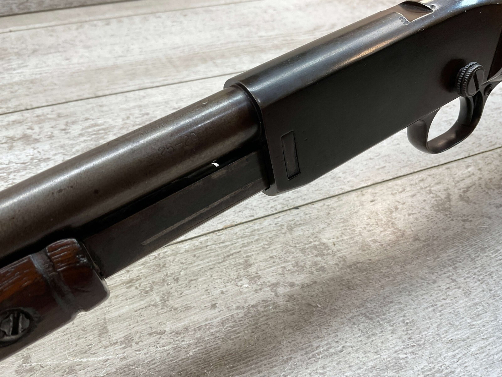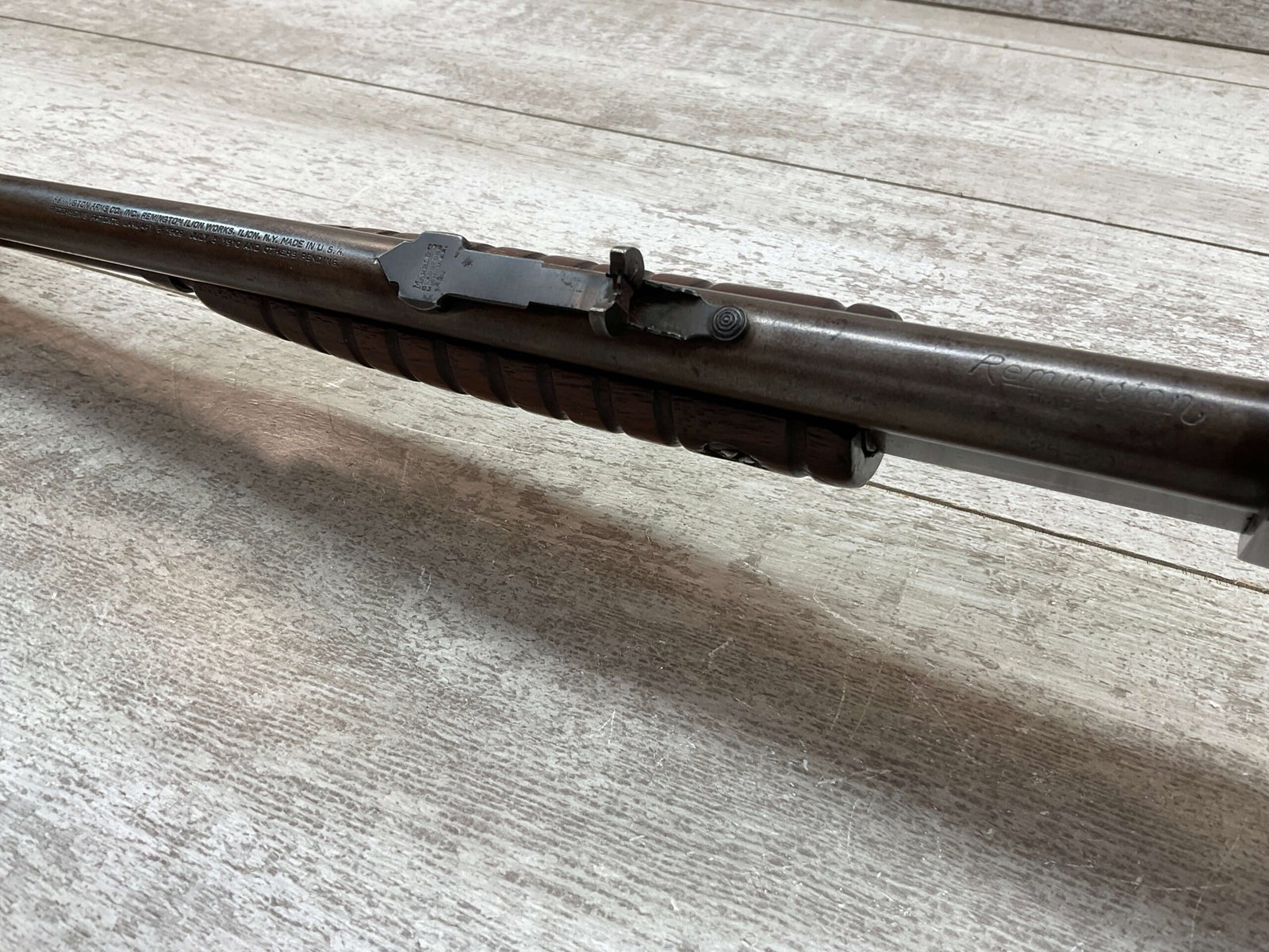 REMINGTON MODEL 25 .25-20 WCF PUMP ACTION RIFLE #AA 1912, OCT 1928 MFR, MAJORITY OF BLUE HAS TURNED GREY/BROWN PATINA, GOOD BORE W/LIGHT FROSTING IN AREAS, GOOD WOOD W/DINGS/NICKS FROM AGE/USE, TUBE MAGAZINE, MARBLES ADJ REAR SIGHT, BLADE FRONT SIGHT, 80% OVERALL