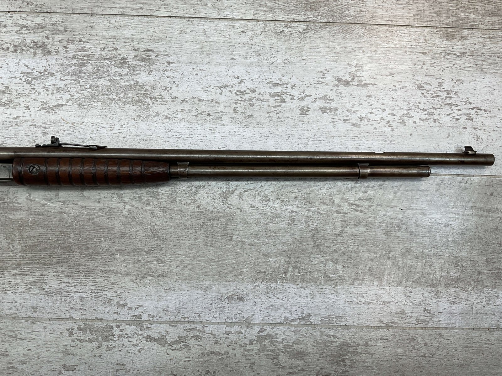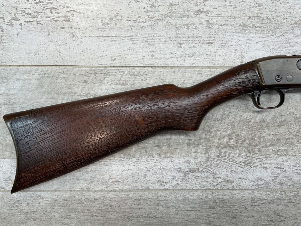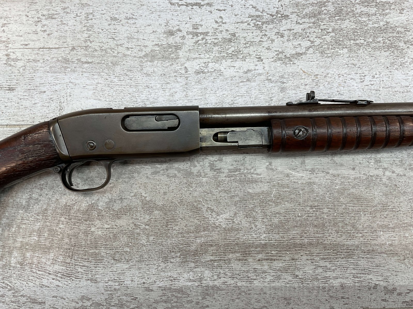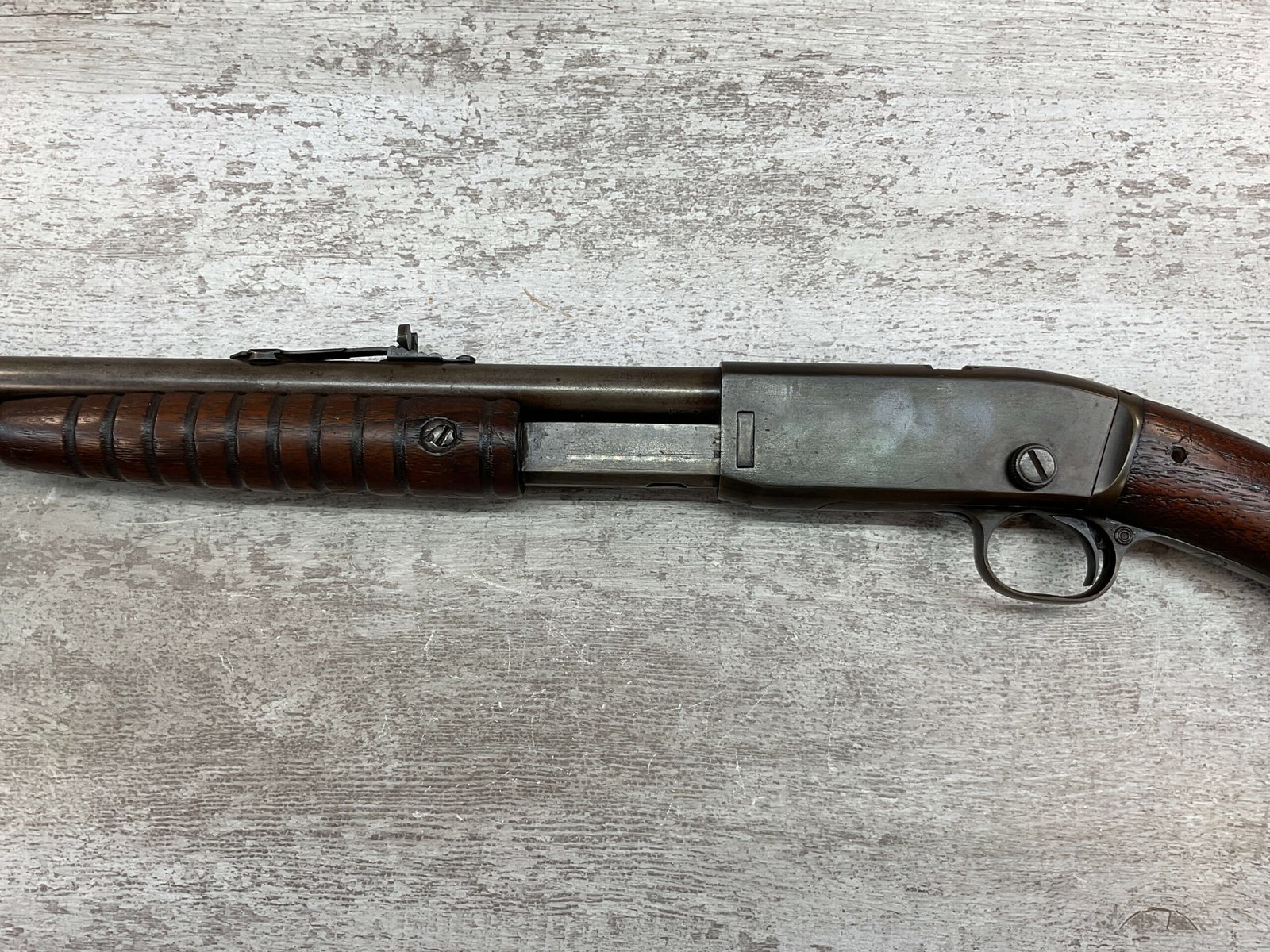 REMINGTON MODEL 25 .25-20 WCF PUMP ACTION RIFLE #AA 1912, OCT 1928 MFR, MAJORITY OF BLUE HAS TURNED GREY/BROWN PATINA, GOOD BORE W/LIGHT FROSTING IN AREAS, GOOD WOOD W/DINGS/NICKS FROM AGE/USE, TUBE MAGAZINE, MARBLES ADJ REAR SIGHT, BLADE FRONT SIGHT, 80% OVERALL