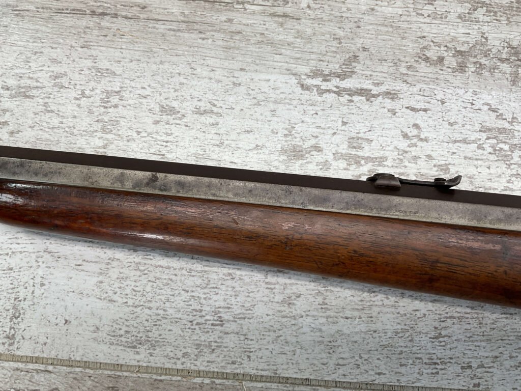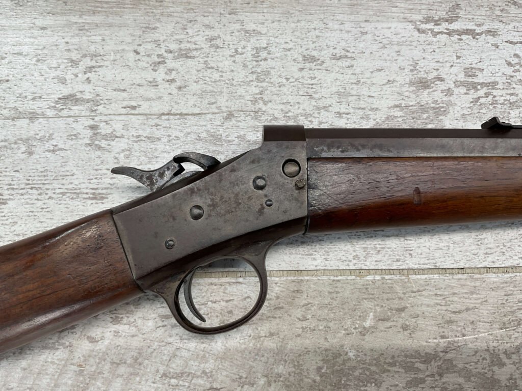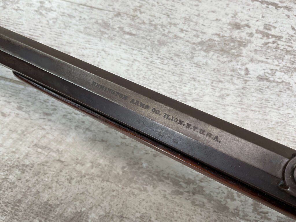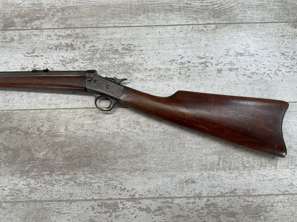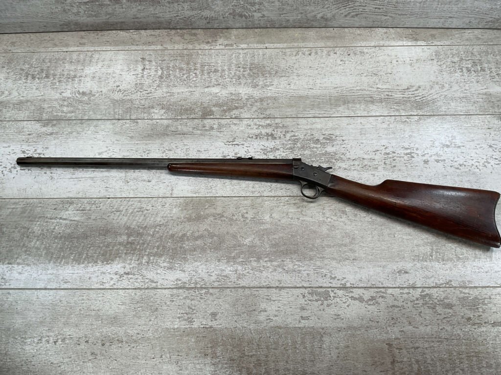 REMINGTON MODEL 4 TAKEDOWN ROLLING BLOCK .22 LR RIFLE #J 249188, 22 1/2″ OCTAGON BARREL,  FROSTED BORE W/WEAK RIFLING, METAL HAS TURNED GREY/BROWN PATINA, WOOD IS APPROPRIATE FOR AGE & USE, SMOOTH ACTION, EXTRACTOR FUNCTIONS, HALF & FULL COCK BOTH HOLD & RELEASE W/TRIGGER,  A REALLY NICE LITTLE RIFLE!!