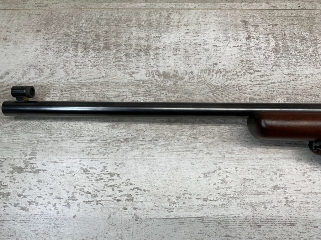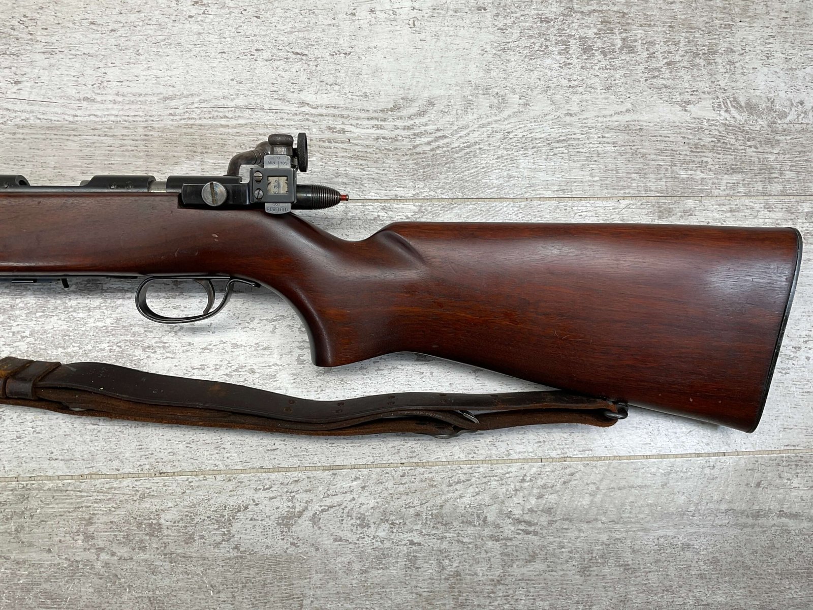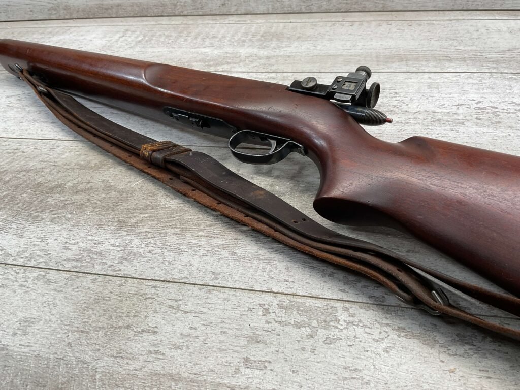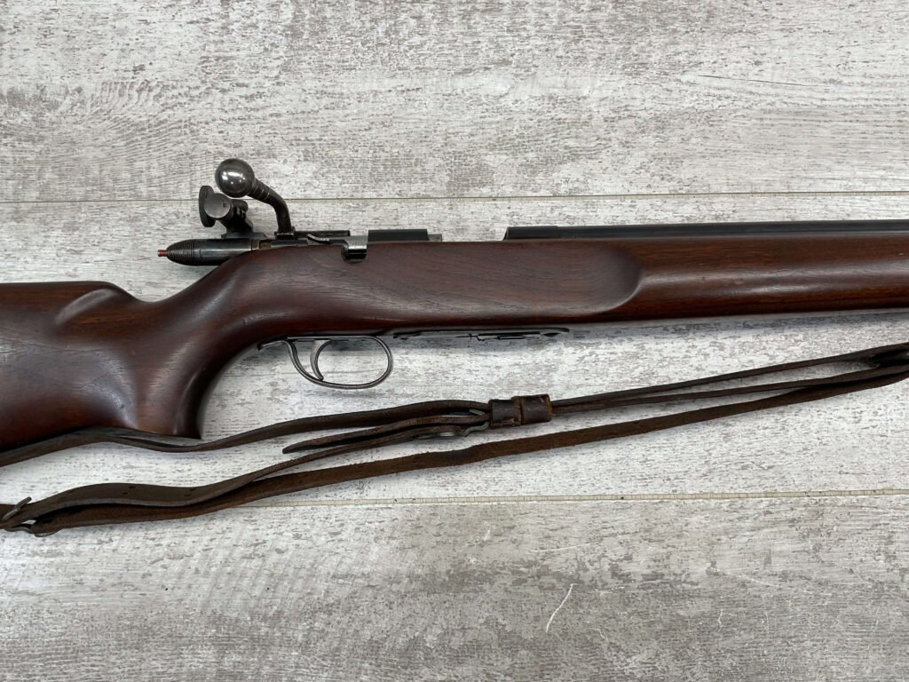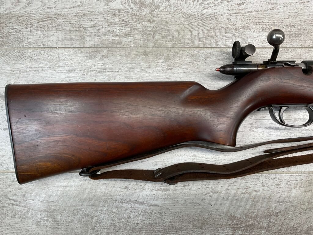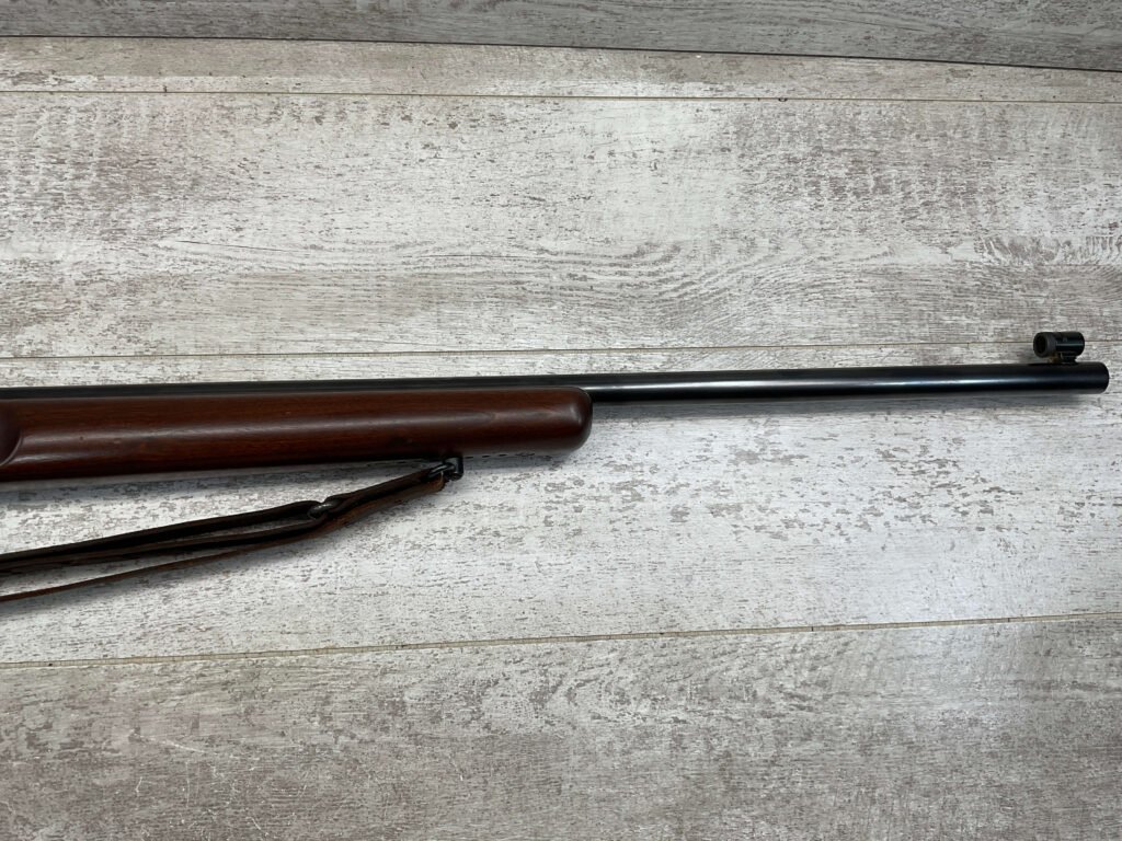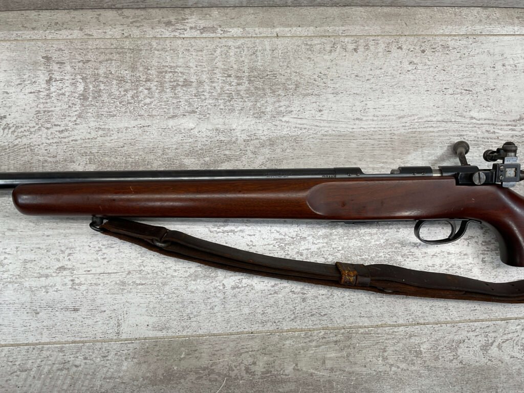 REMINGTON MODEL 513-T MATCHMASTER .22LR RIFLE #94107, 27″ HEAVY BARREL, EXC BORE & RIFLING, TARGET FRONT SIGHT, REDFIELD PEEP TARGET REAR SIGHT, EXC WALNUT STOCK W/ MINIMAL NICKS & DINGS, METAL BUTT PLATE, SLING SWIVELS, LEATHER SLING, 95%+ OVERALL