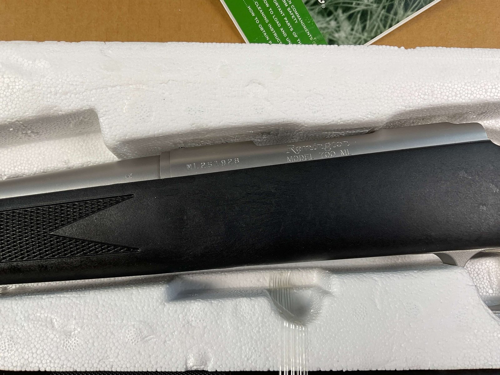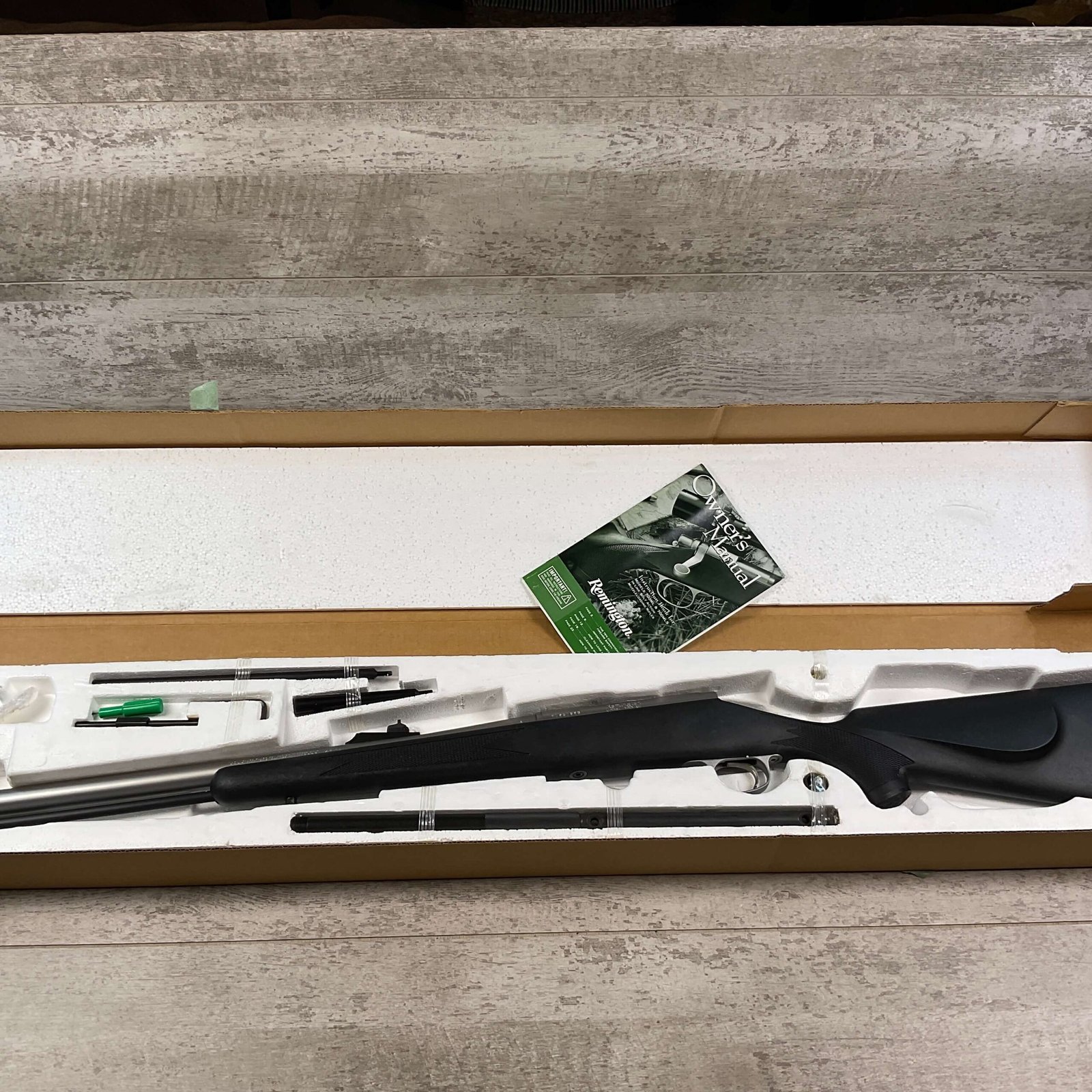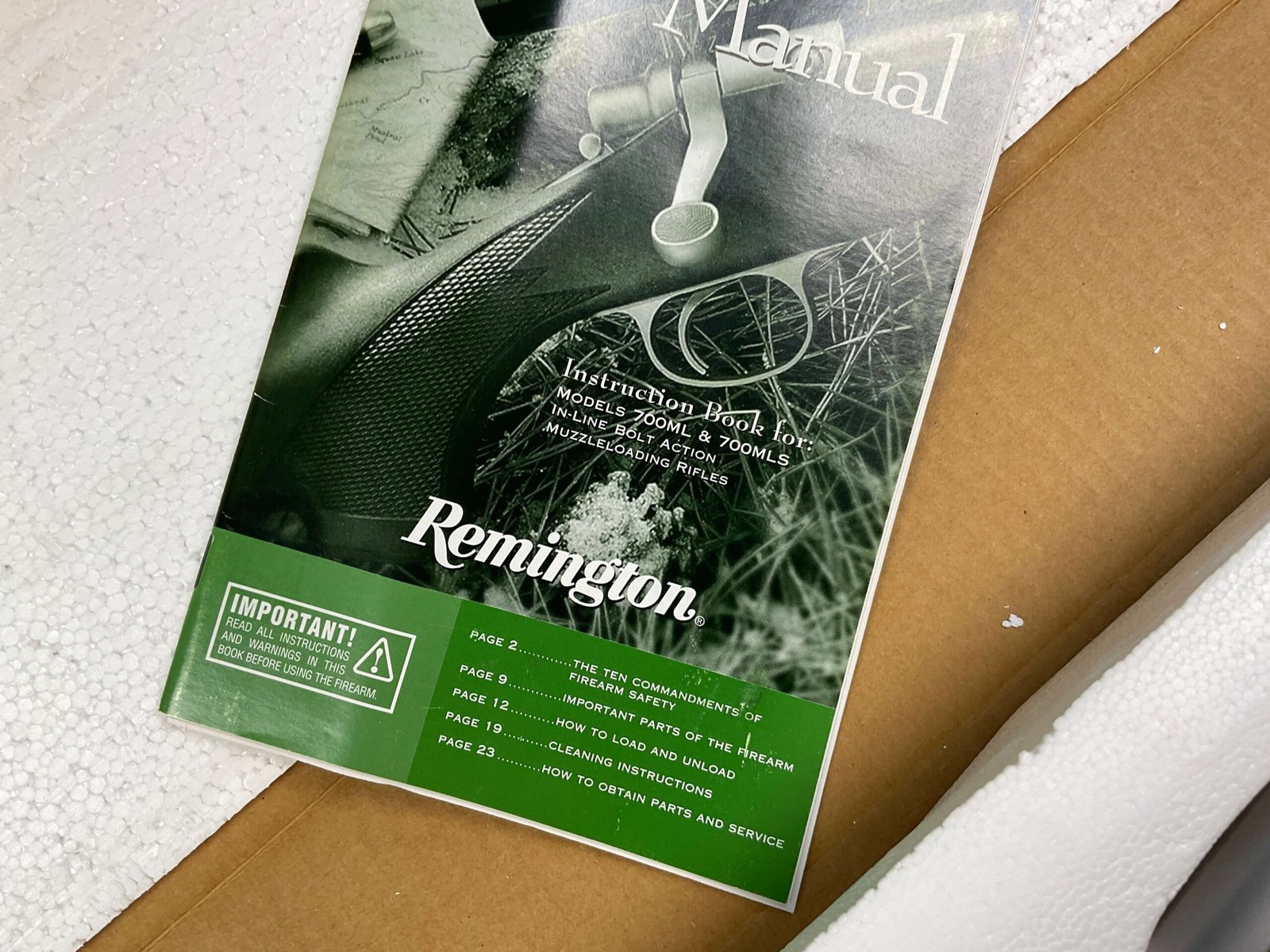 REMINGTON MODEL 700 .45CAL MLS MUZZLELOADER RIFLE, NEW IN BOX #ML251928, 26″ BARREL, IN-LINE BLACK POWDER, 3 WAY IGNITION FOR #209 PRIMER, BLACK SYNTHETIC STOCK W/RECOIL PAD, STAINLESS BARREL, NEW IN BOX, NEVER FIRED!