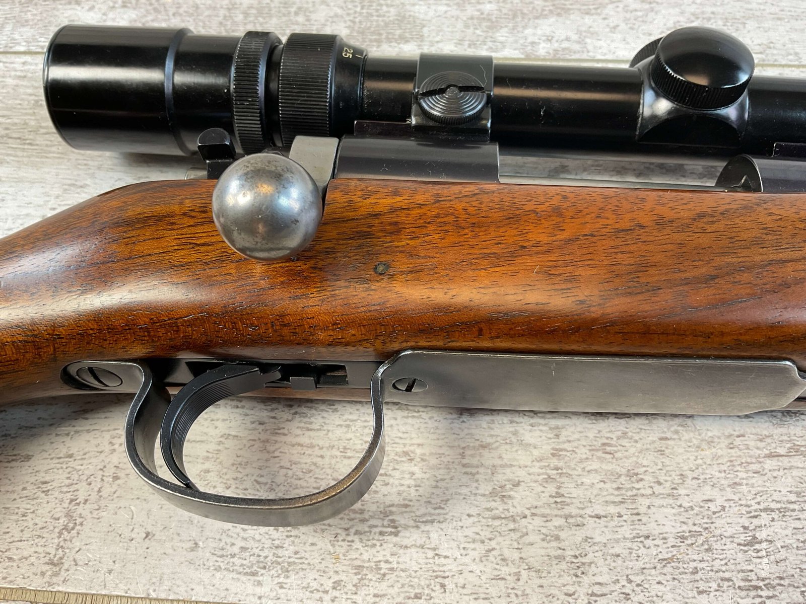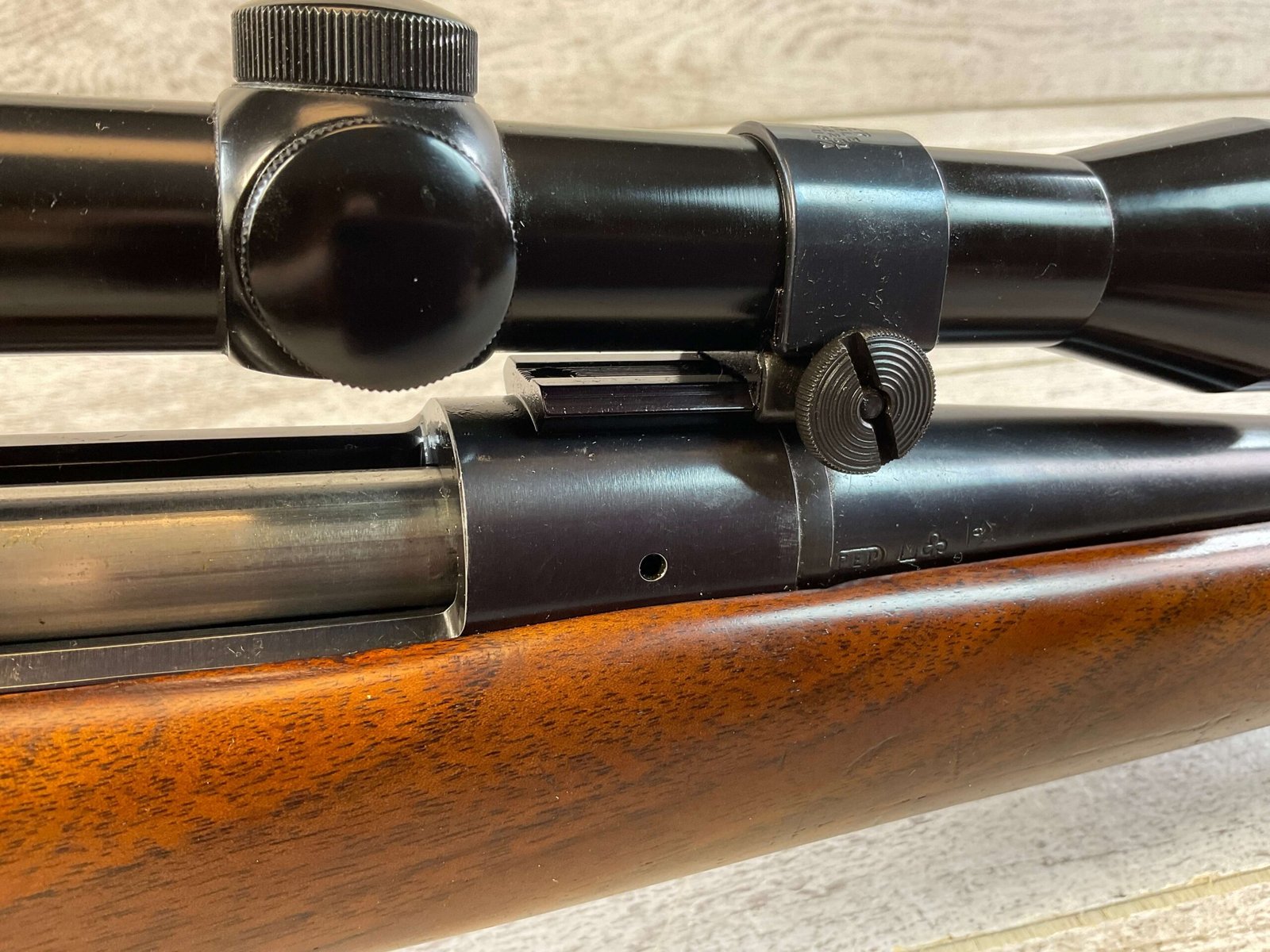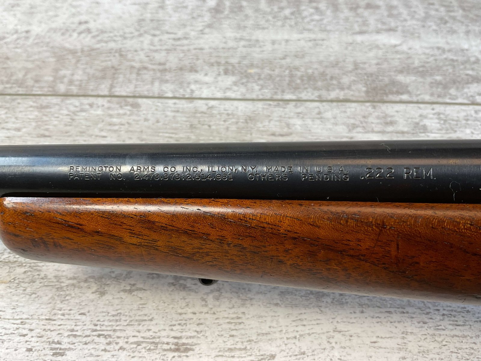 REMINGTON MODEL 722 .222 CAL BOLT ACTION RIFLE #38211, 22″ BARREL, EXC WALNUT STOCK W/ LIGHT IMPRESSIONS FROM USE / AGE, VG BORE & RIFLING W/ LIGHT OXIDATION IN COUPLE OF AREAS, EXC ORIGINAL FINISH W/ LIGHT FINISH LOSS ON MAGAZINE PLATE & AROUND MUZZLE, JUNE 1956 MFR, BANNER 2.5-7X SCOPE, CRISP TRIGGER, SLING MOUNTS, METAL BUTT PLATE, CONDITION AS SHOWN IN PICTURES.