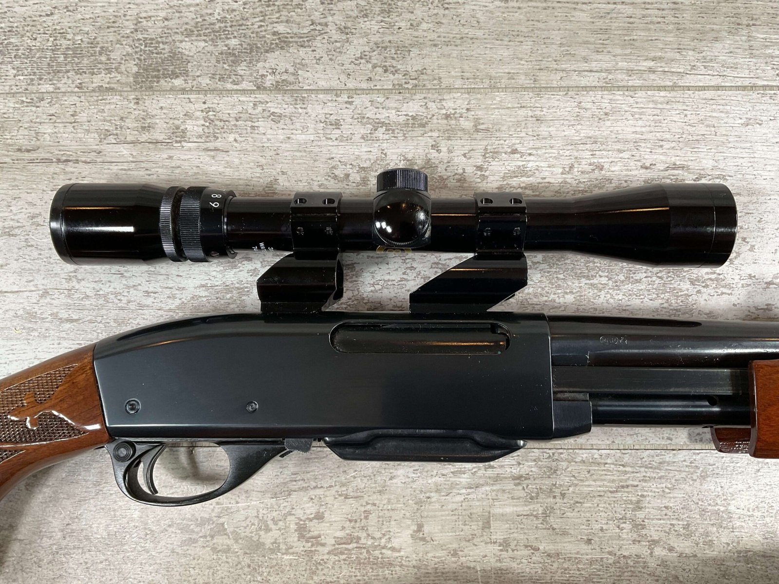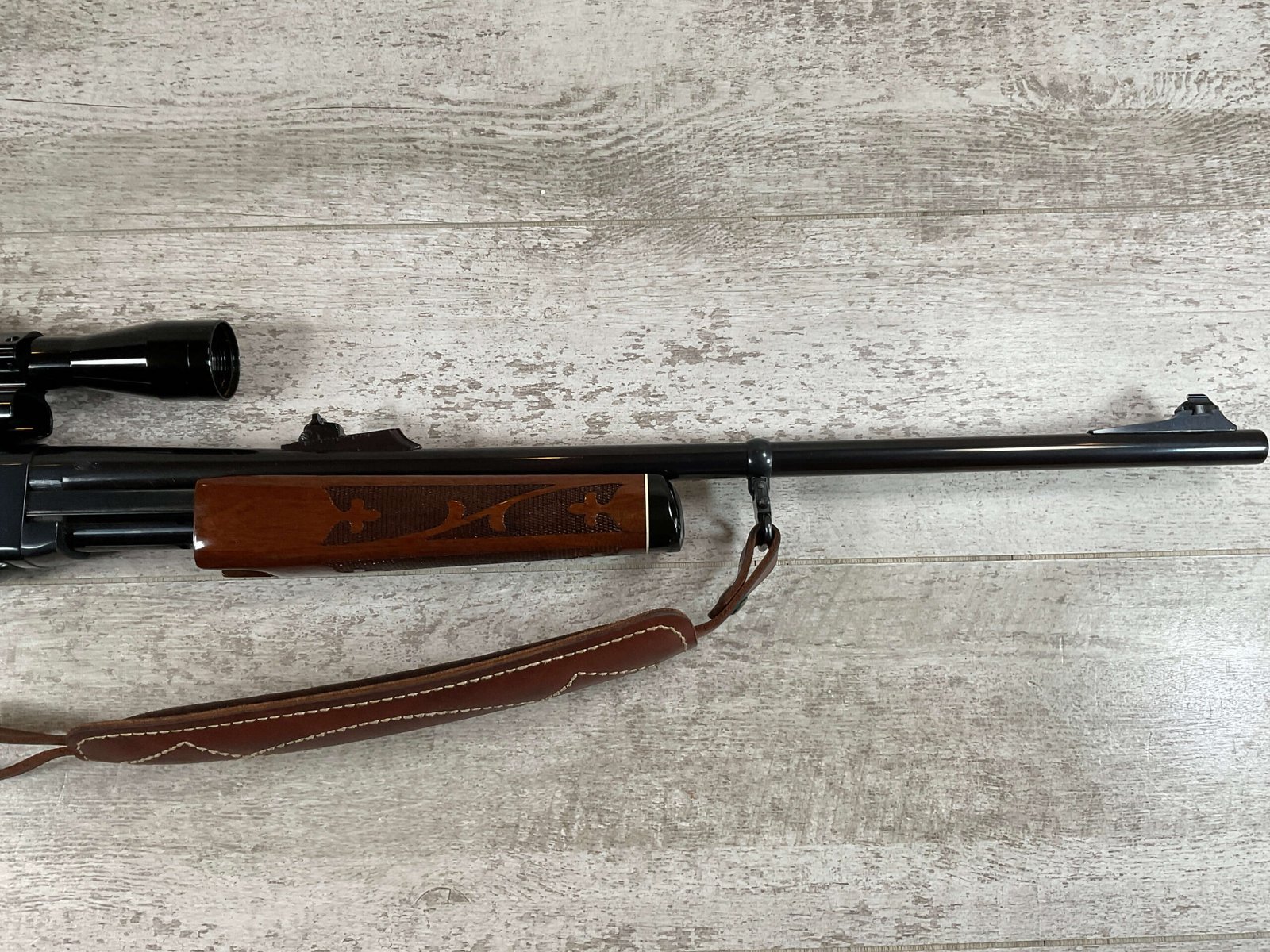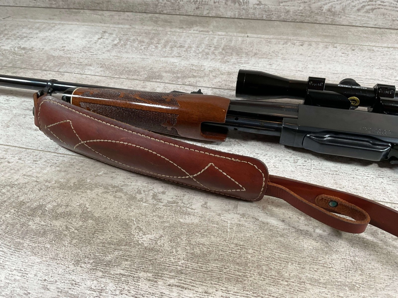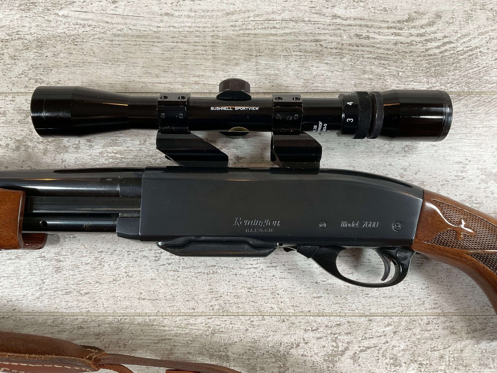 REMINGTON MODEL 7600 30-06 PUMP ACTION RIFLE #8449668, 1987 MFR, 22″ BARREL, MONTE CARLO PISTOL GRIP HIGH GLOSS CHECKERED WALNUT STOCK & FOREARM, ADJ REAR SIGHT, BLADE FRONT SIGHT, BUSHNELL SPORTVIEW 3-9 SCOPE, IRON SIGHTER SCOPE MOUNTS, PLASTIC BUTT PLATE, HUNTER 27-036-4 LEATHER SLING W/THUMB HOLE, ONE MAGAZINE, REALLY CLEAN AND READY TO TAKE DOWN THAT WHITETAIL! 95+% OVERALL