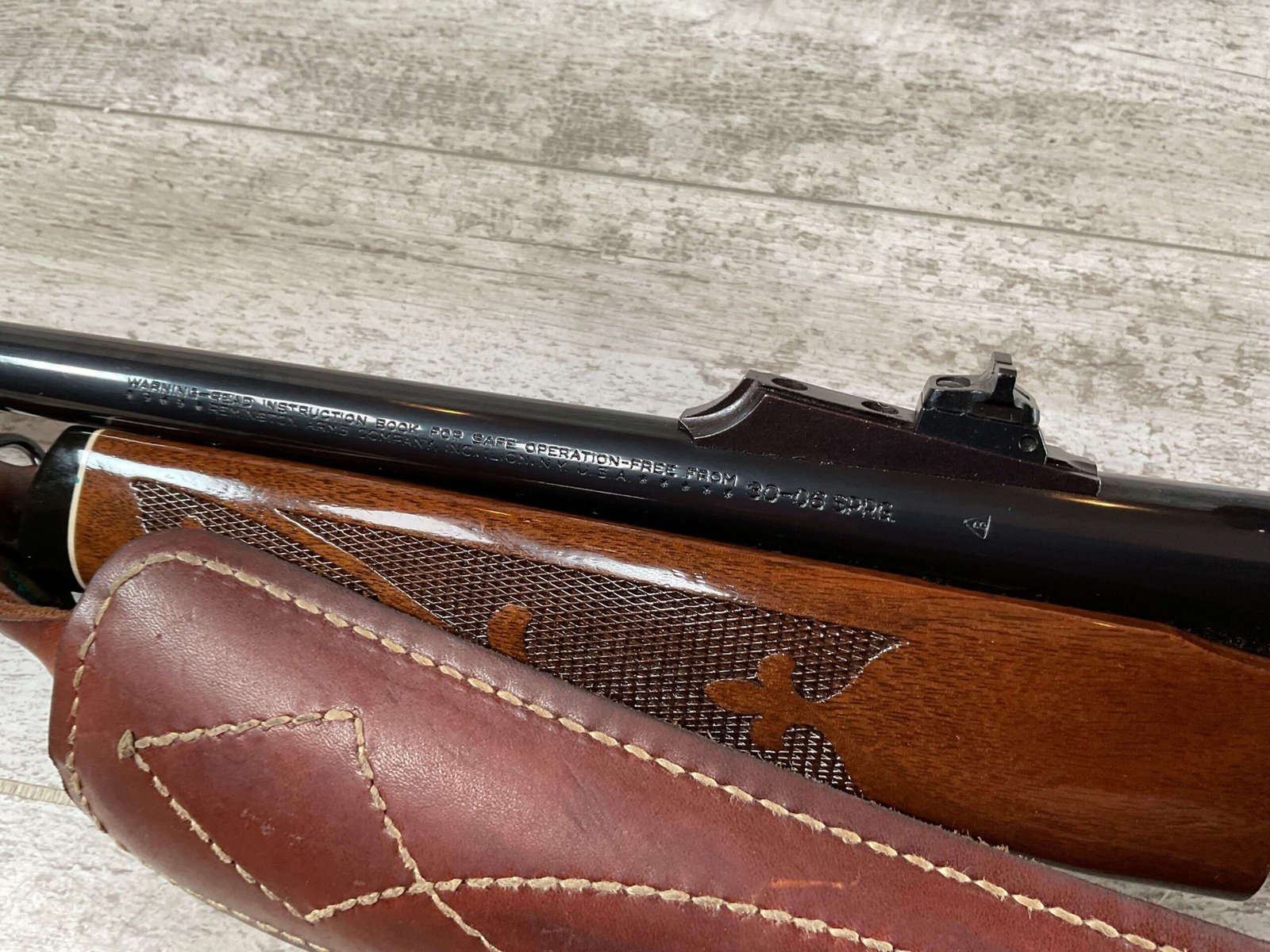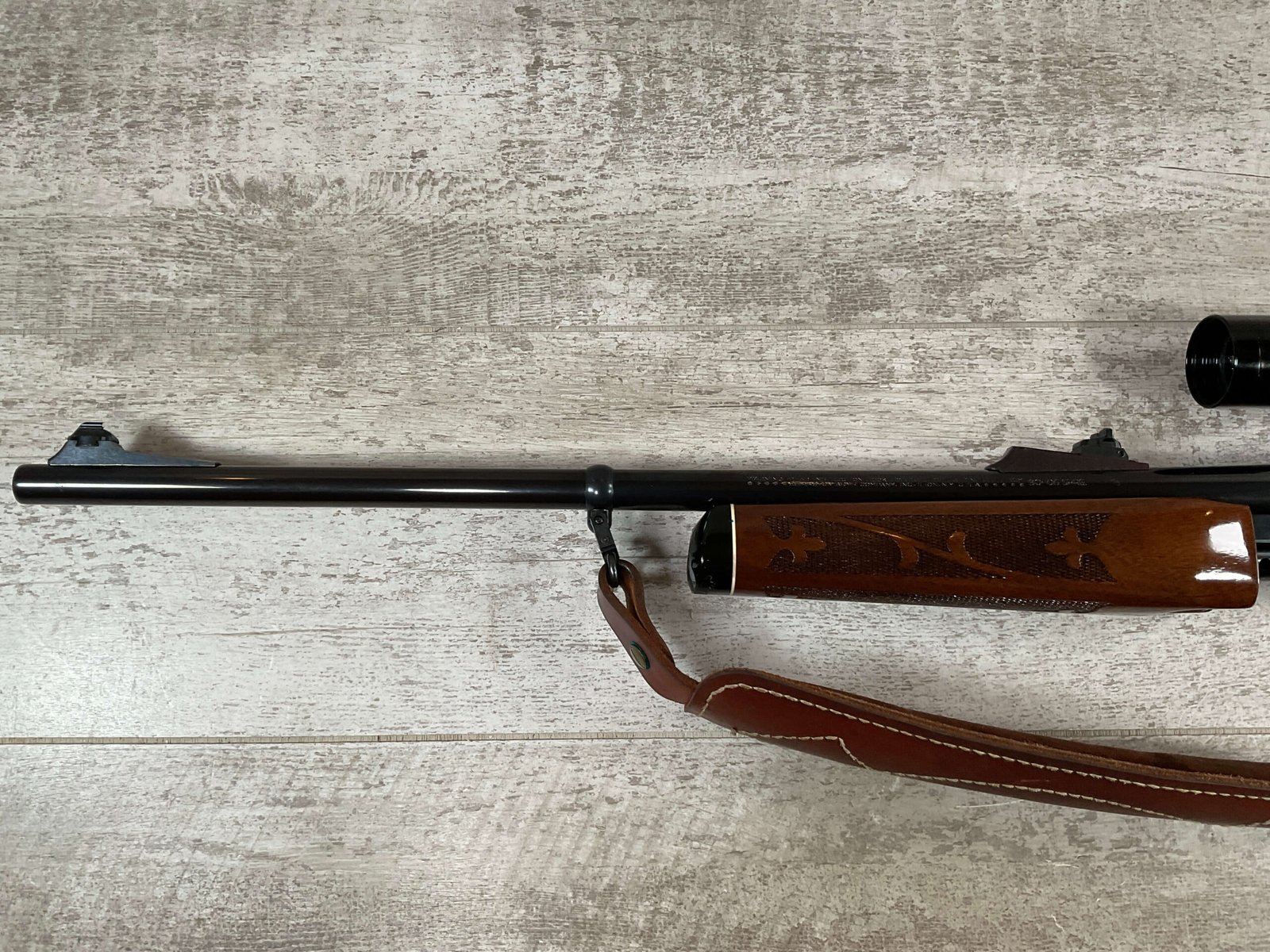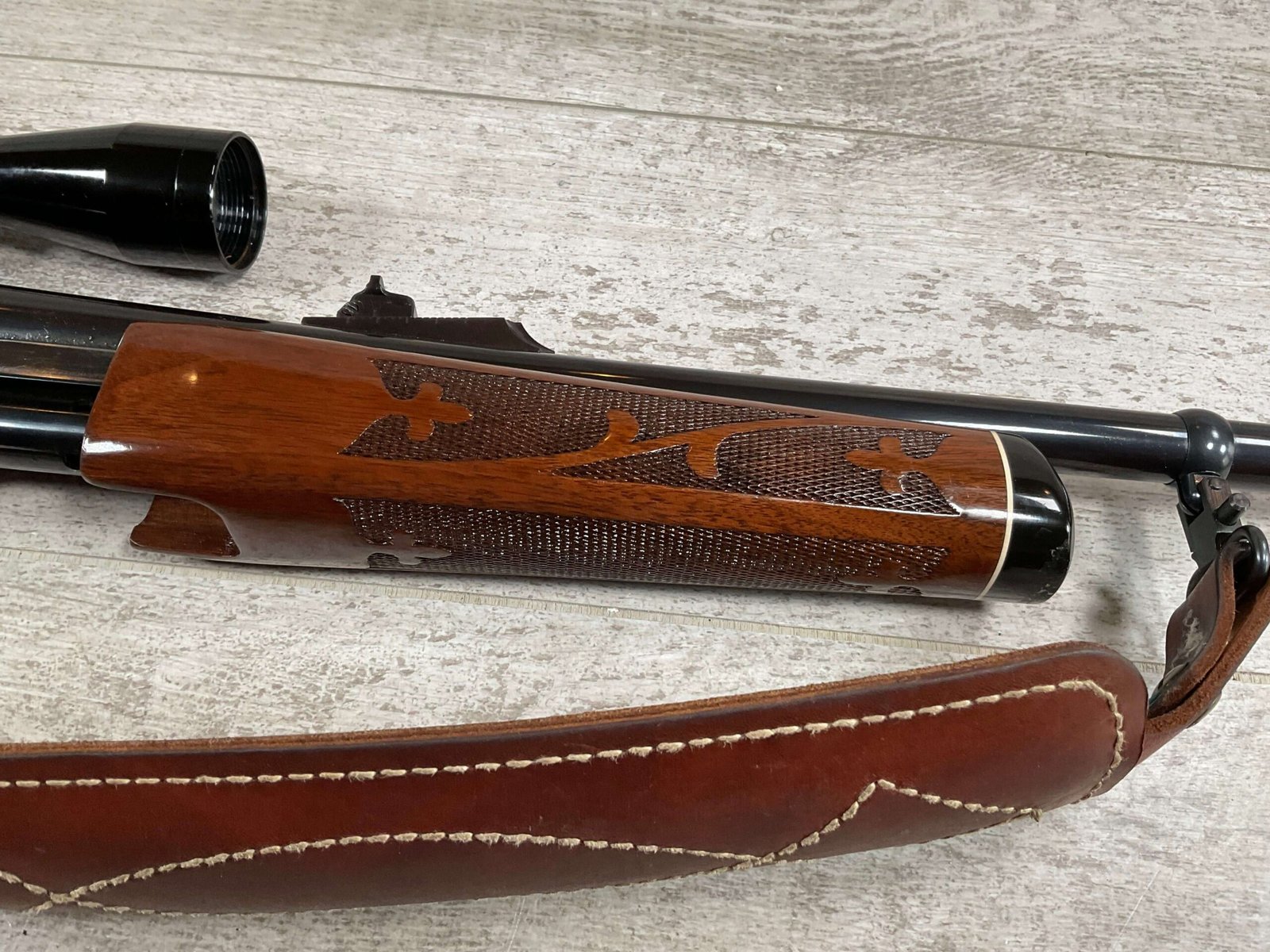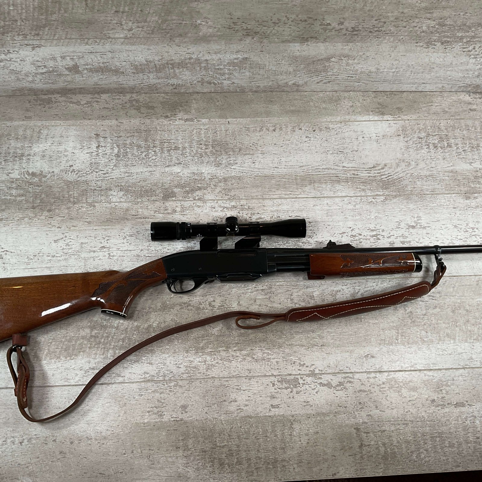 REMINGTON MODEL 7600 30-06 PUMP ACTION RIFLE #8449668, 1987 MFR, 22″ BARREL, MONTE CARLO PISTOL GRIP HIGH GLOSS CHECKERED WALNUT STOCK & FOREARM, ADJ REAR SIGHT, BLADE FRONT SIGHT, BUSHNELL SPORTVIEW 3-9 SCOPE, IRON SIGHTER SCOPE MOUNTS, PLASTIC BUTT PLATE, HUNTER 27-036-4 LEATHER SLING W/THUMB HOLE, ONE MAGAZINE, REALLY CLEAN AND READY TO TAKE DOWN THAT WHITETAIL! 95+% OVERALL