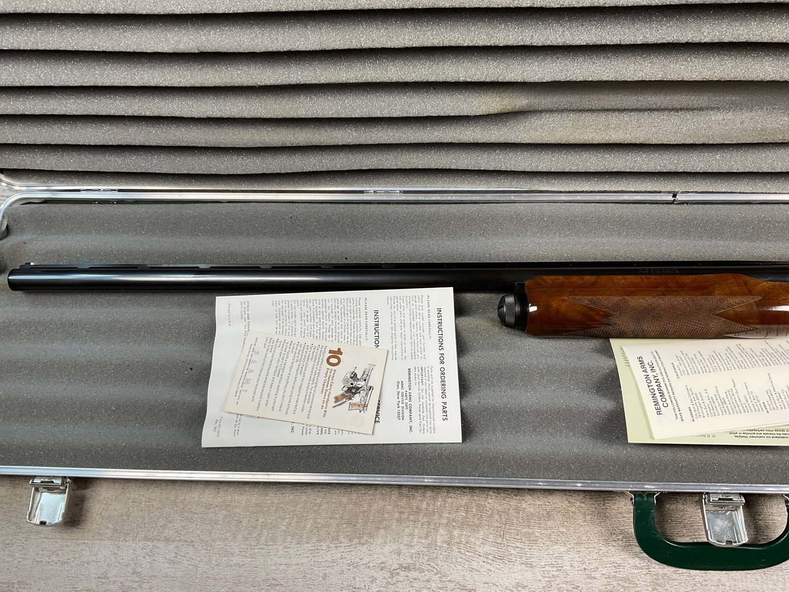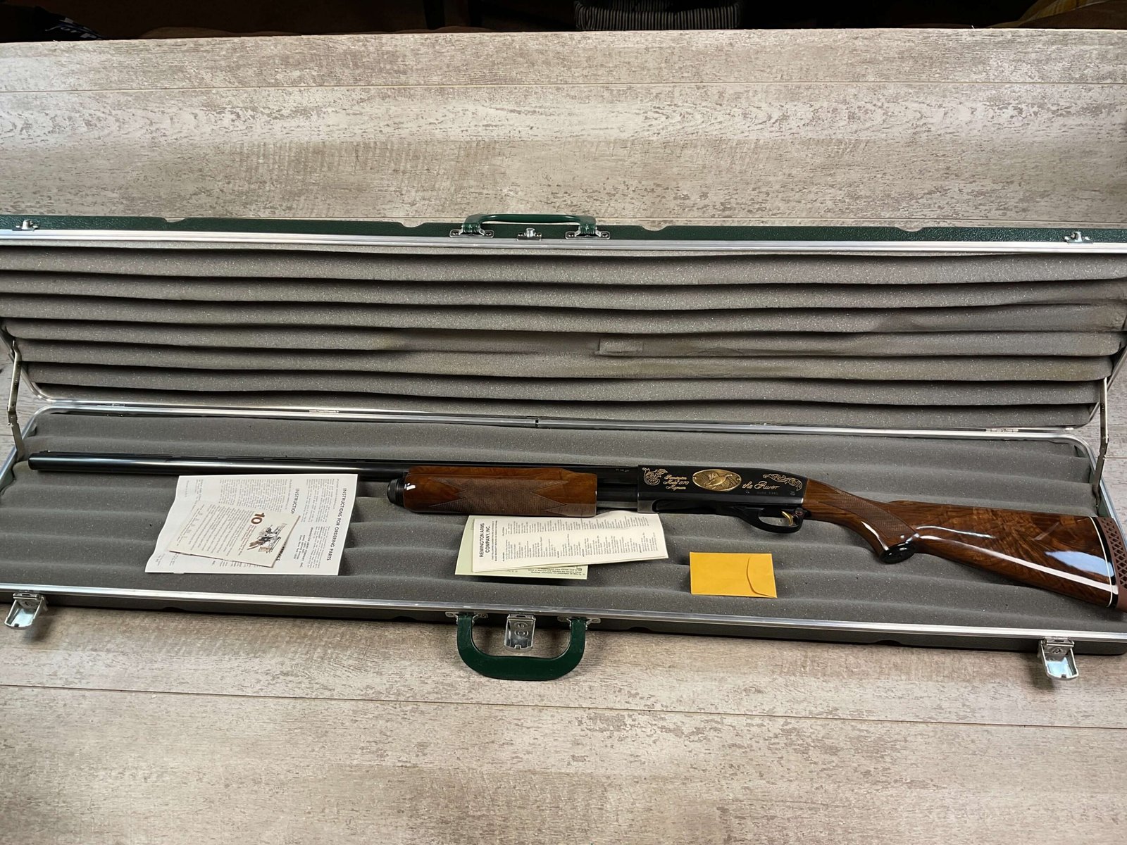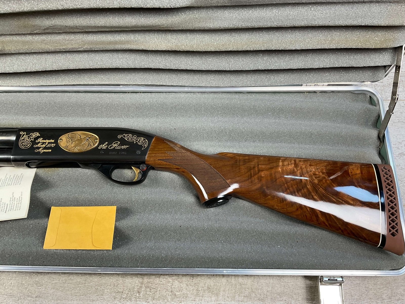 REMINGTON MODEL 870 WINGMASTER MAGNUM DUCKS UNLIMTED MISSISSIPPI EDITION “THE RIVER” 12GA SHOTGUN #DU822361, 1982 DUCKS UNLIMTED DINNER GUN, 12GA, 3″, 30″ FULL CHOKE VR BARREL, ENGRAVED RECEIVER W/GOLD PLAQUE ON LEFT SIDE OF RECEIVER, GOLD TRIGGER, BEAUTIFUL CHECKERED WALNUT PISTOL GRIP STOCK, RECOIL PAD, GREEN HARD CASE, 100% NEVER FIRED COLLECTORS CONDITION.