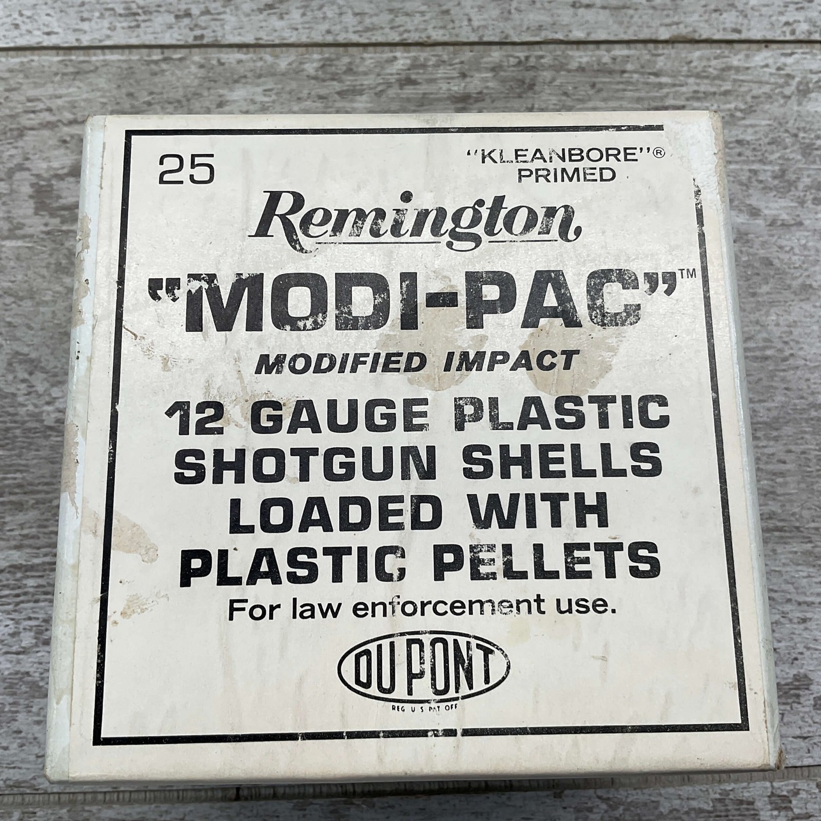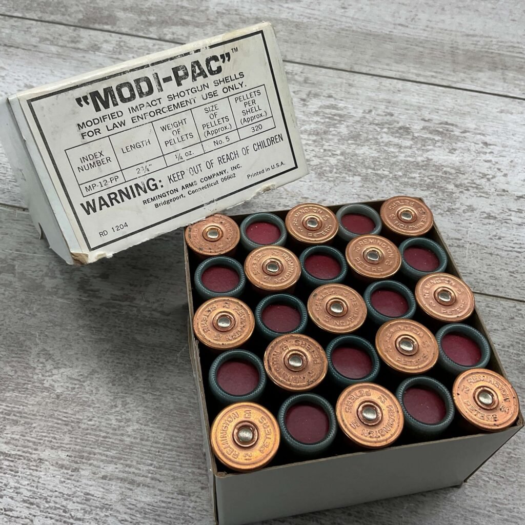 REMINGTON MODI-PAC 2 3/4″ 12 GA. PLASTIC SHOTGUN SHELLS, LOADED WITH PLASTIC PELLETS, FOR LAW ENFORCEMENT, SHELLS IN VG CONDITION (2 BOXES AVAILABLE, ONE BOX IS MISSING 1 SHELL)