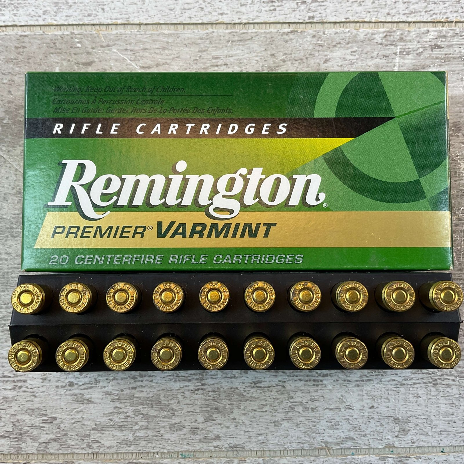 REMINGTON PREMIER VARMINT 221 REM FIREBALL, 50 GR. V-MAX BOAT TAIL AMMO, FULL BOX (QTY 20), #PRV221FB, BOX IS IN EXC CONDITION WITH NO EVIDENT WEAR OR USAGE.