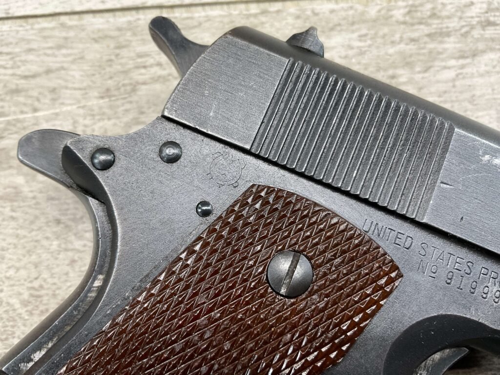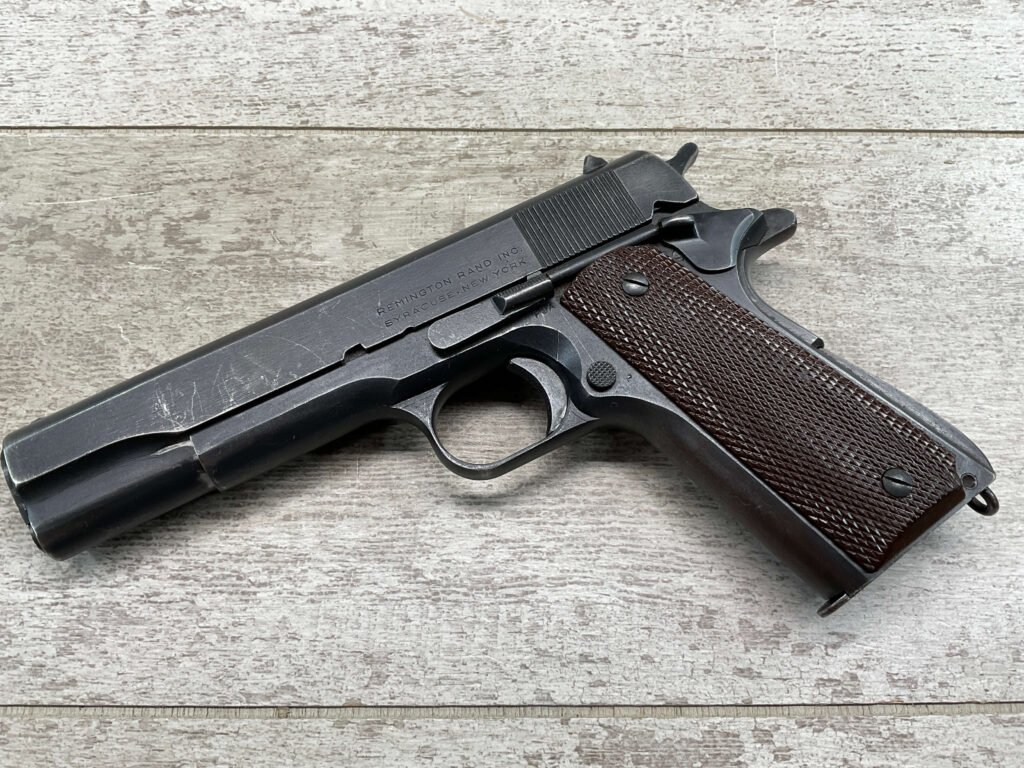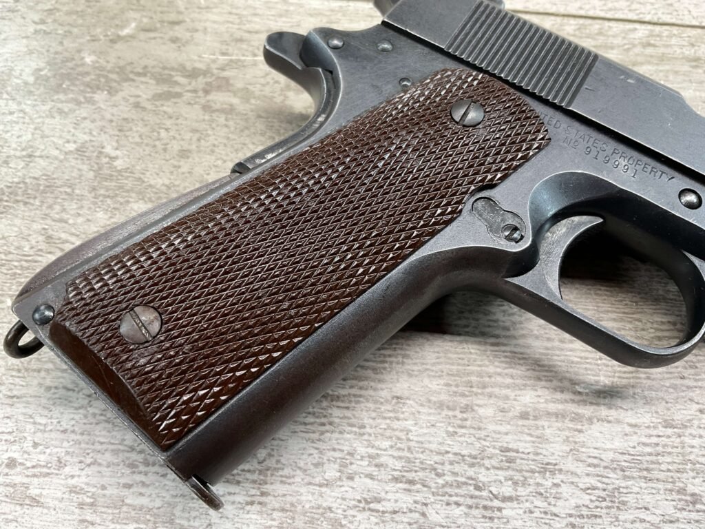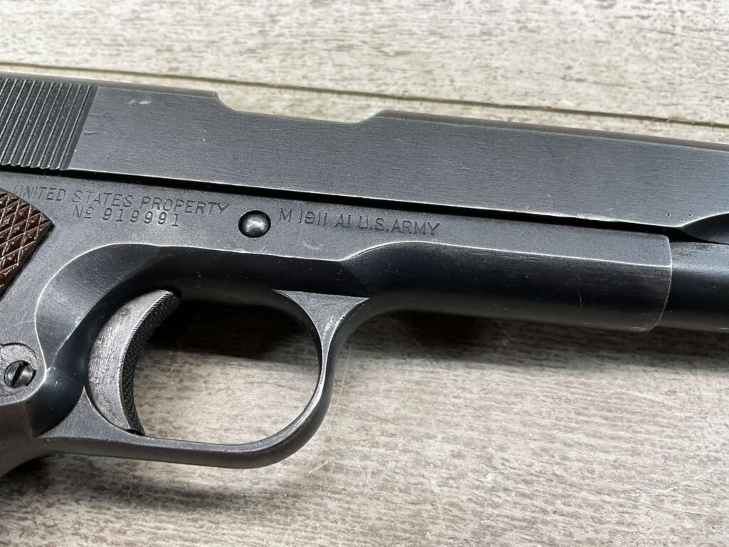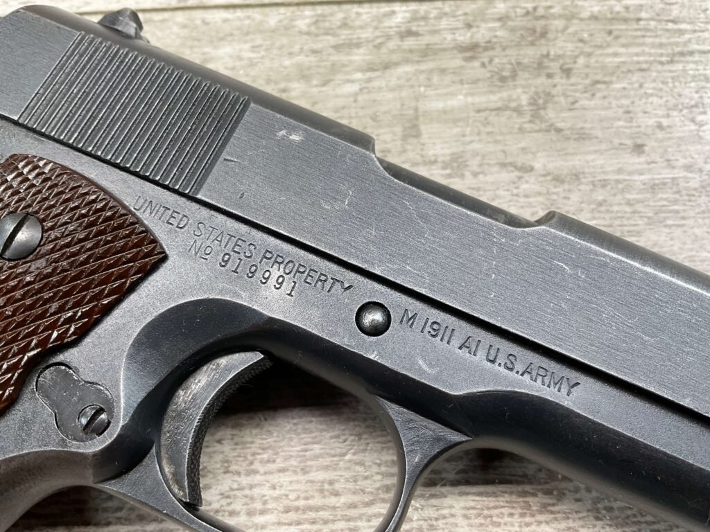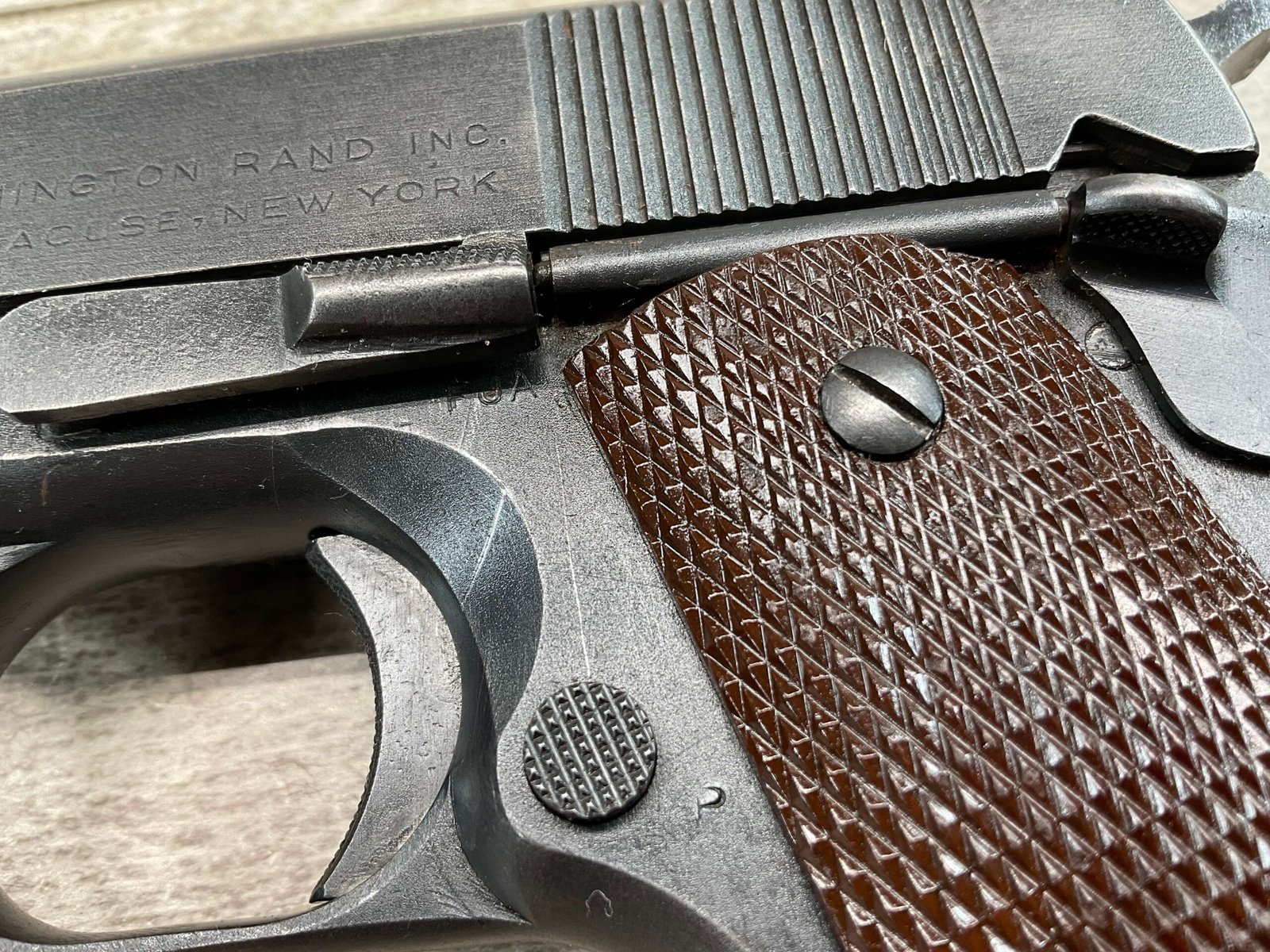 REMINGTON RAND M1911A1 .45CAL PISTOL, #919991, 1942 MFR, 1ST VARIATION, ALL MATCHING EXCEPT THE BARREL (WWII REPLACEMENT BARREL, PX-4/SP), PARKERIZED (DU-LITE) FINISH SHOWING LIGHT USE (SLIGHT TOUGH-UP POSSIBLE?), “UNITED STATES PROPERTY M1911A1 U.S. ARMY OVER SERIAL #” ON RIGHT SIDE OF FRAME, FAINT CROSS CANNONS BEHIND RIGHT GRIP, “FJA (FRANK J ATTWOOD)” ABOVE MAG RELEASE AND “P” BELOW, LEFT SIDE OF SLIDE “REMINGTON RAND INC.” OVER “SYRACUSE, NEW YORK”, EXC CHECKERED GRIPS, EXC BRIGHT BORE, ALL CORRECT SMALL PARTS, 95+% ONLY A HANDFUL OF REM RANDS PRODUCED IN 1942, THIS IS A REAL FIND AND GREAT ADDITION FOR ANY SERIOUS 1911 COLLECTOR!!