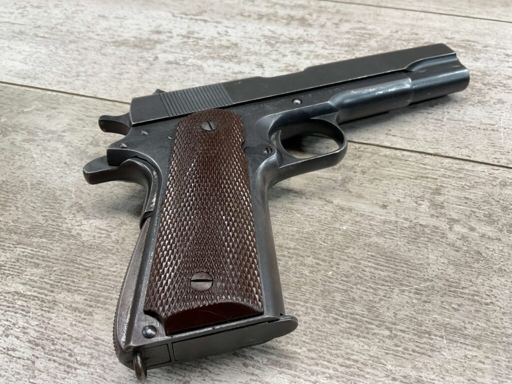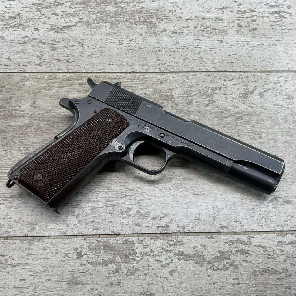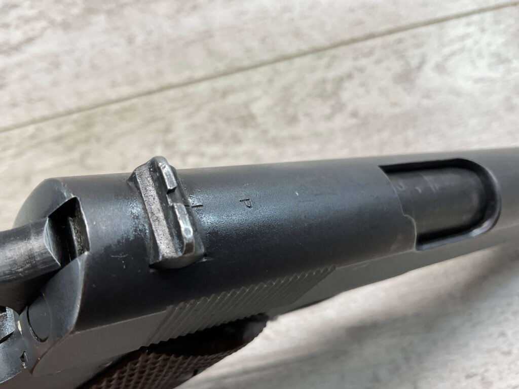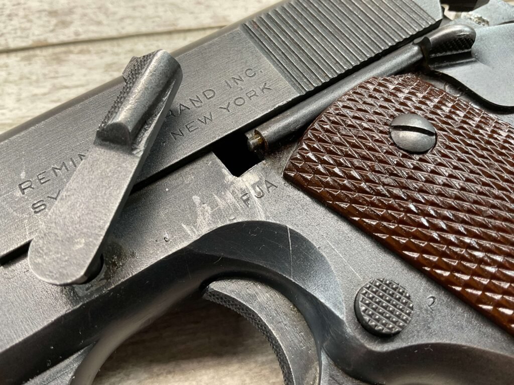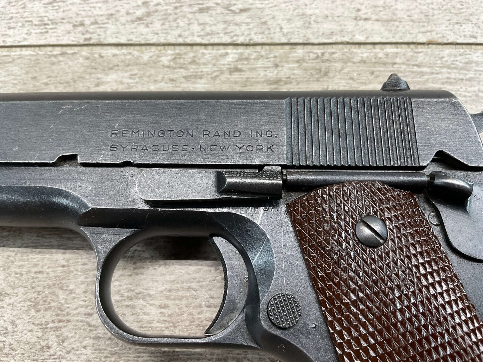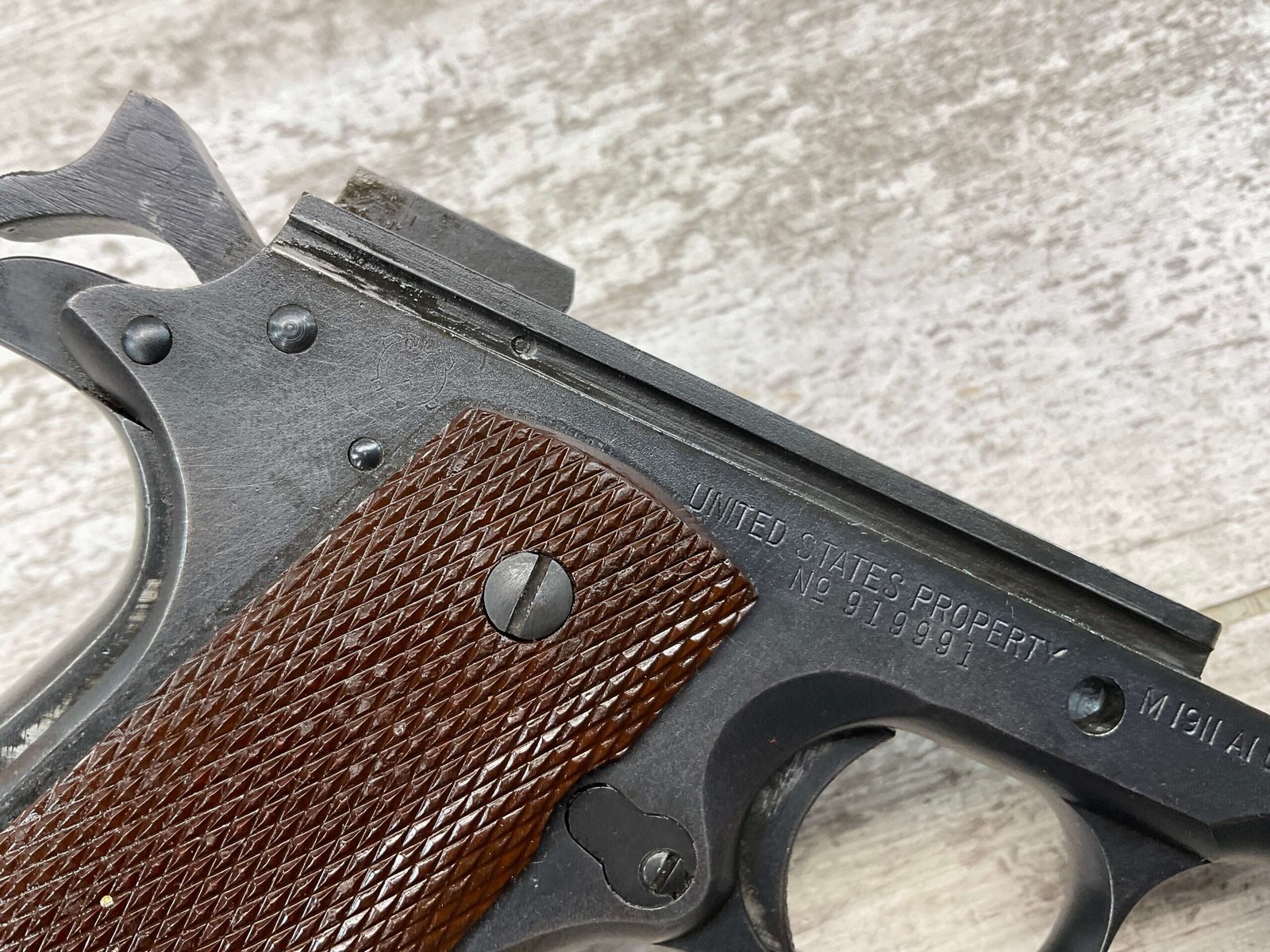 REMINGTON RAND M1911A1 .45CAL PISTOL, #919991, 1942 MFR, 1ST VARIATION, ALL MATCHING EXCEPT THE BARREL (WWII REPLACEMENT BARREL, PX-4/SP), PARKERIZED (DU-LITE) FINISH SHOWING LIGHT USE (SLIGHT TOUGH-UP POSSIBLE?), “UNITED STATES PROPERTY M1911A1 U.S. ARMY OVER SERIAL #” ON RIGHT SIDE OF FRAME, FAINT CROSS CANNONS BEHIND RIGHT GRIP, “FJA (FRANK J ATTWOOD)” ABOVE MAG RELEASE AND “P” BELOW, LEFT SIDE OF SLIDE “REMINGTON RAND INC.” OVER “SYRACUSE, NEW YORK”, EXC CHECKERED GRIPS, EXC BRIGHT BORE, ALL CORRECT SMALL PARTS, 95+% ONLY A HANDFUL OF REM RANDS PRODUCED IN 1942, THIS IS A REAL FIND AND GREAT ADDITION FOR ANY SERIOUS 1911 COLLECTOR!!