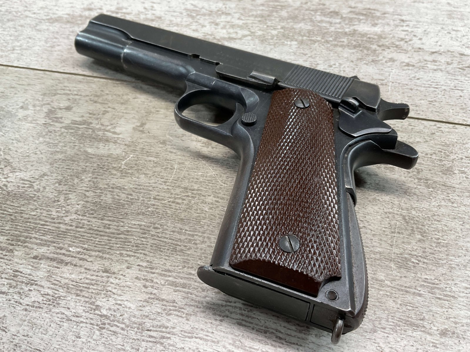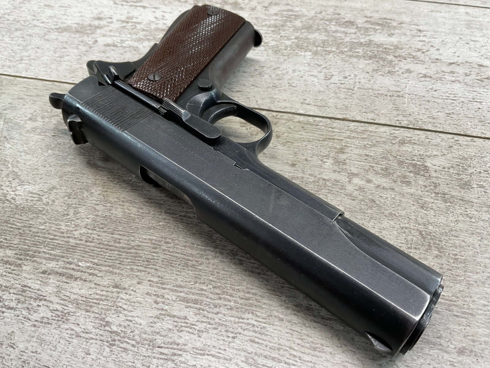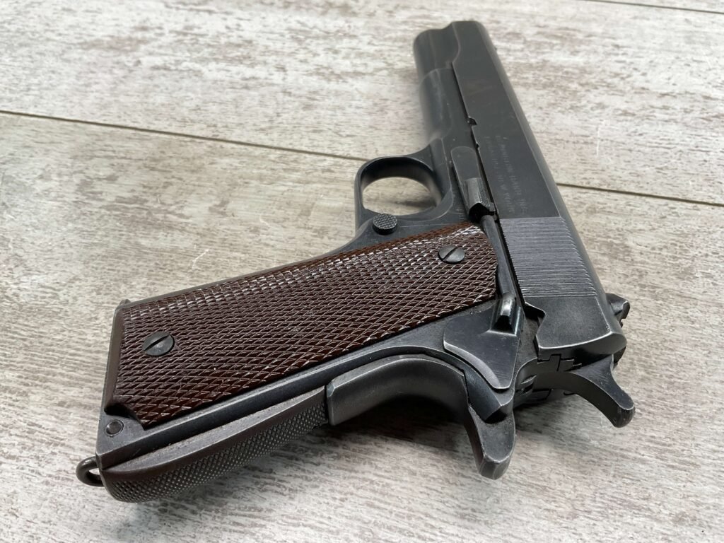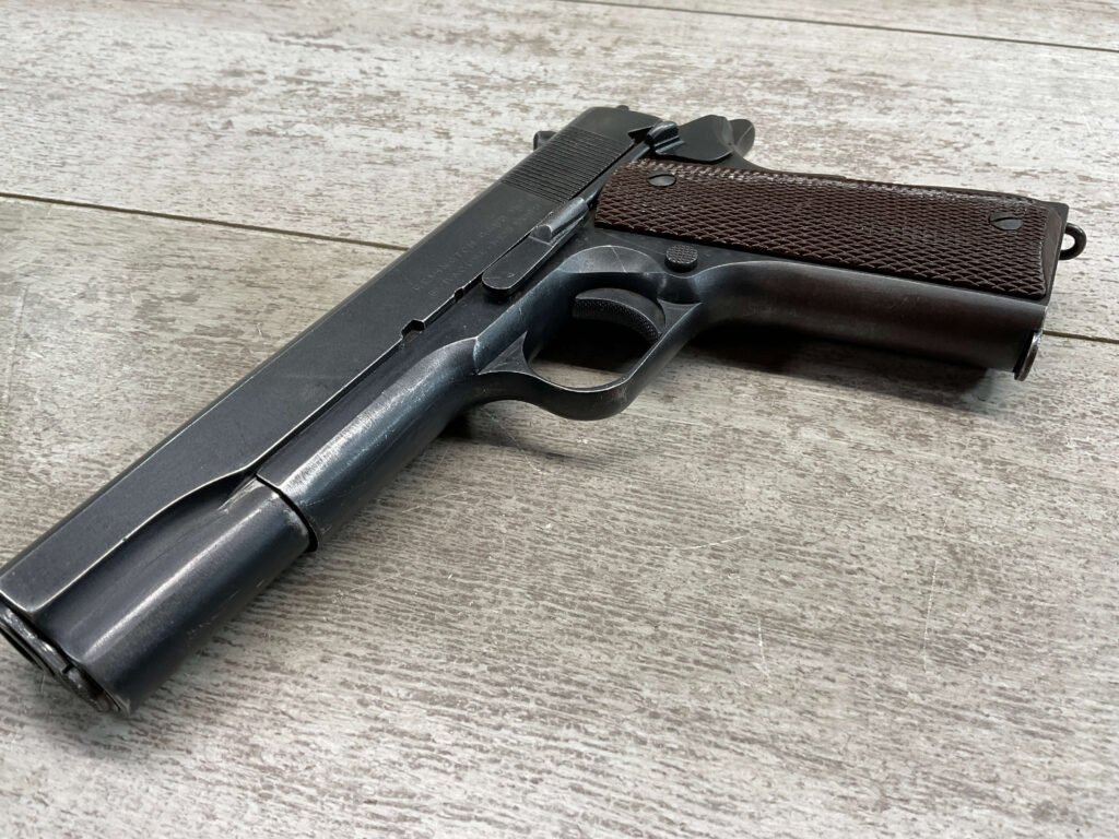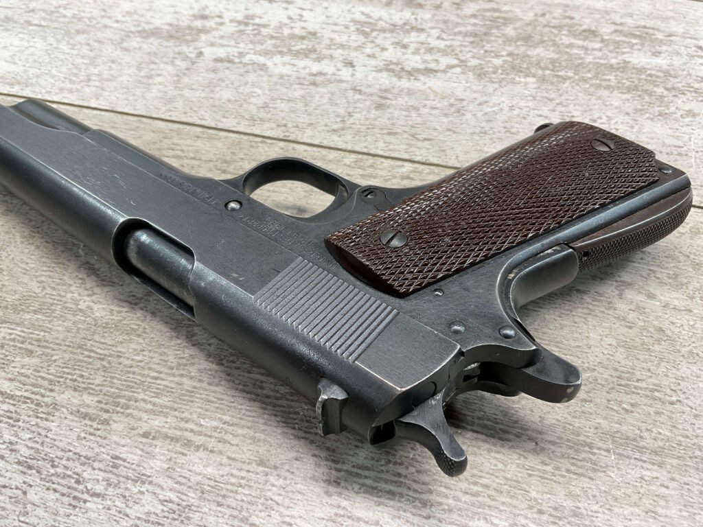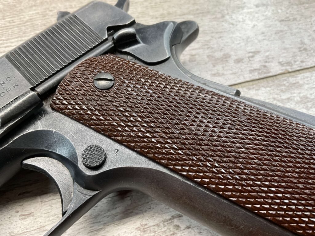 REMINGTON RAND M1911A1 .45CAL PISTOL, #919991, 1942 MFR, 1ST VARIATION, ALL MATCHING EXCEPT THE BARREL (WWII REPLACEMENT BARREL, PX-4/SP), PARKERIZED (DU-LITE) FINISH SHOWING LIGHT USE (SLIGHT TOUGH-UP POSSIBLE?), “UNITED STATES PROPERTY M1911A1 U.S. ARMY OVER SERIAL #” ON RIGHT SIDE OF FRAME, FAINT CROSS CANNONS BEHIND RIGHT GRIP, “FJA (FRANK J ATTWOOD)” ABOVE MAG RELEASE AND “P” BELOW, LEFT SIDE OF SLIDE “REMINGTON RAND INC.” OVER “SYRACUSE, NEW YORK”, EXC CHECKERED GRIPS, EXC BRIGHT BORE, ALL CORRECT SMALL PARTS, 95+% ONLY A HANDFUL OF REM RANDS PRODUCED IN 1942, THIS IS A REAL FIND AND GREAT ADDITION FOR ANY SERIOUS 1911 COLLECTOR!!