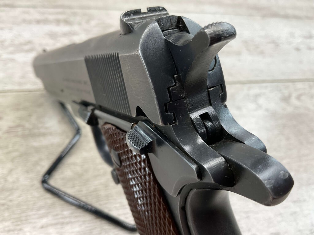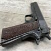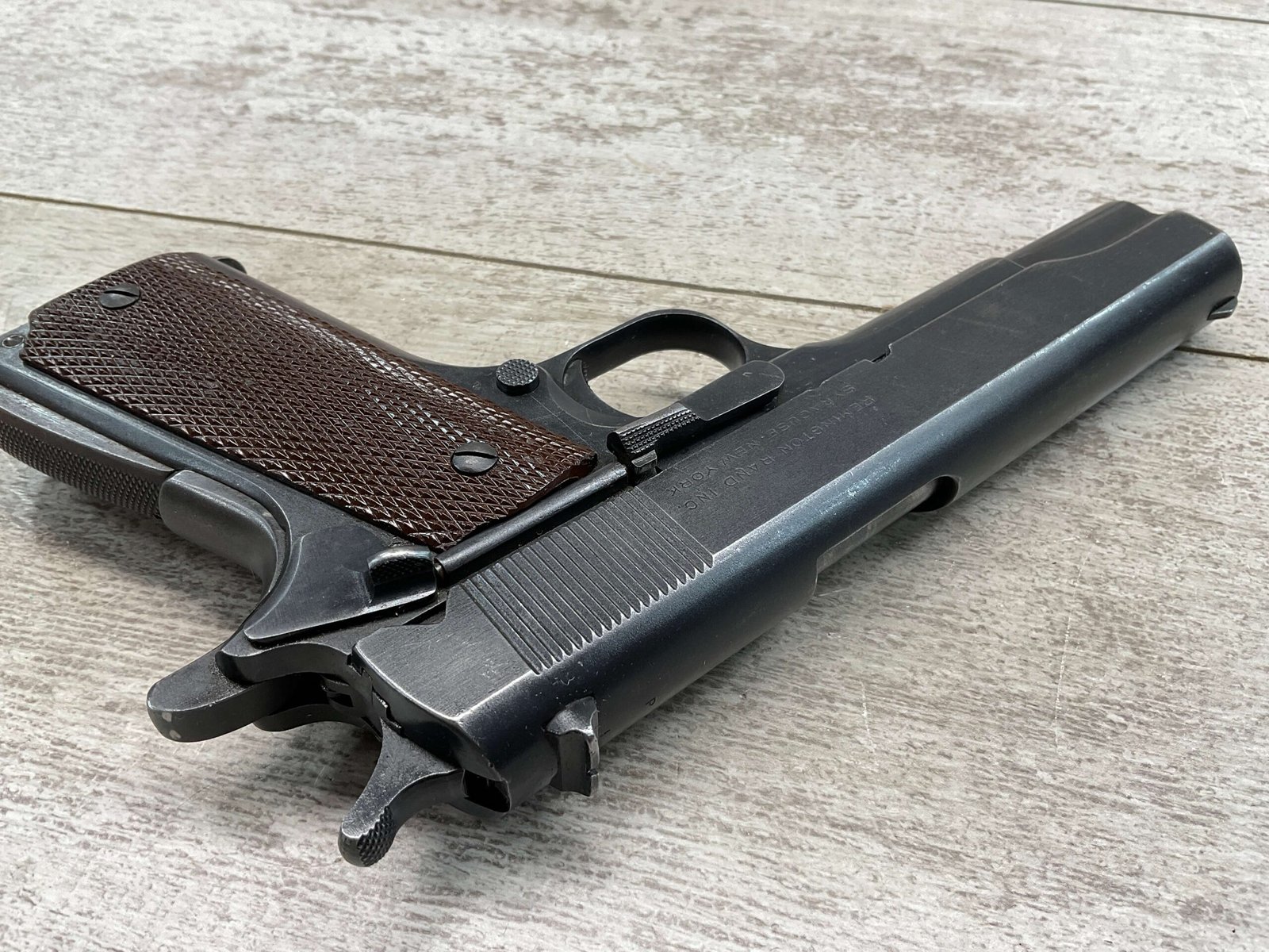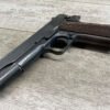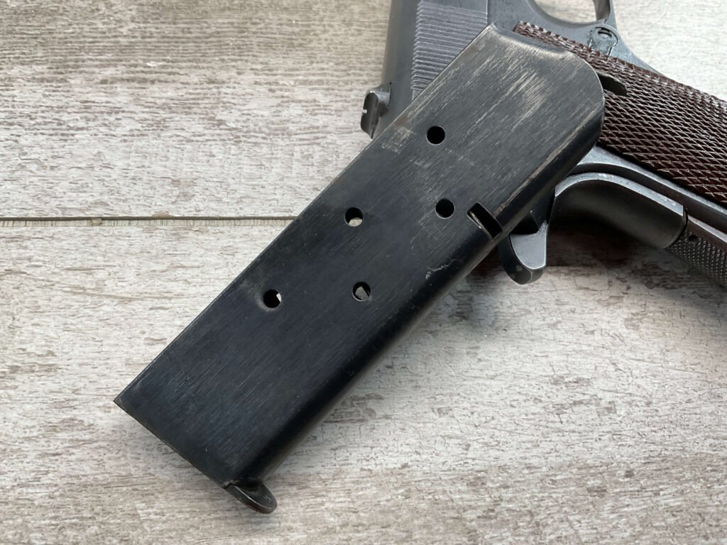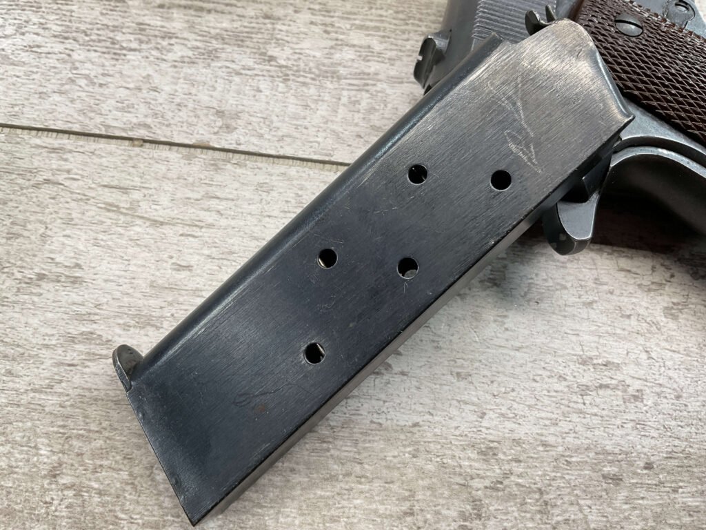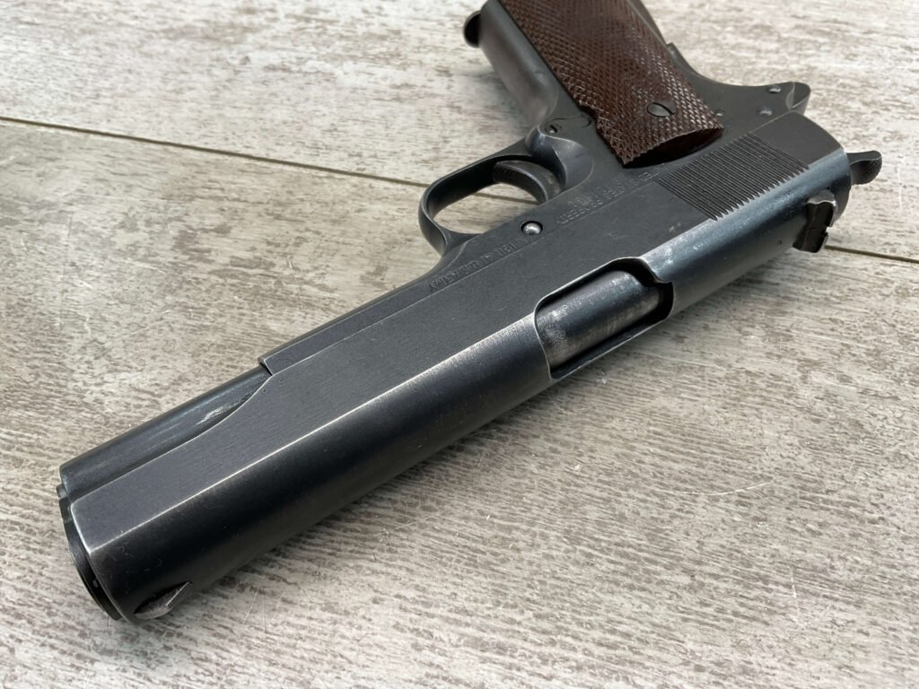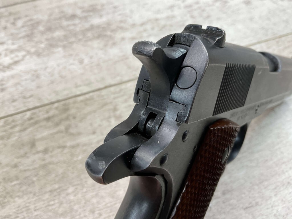 REMINGTON RAND M1911A1 .45CAL PISTOL, #919991, 1942 MFR, 1ST VARIATION, ALL MATCHING EXCEPT THE BARREL (WWII REPLACEMENT BARREL, PX-4/SP), PARKERIZED (DU-LITE) FINISH SHOWING LIGHT USE (SLIGHT TOUGH-UP POSSIBLE?), “UNITED STATES PROPERTY M1911A1 U.S. ARMY OVER SERIAL #” ON RIGHT SIDE OF FRAME, FAINT CROSS CANNONS BEHIND RIGHT GRIP, “FJA (FRANK J ATTWOOD)” ABOVE MAG RELEASE AND “P” BELOW, LEFT SIDE OF SLIDE “REMINGTON RAND INC.” OVER “SYRACUSE, NEW YORK”, EXC CHECKERED GRIPS, EXC BRIGHT BORE, ALL CORRECT SMALL PARTS, 95+% ONLY A HANDFUL OF REM RANDS PRODUCED IN 1942, THIS IS A REAL FIND AND GREAT ADDITION FOR ANY SERIOUS 1911 COLLECTOR!!