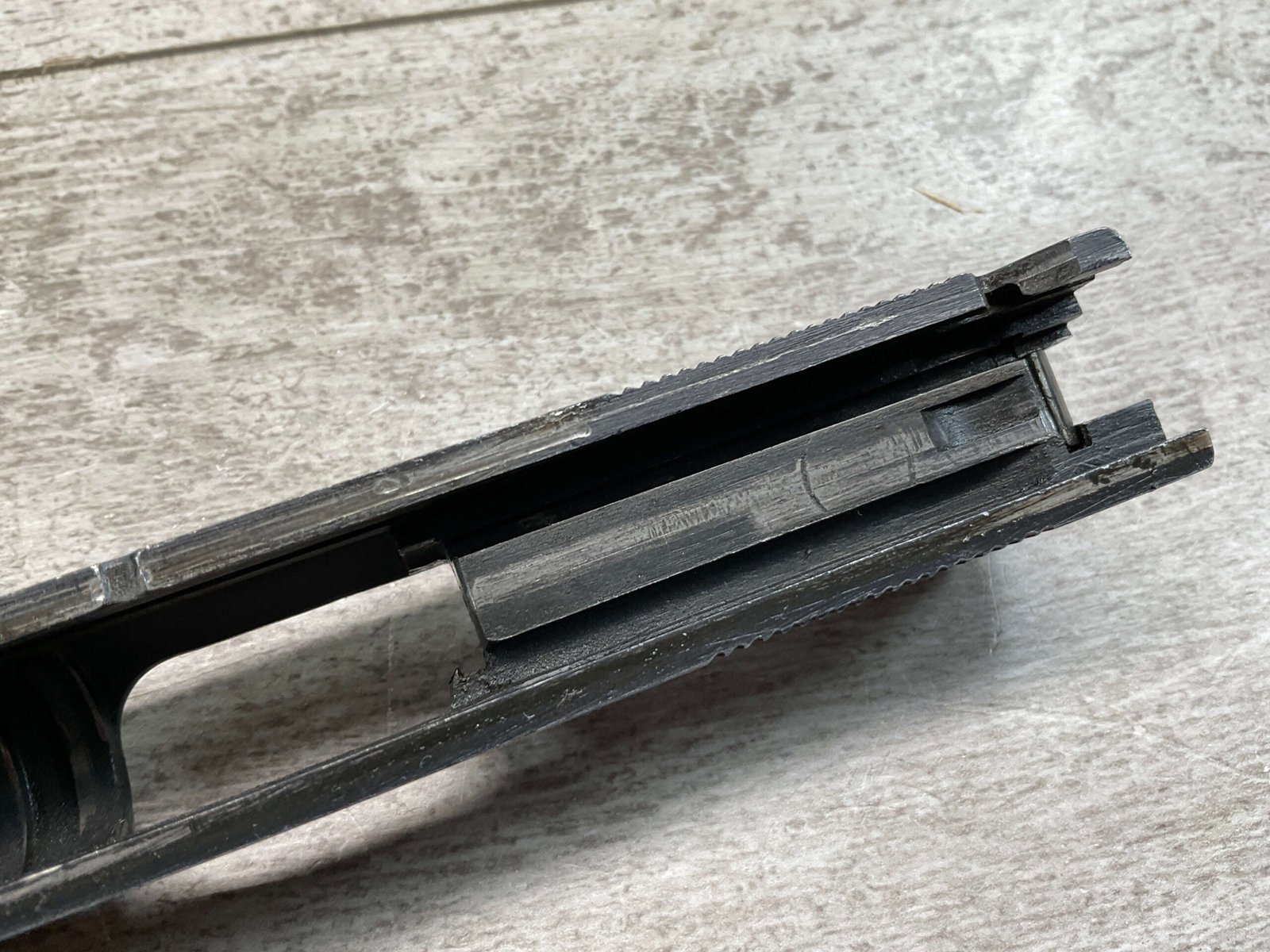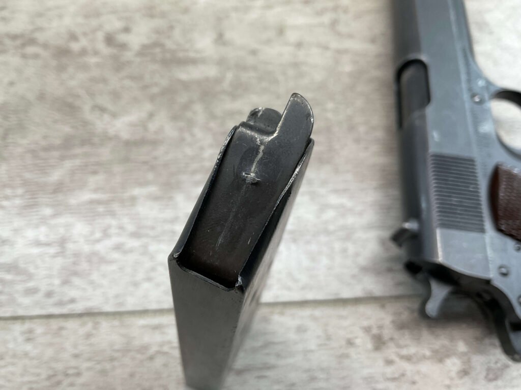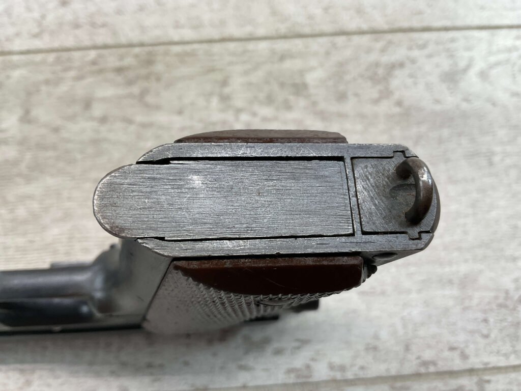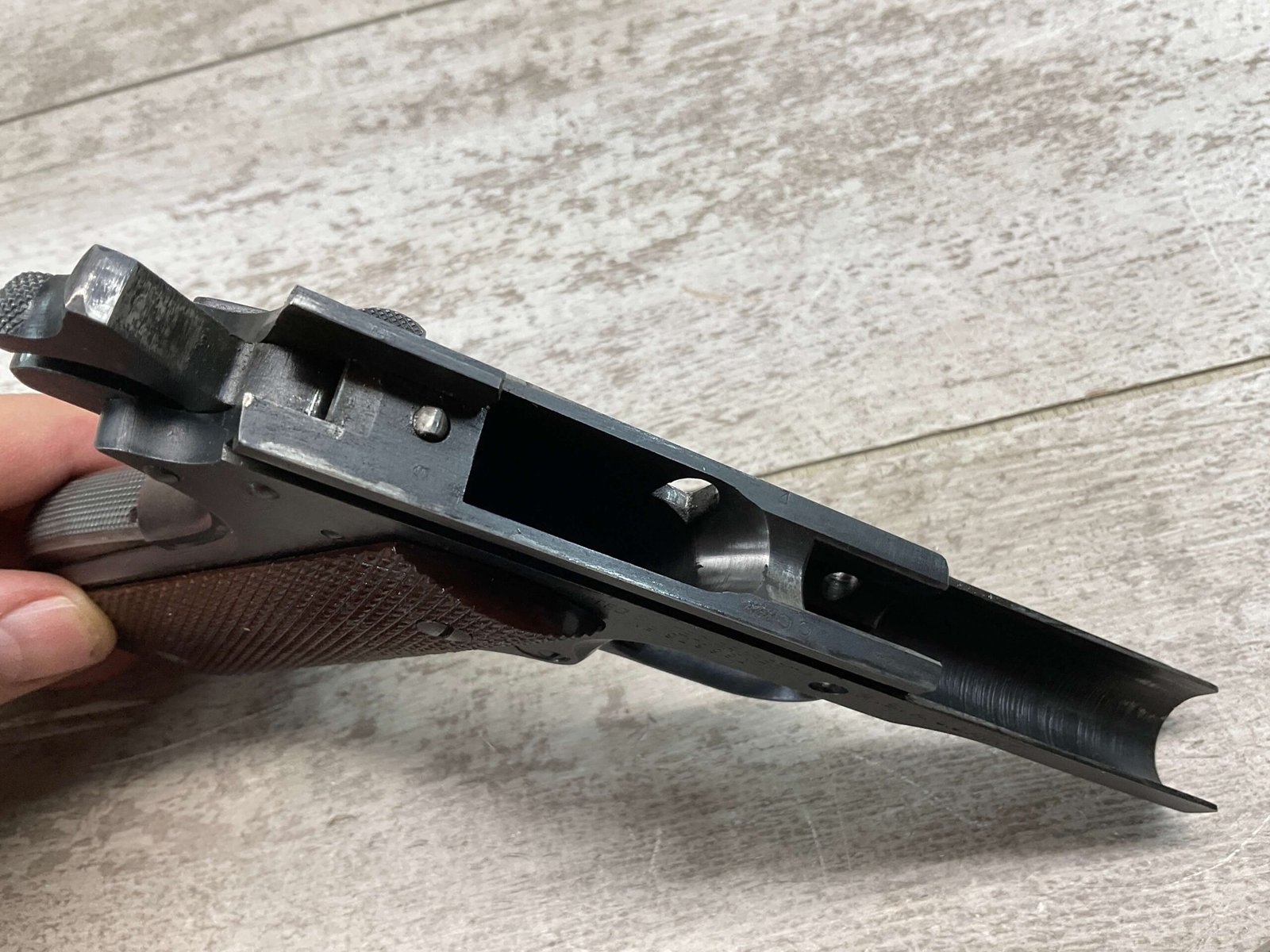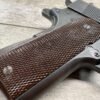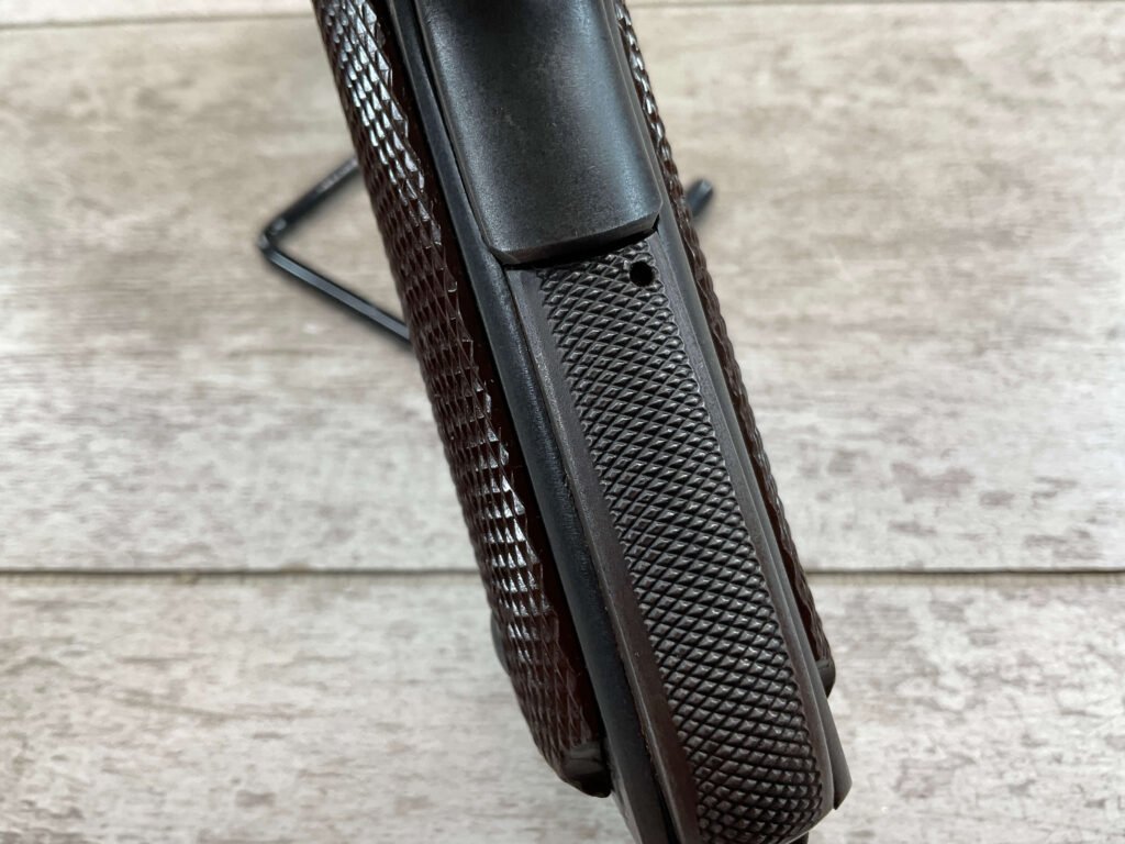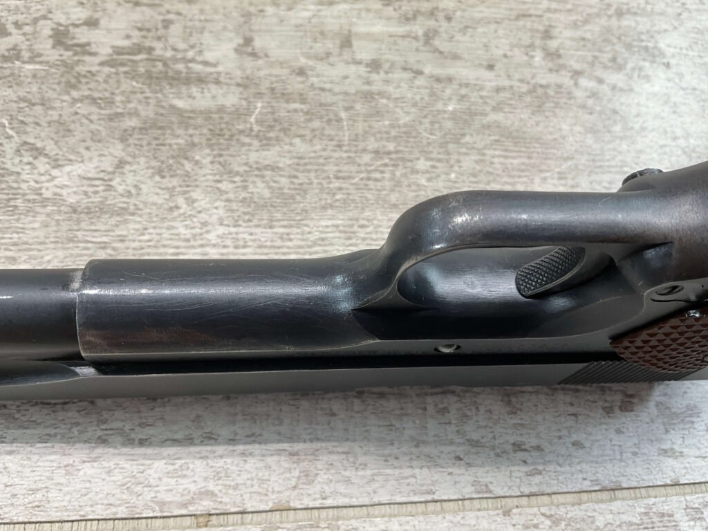 REMINGTON RAND M1911A1 .45CAL PISTOL, #919991, 1942 MFR, 1ST VARIATION, ALL MATCHING EXCEPT THE BARREL (WWII REPLACEMENT BARREL, PX-4/SP), PARKERIZED (DU-LITE) FINISH SHOWING LIGHT USE (SLIGHT TOUGH-UP POSSIBLE?), “UNITED STATES PROPERTY M1911A1 U.S. ARMY OVER SERIAL #” ON RIGHT SIDE OF FRAME, FAINT CROSS CANNONS BEHIND RIGHT GRIP, “FJA (FRANK J ATTWOOD)” ABOVE MAG RELEASE AND “P” BELOW, LEFT SIDE OF SLIDE “REMINGTON RAND INC.” OVER “SYRACUSE, NEW YORK”, EXC CHECKERED GRIPS, EXC BRIGHT BORE, ALL CORRECT SMALL PARTS, 95+% ONLY A HANDFUL OF REM RANDS PRODUCED IN 1942, THIS IS A REAL FIND AND GREAT ADDITION FOR ANY SERIOUS 1911 COLLECTOR!!