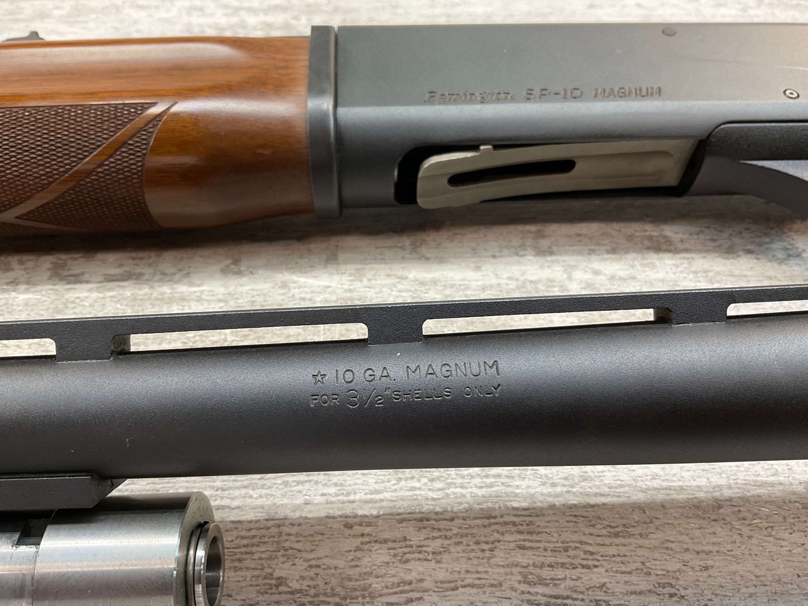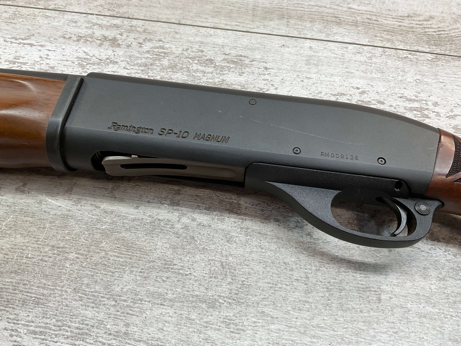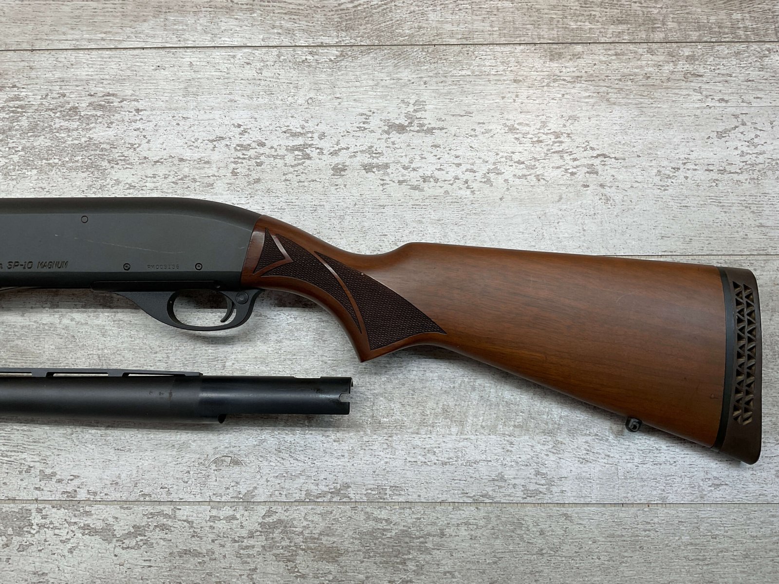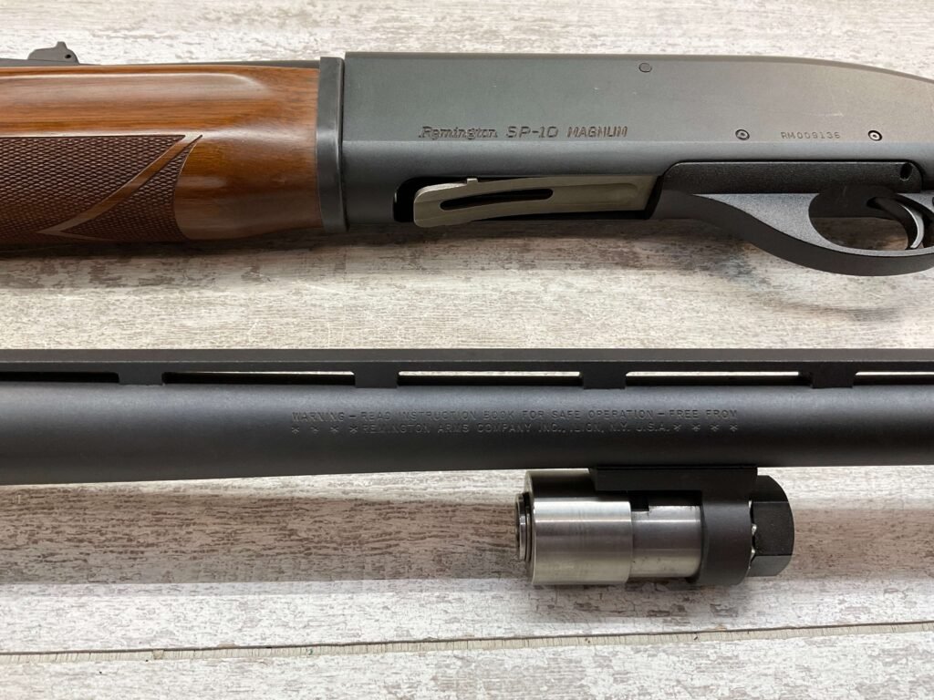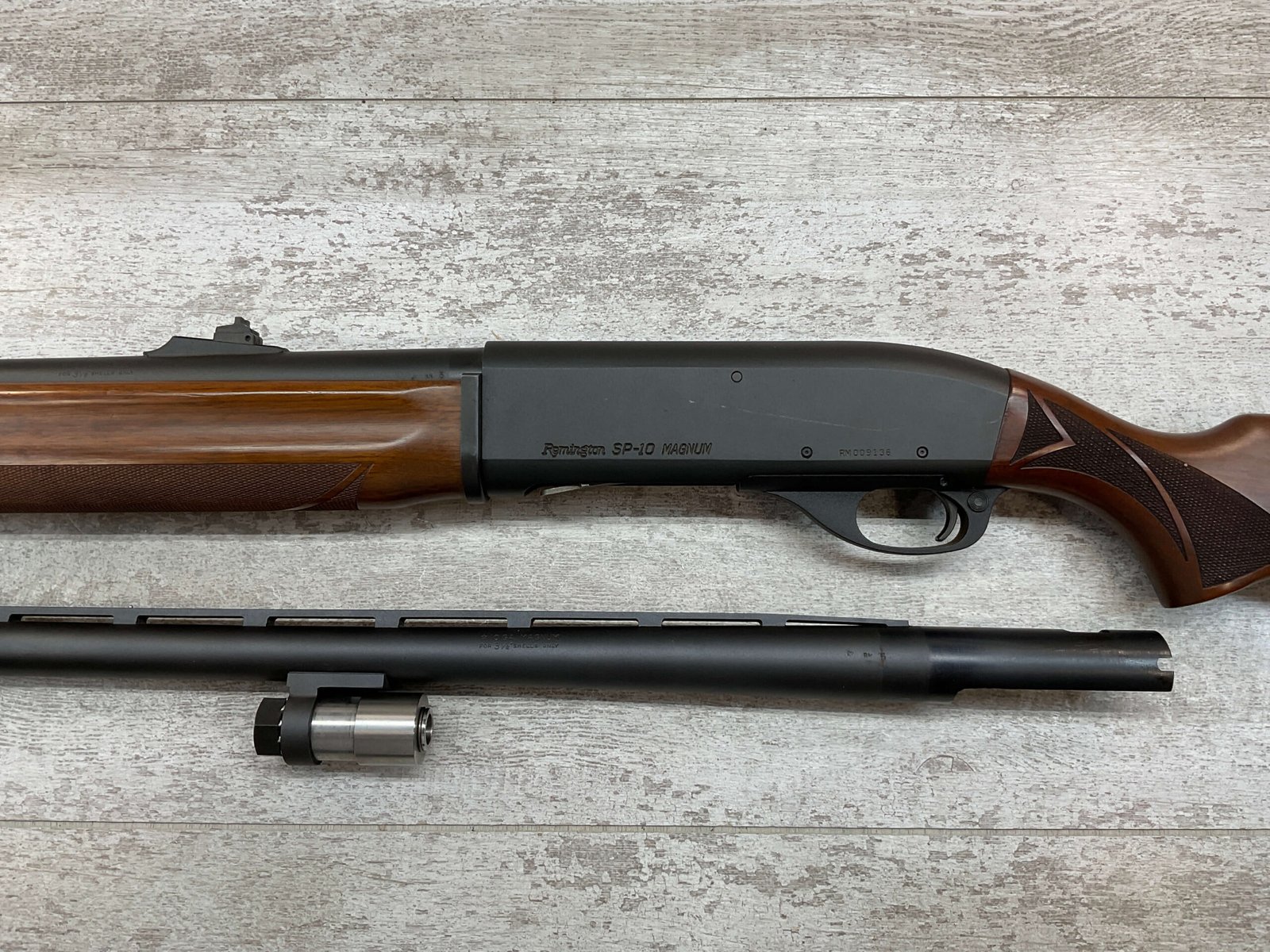 REMINGTON SP-10 10GA SHOTGUN W/TWO BARRELS #RM009136, 3 1/2″ CHAMBER, EXC CHECKERED WALNUT STOCK & FOREARM, EXC MATTE METAL FINISH, R3 RECOIL PAD, 22″ SLUG BARREL, 30″ MOD CHOKE BARREL, EXC LIKE NEW CONDITION