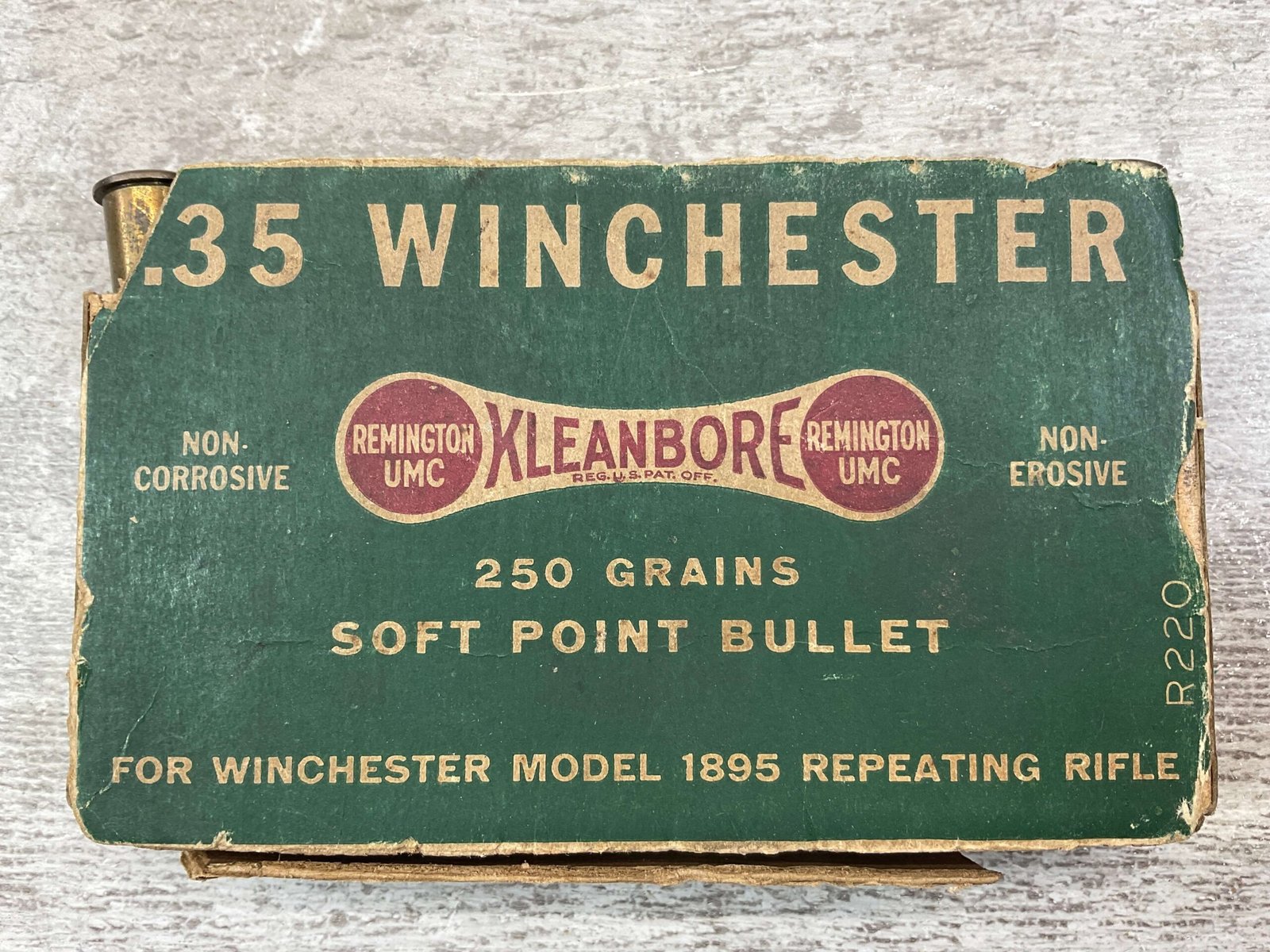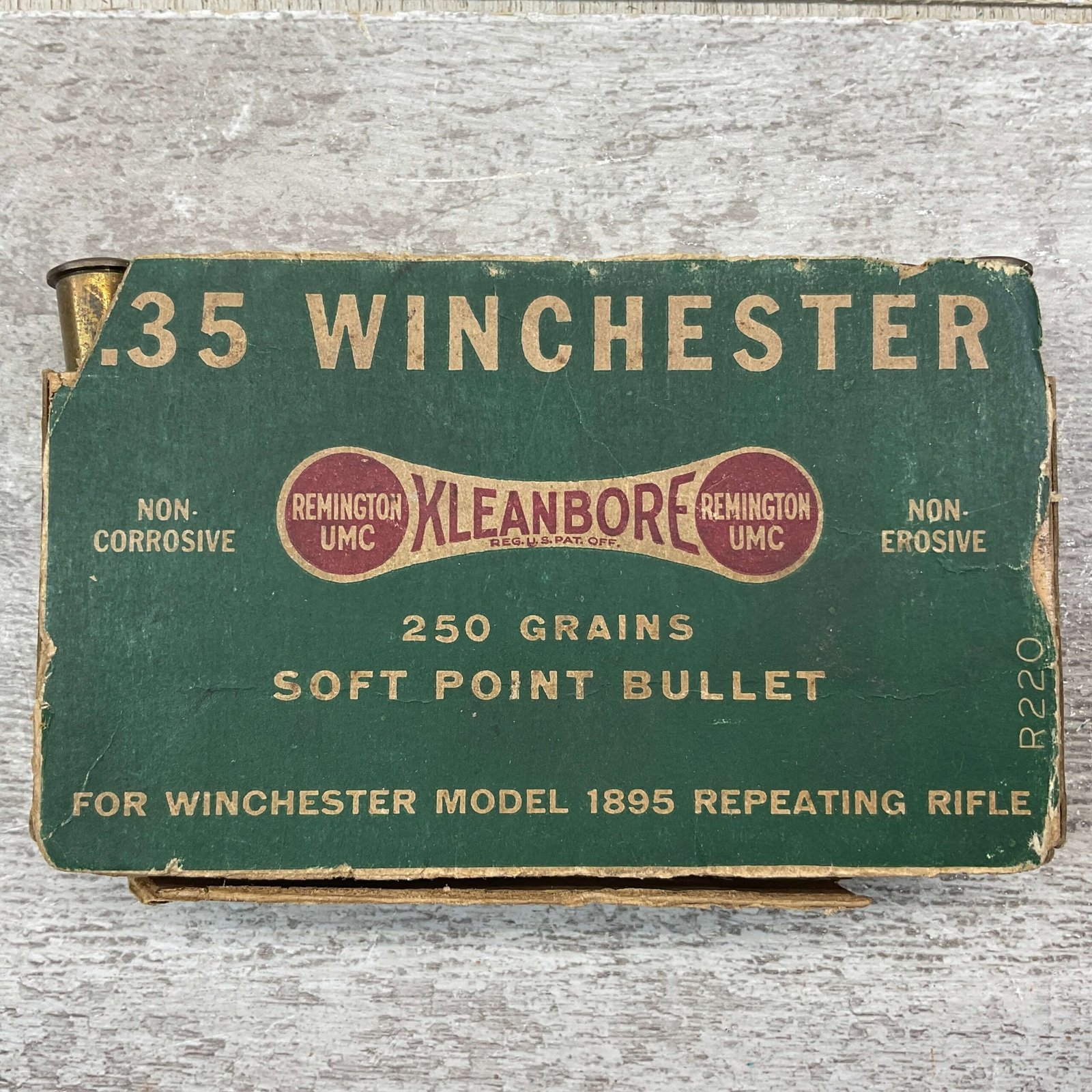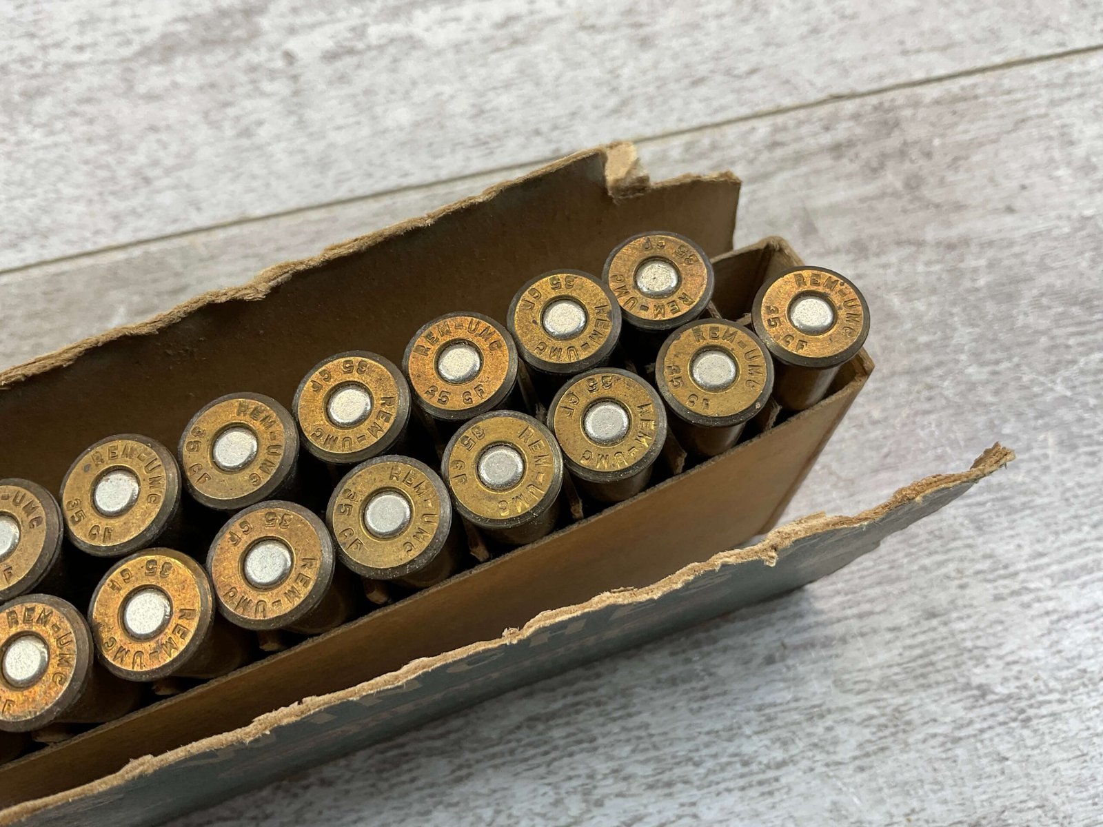 REMINGTON UMC .35 WIN SP 250 GRAIN AMMO, QTY 19, VINTAGE, BOX IS IN POOR CONDITION