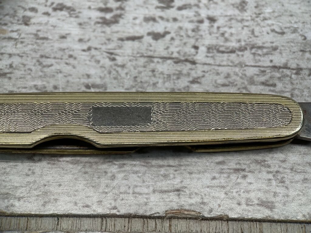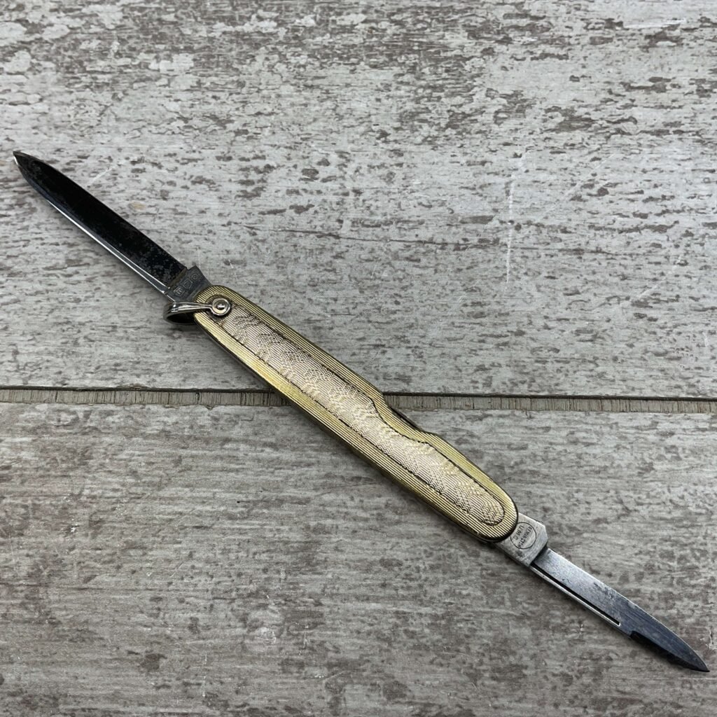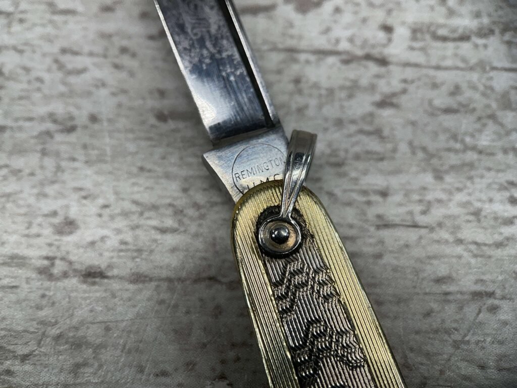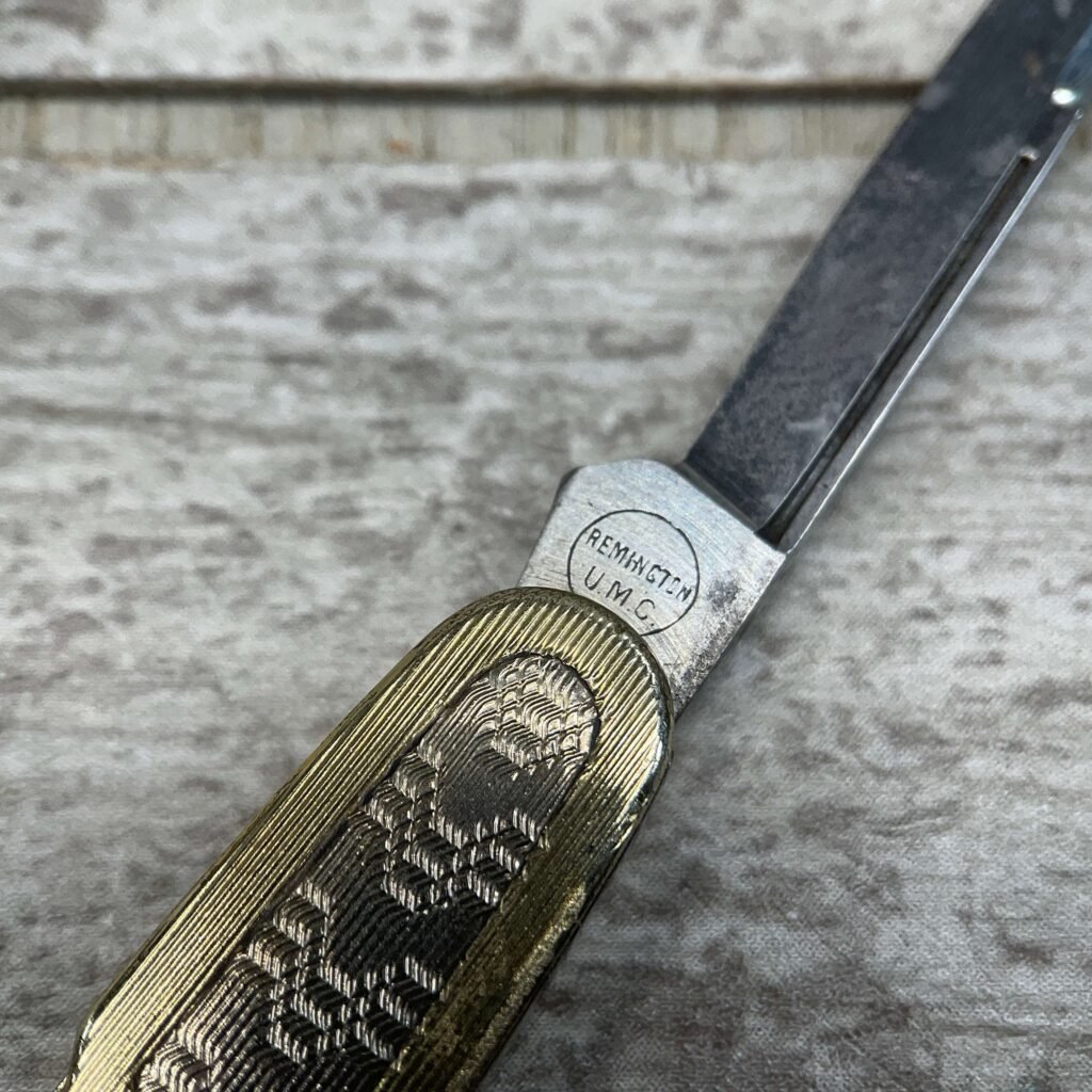 REMINGTON, VINTAGE, ANTIQUE, 2 BLADE POCKET KNIFE, GOLD AND SILVER POCKET KNIFE, MAIN BLADE HAS REMINGTON ON THE BLADE WITH REMINGTON AND UMC IN CIRCLE, 1921 – 1924. ALSO HAS A THREE LETTER STAMP WGC ON THE TANG.