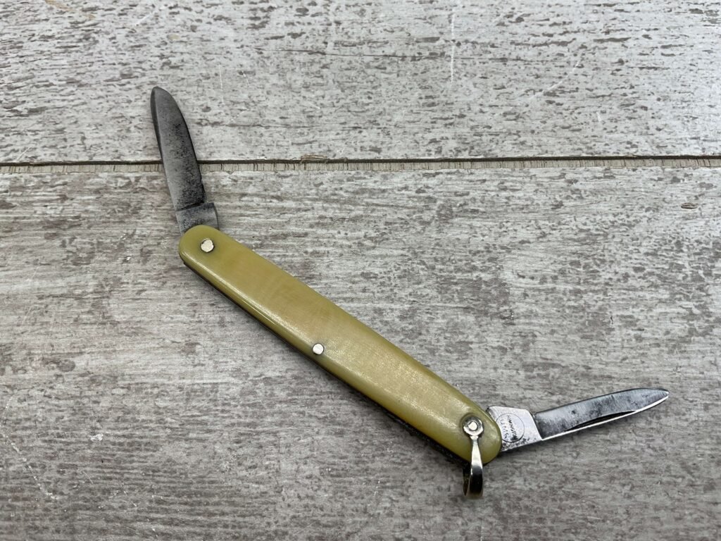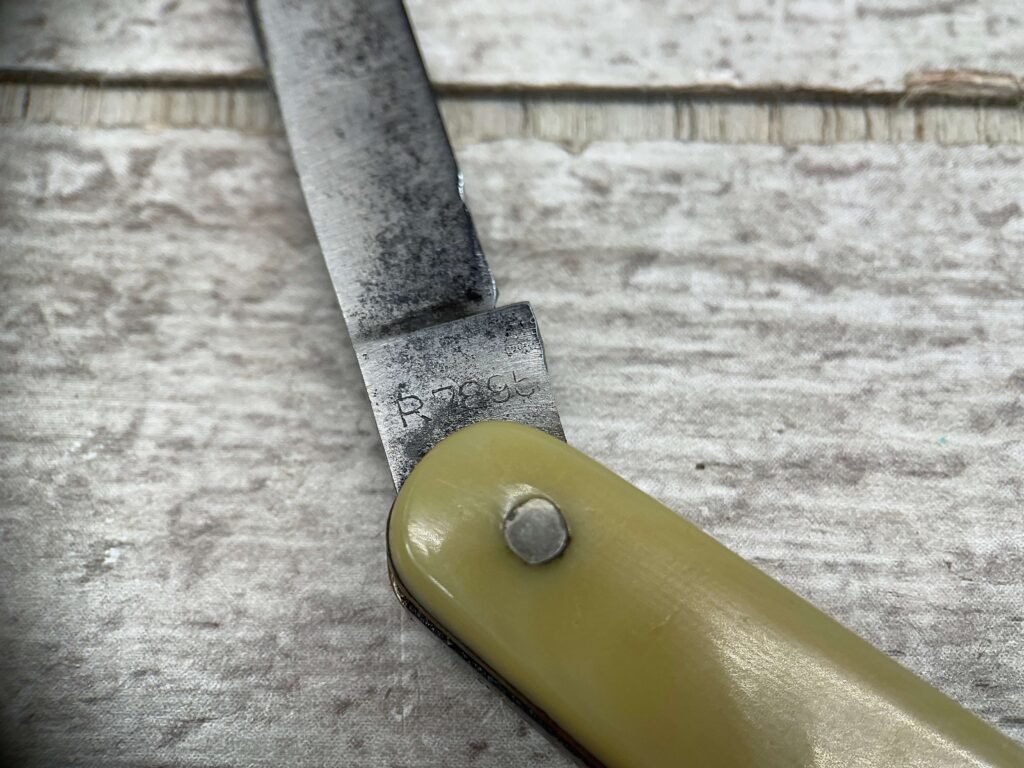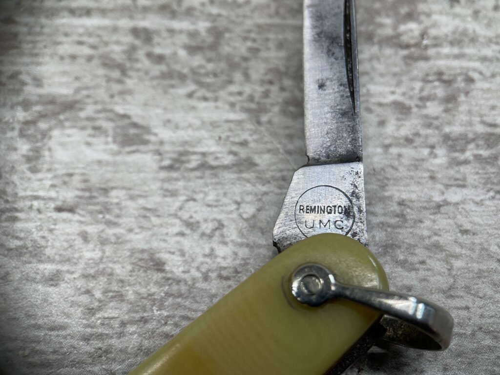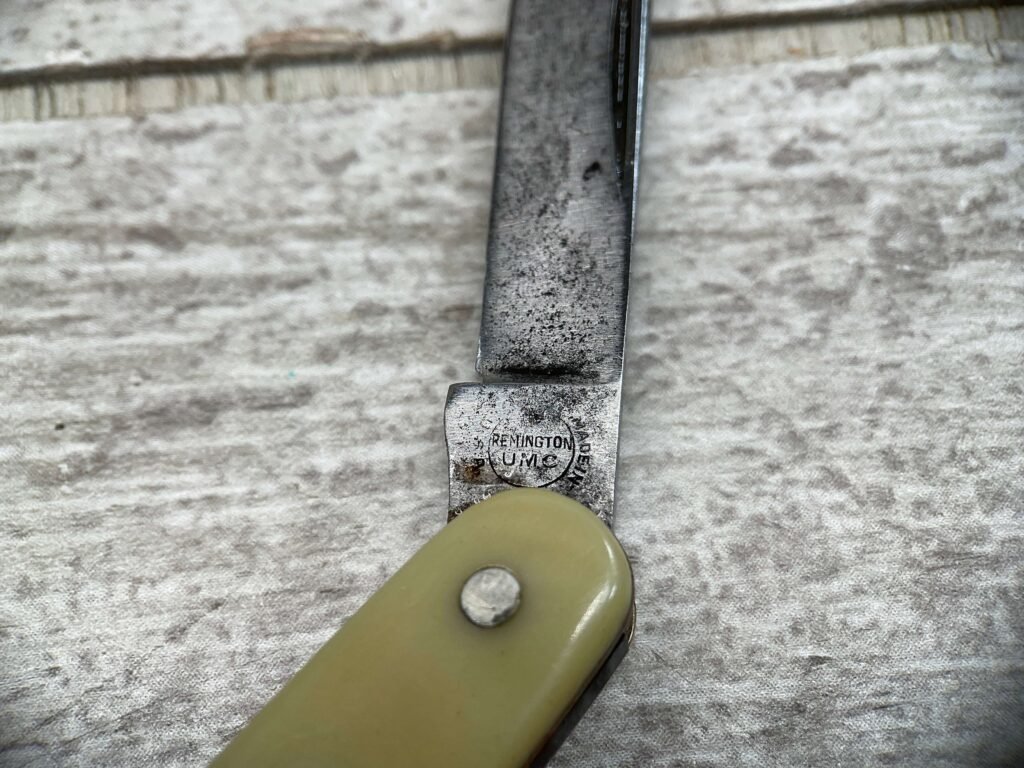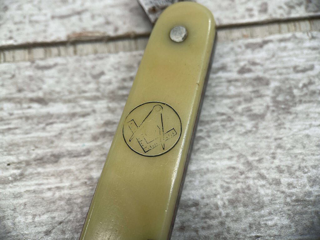 Remington UMC Made in USA stamp pocket knife R-7895 1924-1933, both blades strong snapin. knife is in light use condition and appears to have been sharpened, with original edge. Light staining on both blades, minimal pitting at bottom of blade. Pyremite handle with no cracks or chips, Masonic logo stamped on handle 70% complete in black ink.