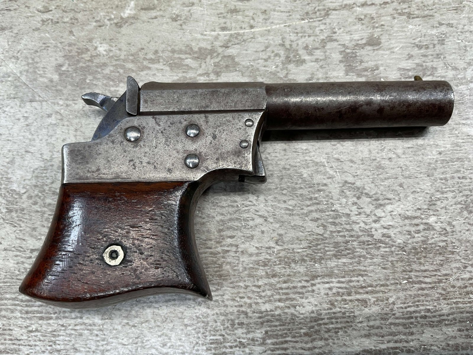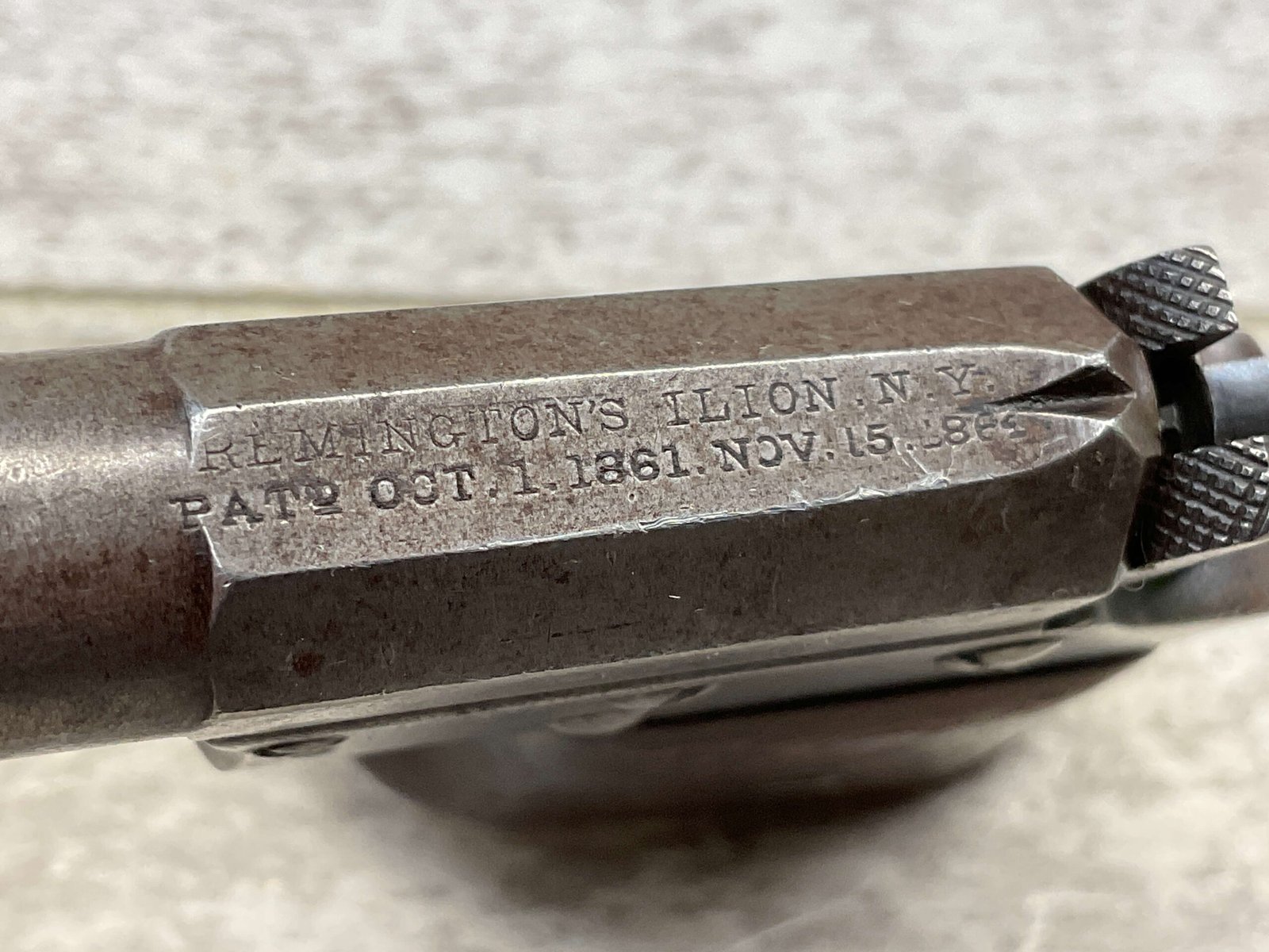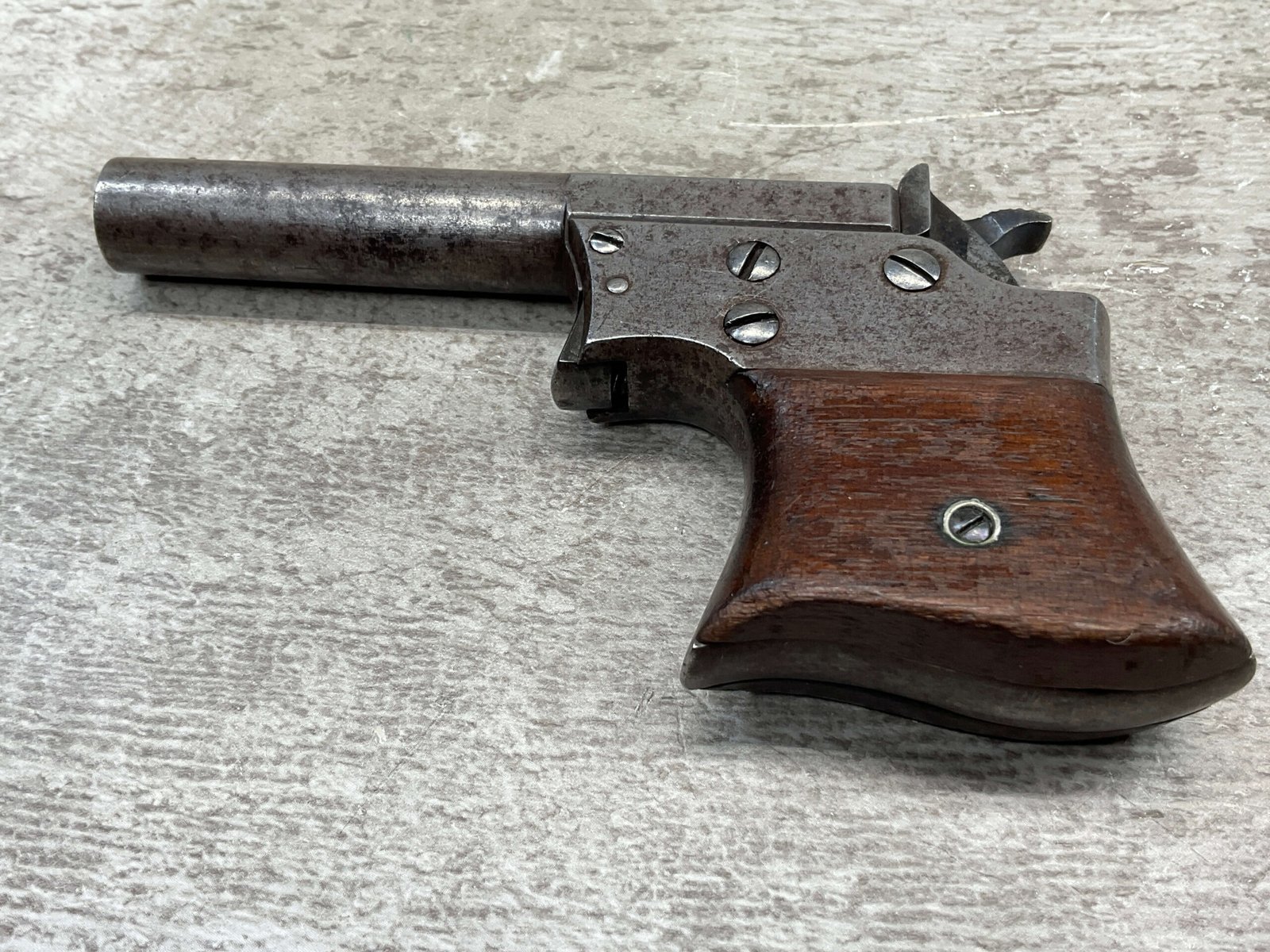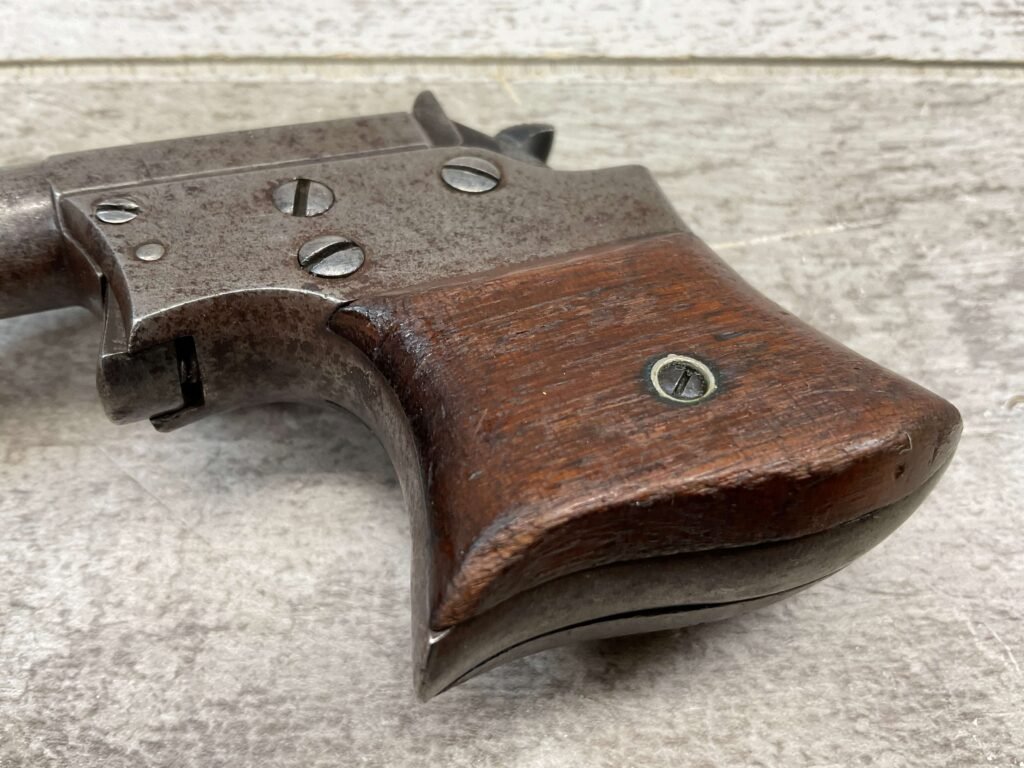 REMINGTON VEST POCKET SAW HANDLE 30 RF SINGLE SHOT DERRINGER, ANTIQUE #2836, 3.5″ OCTAGON TO ROUND BARREL MARKED “REMINGTON’S ILION N.Y.” over “PATD OCT. 1, 1861, NOV.16,1864”, ALL MATCHING, SURPRISINGLY GOOD BORE W/ LIGHT FROSTING IN AREAS & GOOD RIFLING, FINISH TURNING GREY PATINA, ORIGINAL MATCHING GRIPS, FULLY FUNCTIONING SPLIT BREECH ACTION, NOT A REPRODUCTION, OVERALL CONDITION AS SEEN IN PHOTOS