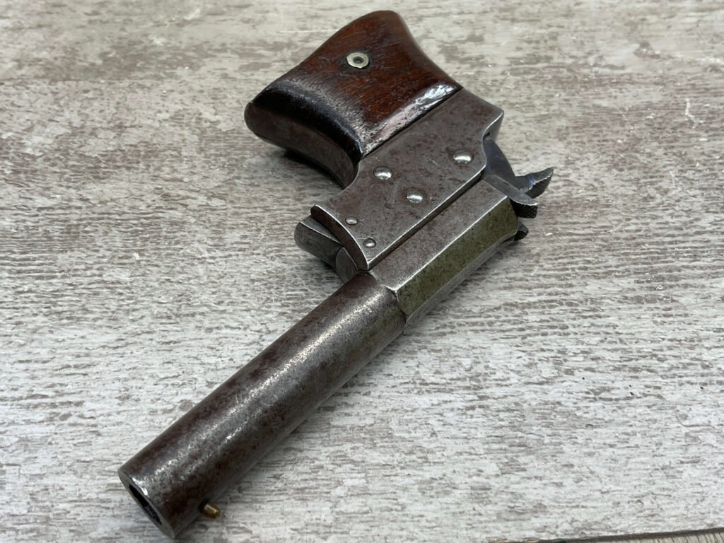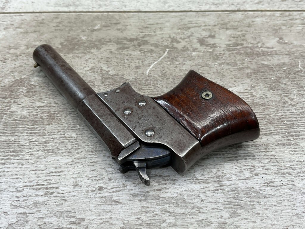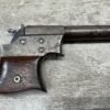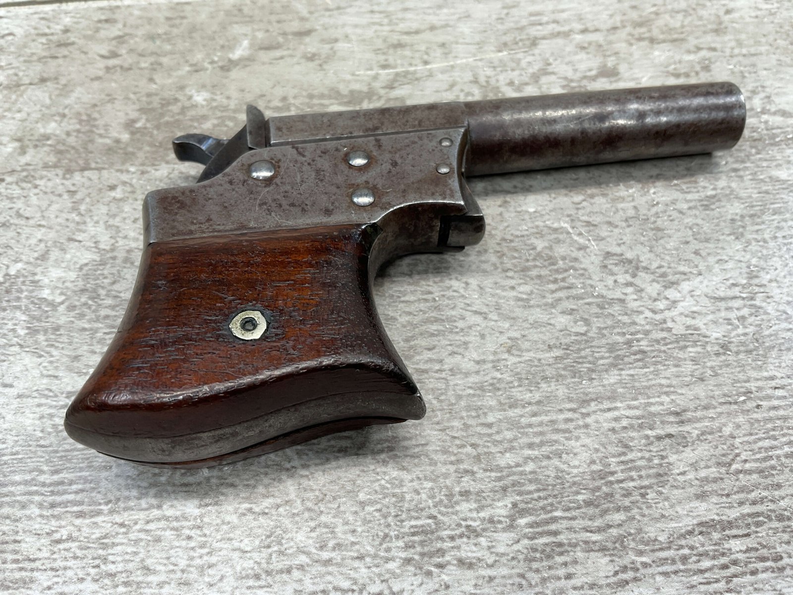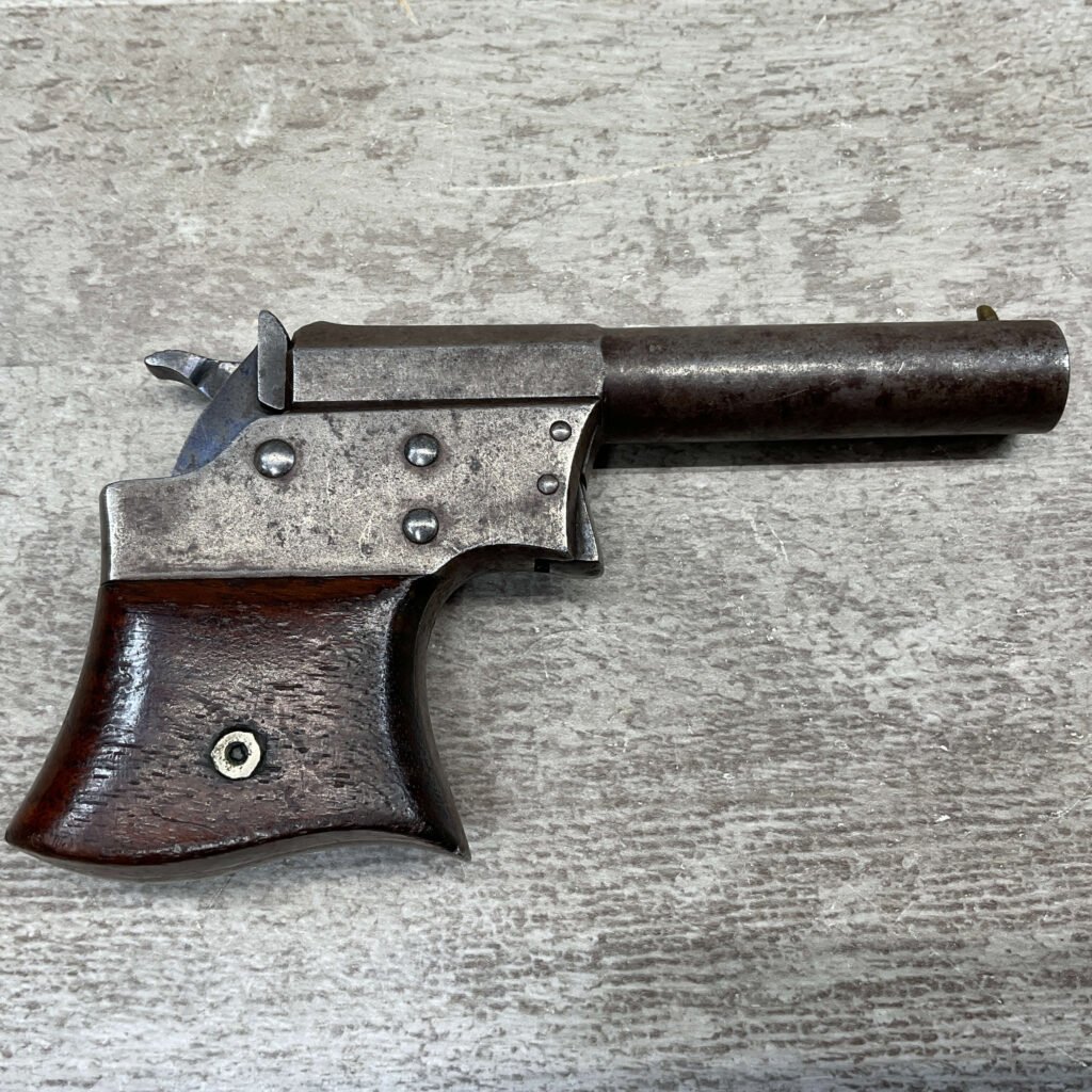 REMINGTON VEST POCKET SAW HANDLE 30 RF SINGLE SHOT DERRINGER, ANTIQUE #2836, 3.5″ OCTAGON TO ROUND BARREL MARKED “REMINGTON’S ILION N.Y.” over “PATD OCT. 1, 1861, NOV.16,1864”, ALL MATCHING, SURPRISINGLY GOOD BORE W/ LIGHT FROSTING IN AREAS & GOOD RIFLING, FINISH TURNING GREY PATINA, ORIGINAL MATCHING GRIPS, FULLY FUNCTIONING SPLIT BREECH ACTION, NOT A REPRODUCTION, OVERALL CONDITION AS SEEN IN PHOTOS