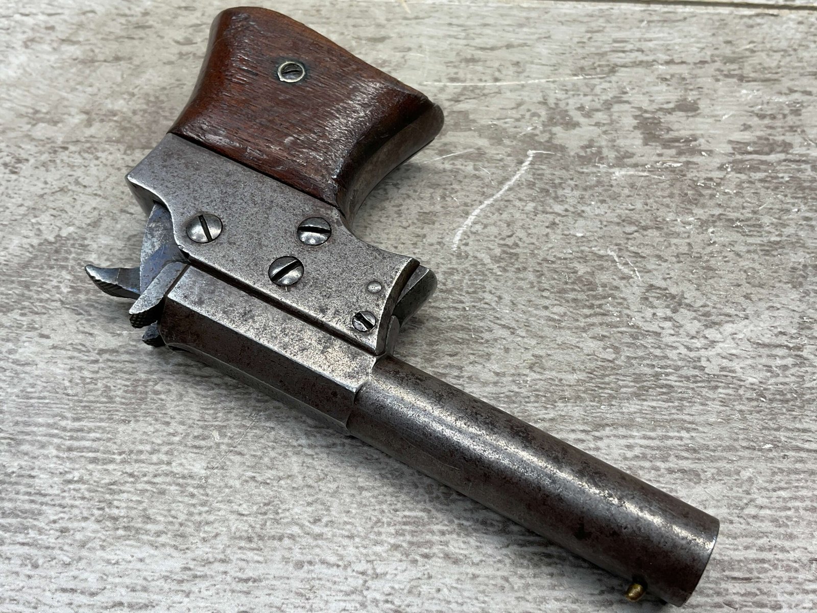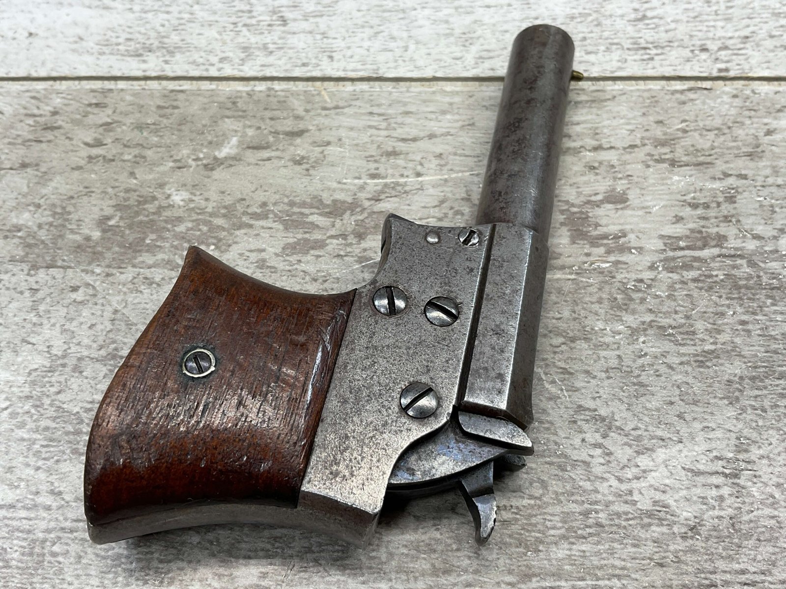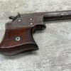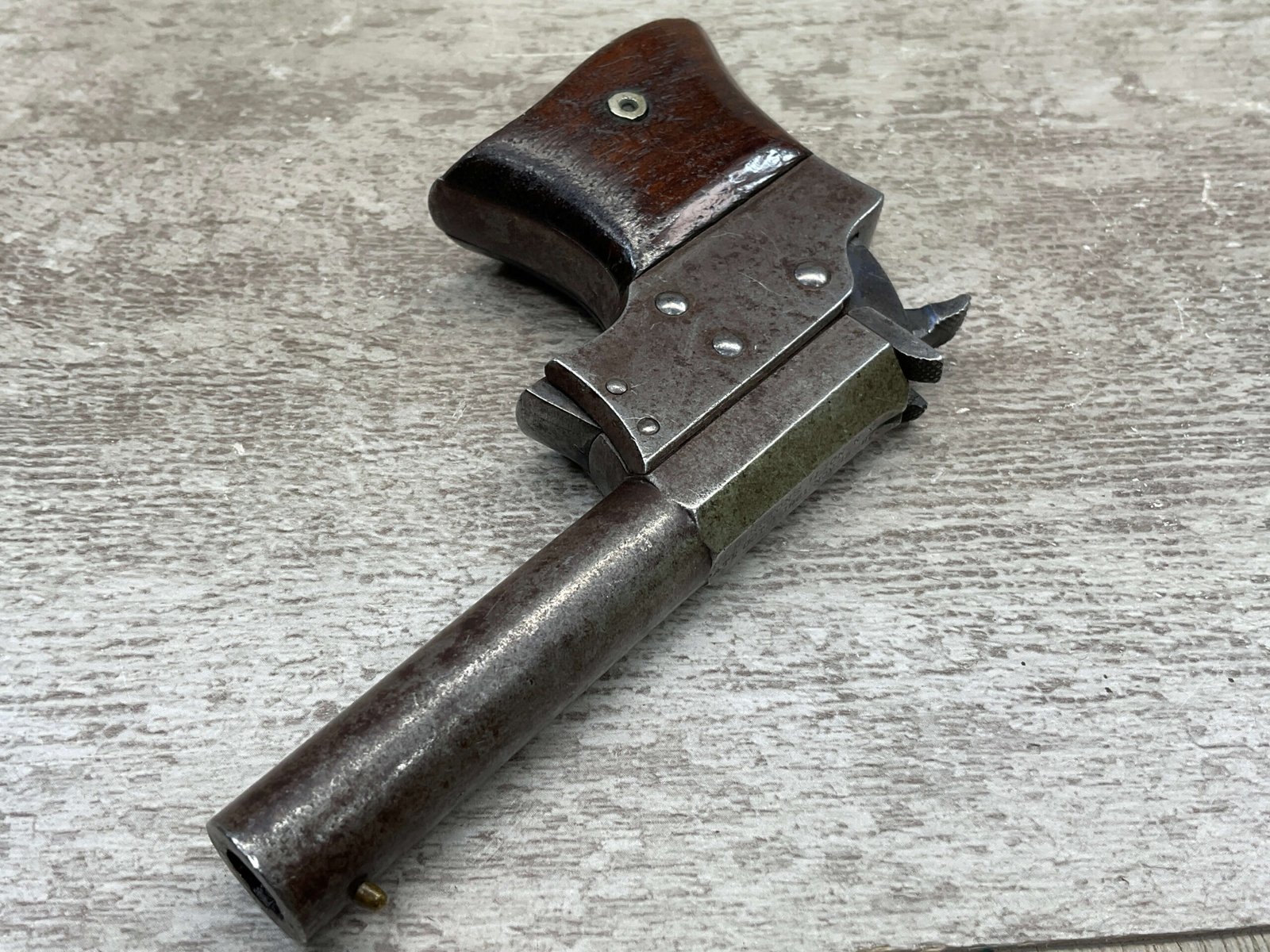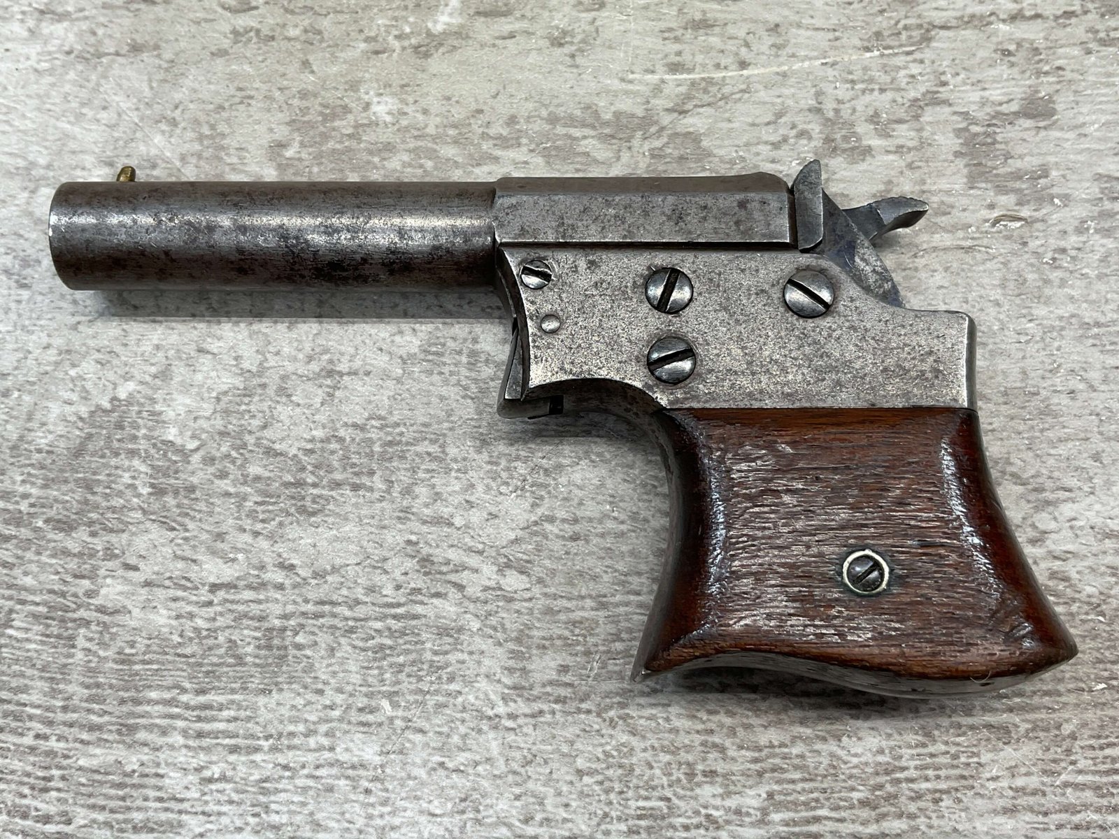 REMINGTON VEST POCKET SAW HANDLE 30 RF SINGLE SHOT DERRINGER, ANTIQUE #2836, 3.5″ OCTAGON TO ROUND BARREL MARKED “REMINGTON’S ILION N.Y.” over “PATD OCT. 1, 1861, NOV.16,1864”, ALL MATCHING, SURPRISINGLY GOOD BORE W/ LIGHT FROSTING IN AREAS & GOOD RIFLING, FINISH TURNING GREY PATINA, ORIGINAL MATCHING GRIPS, FULLY FUNCTIONING SPLIT BREECH ACTION, NOT A REPRODUCTION, OVERALL CONDITION AS SEEN IN PHOTOS