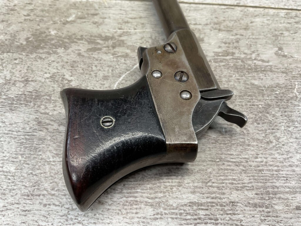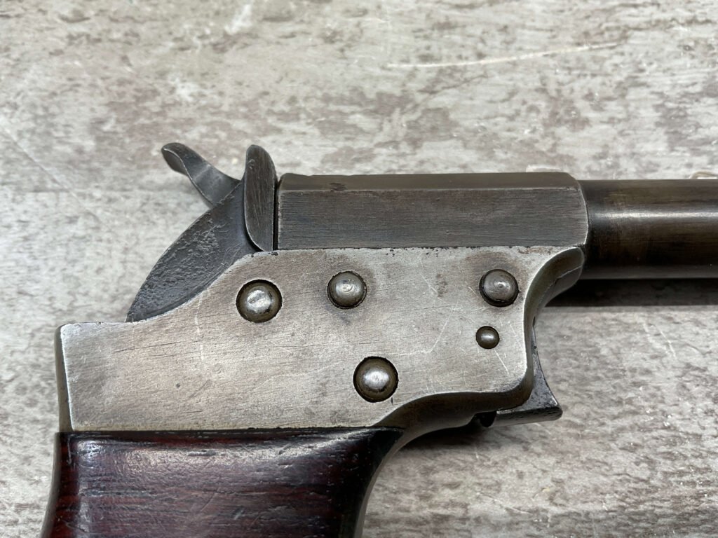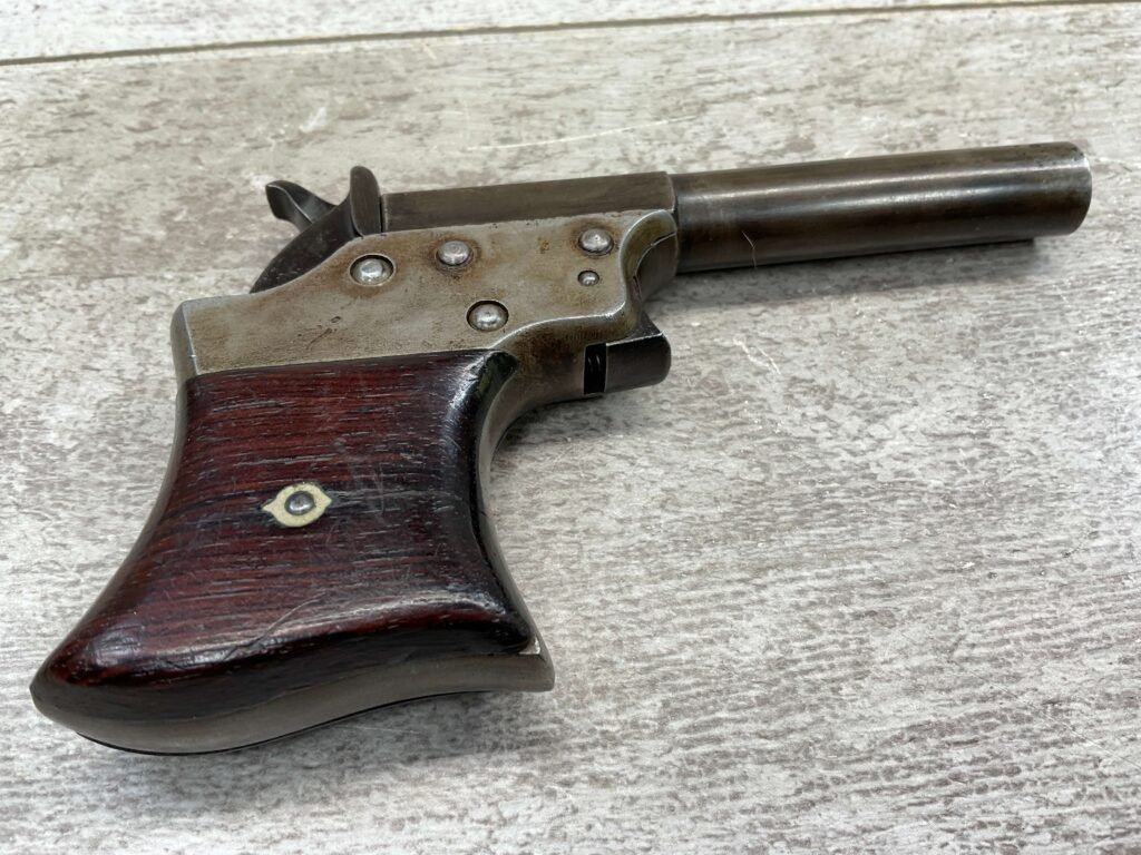 Mechanically functional with visible markings, spur trigger, and rotating barrel release. Ideal for collectors of antique derringers or Civil War-era pocket pistols.