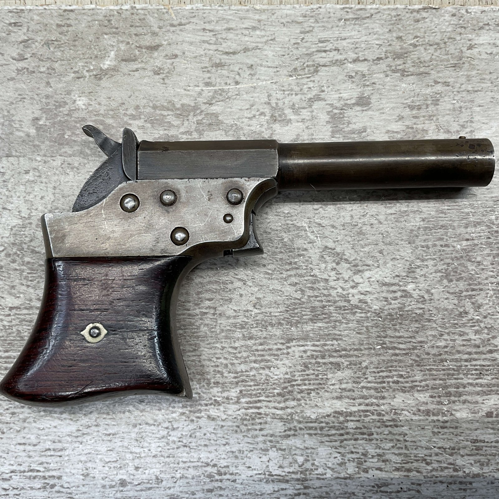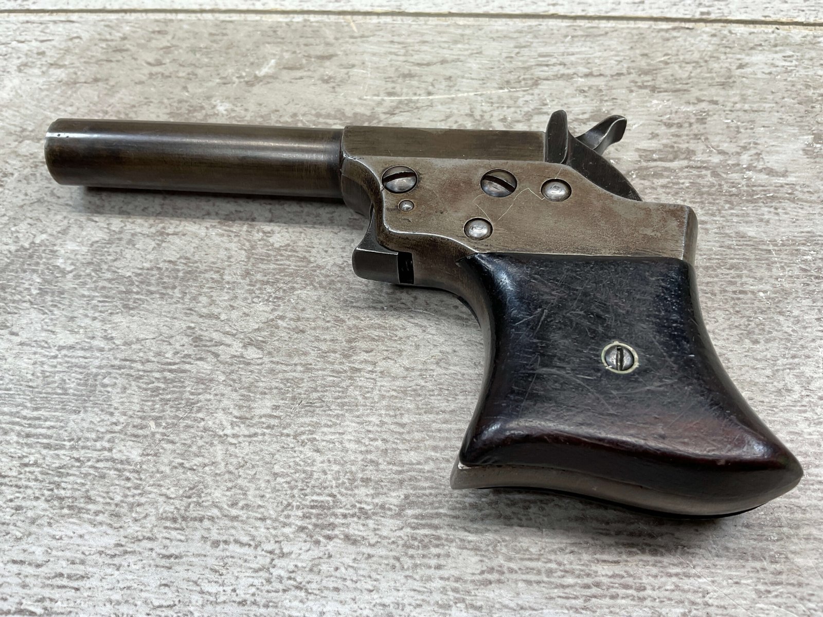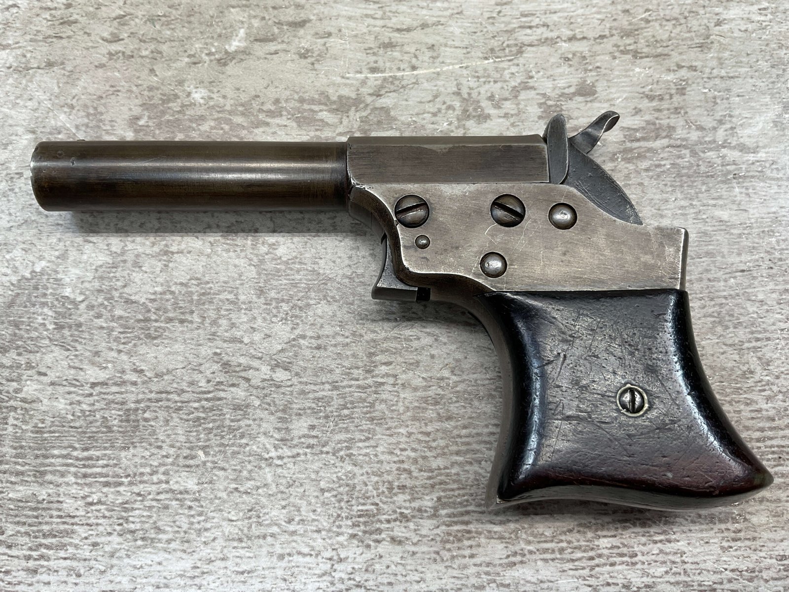 Mechanically functional with visible markings, spur trigger, and rotating barrel release. Ideal for collectors of antique derringers or Civil War-era pocket pistols.