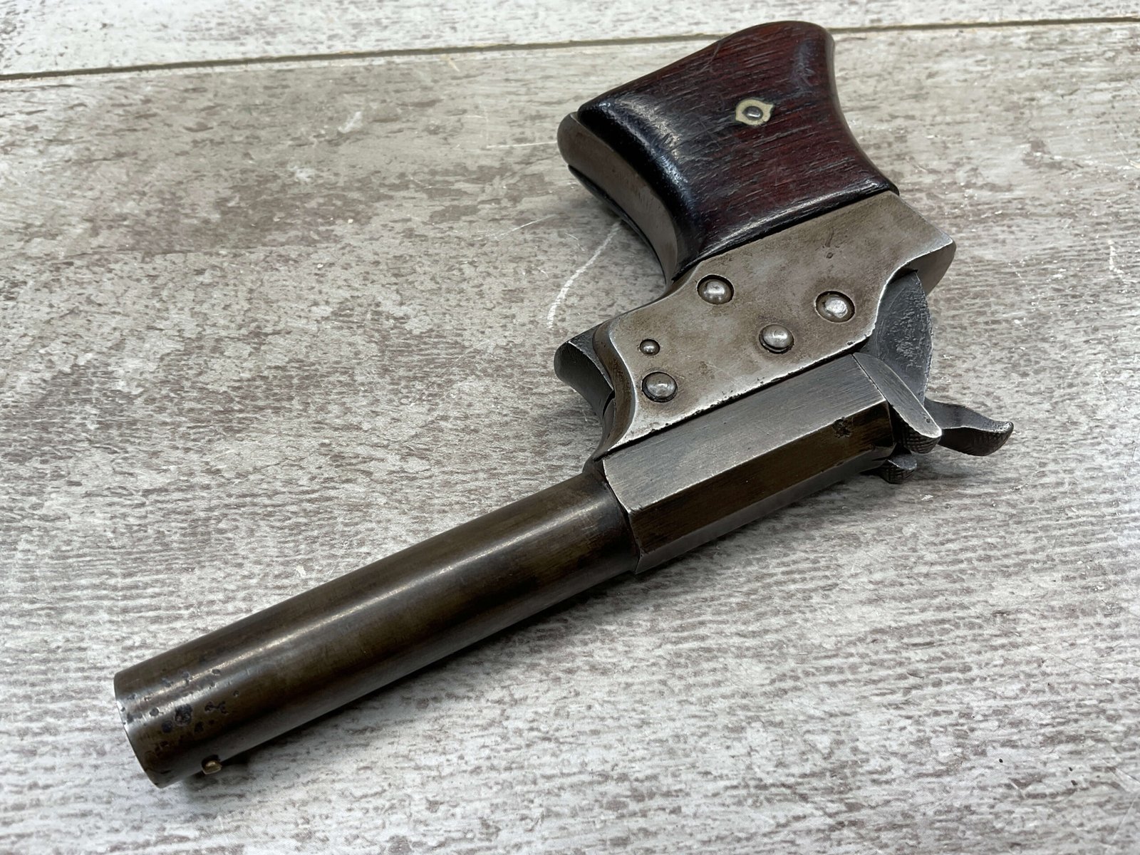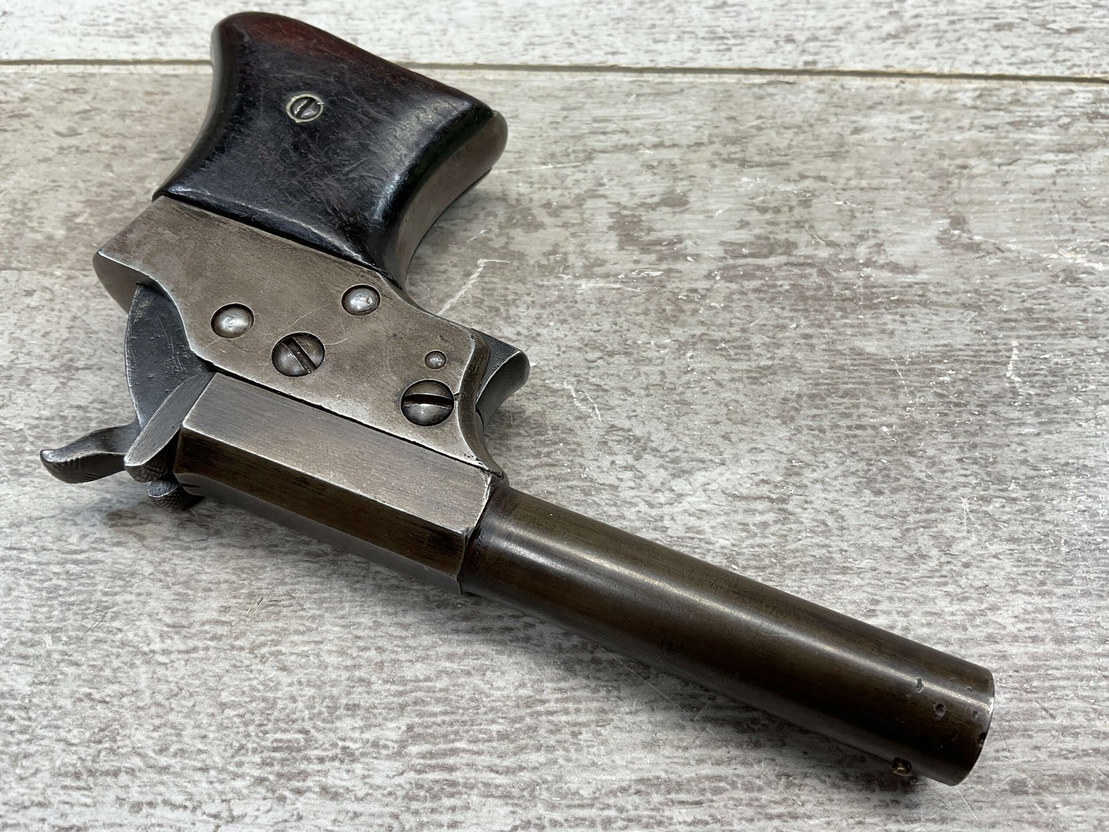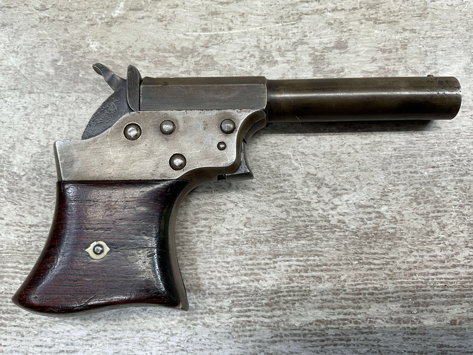 Mechanically functional with visible markings, spur trigger, and rotating barrel release. Ideal for collectors of antique derringers or Civil War-era pocket pistols.