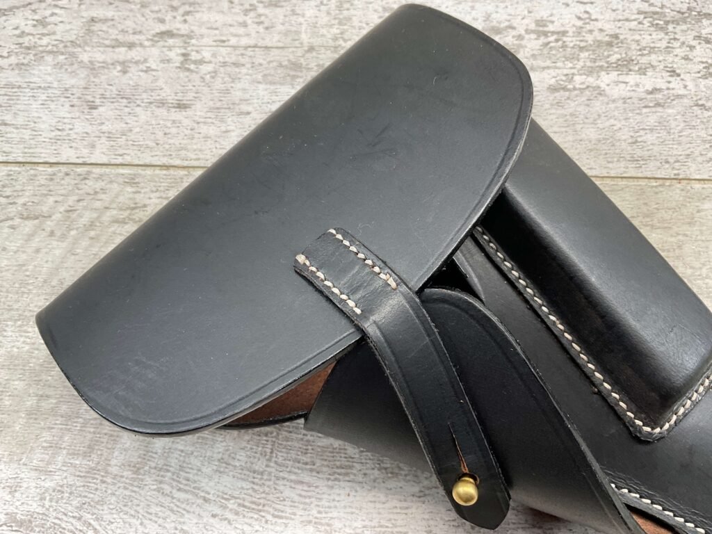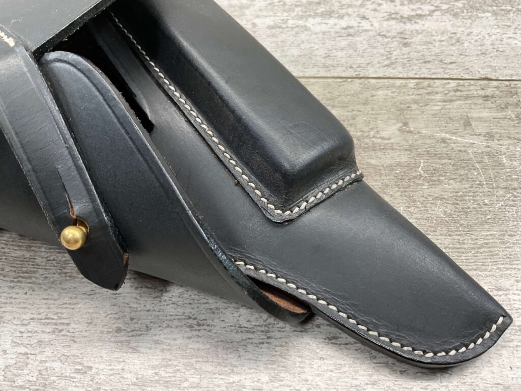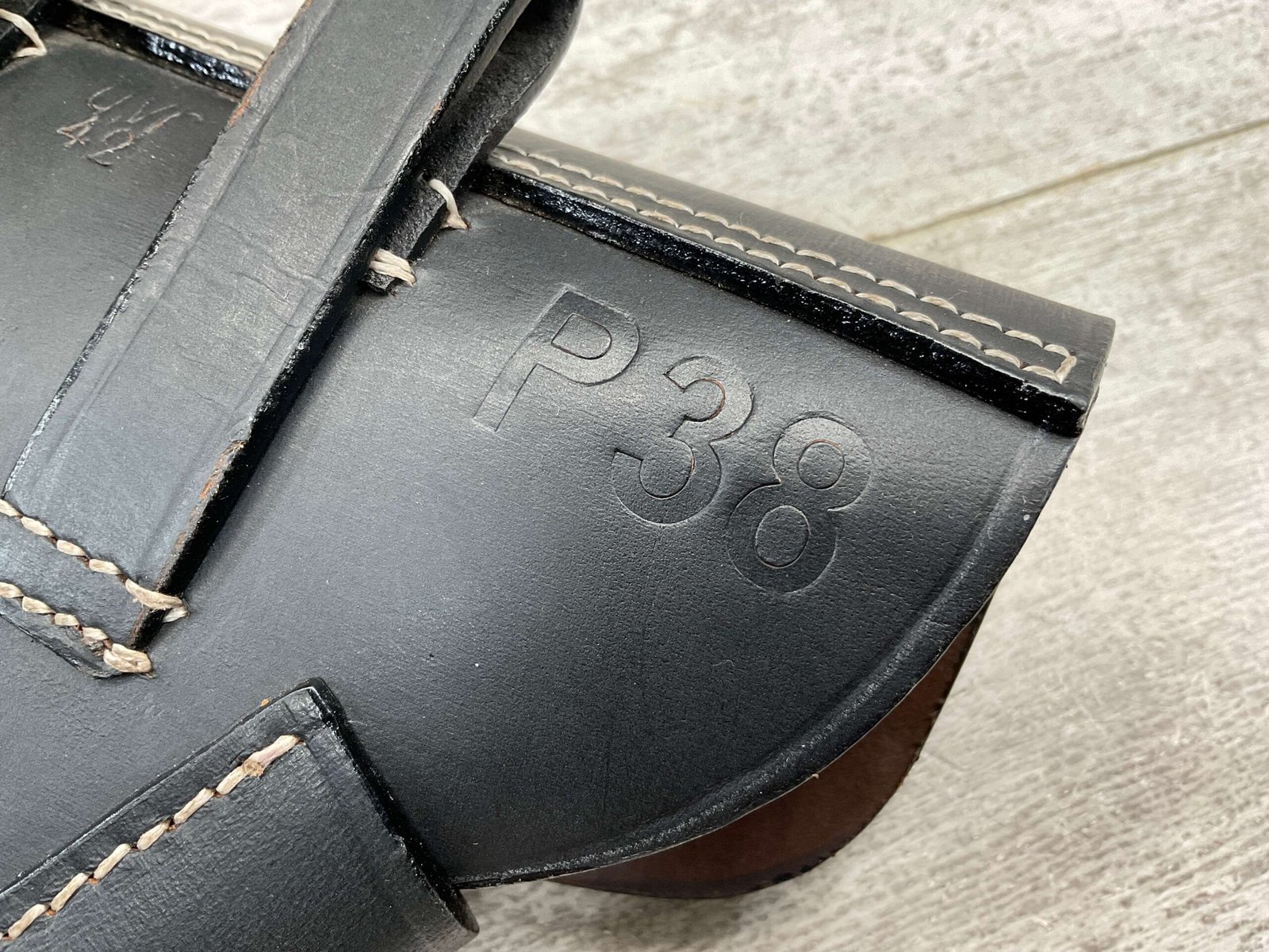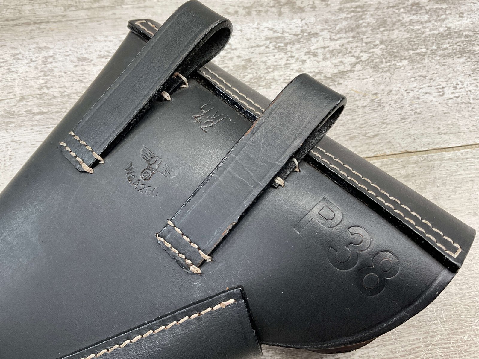REPRODUCTION GERMAN P38 MARKED BLACK LEATHER HOLSTER, BACK OF HOLSTER MARKED “dvr / 42”, “EAGLE / WaA280”, AND “P38”, BEAUTIFUL REPRODUCTION IN NEW CONDITION.