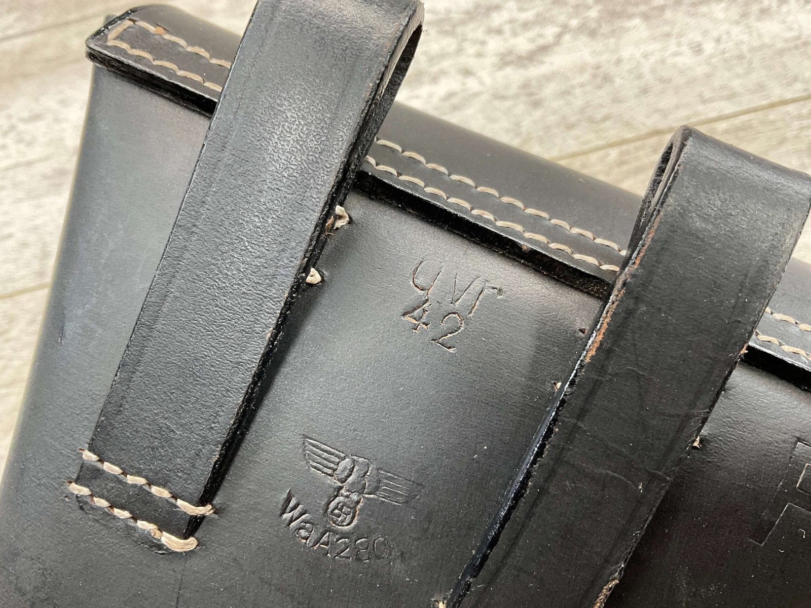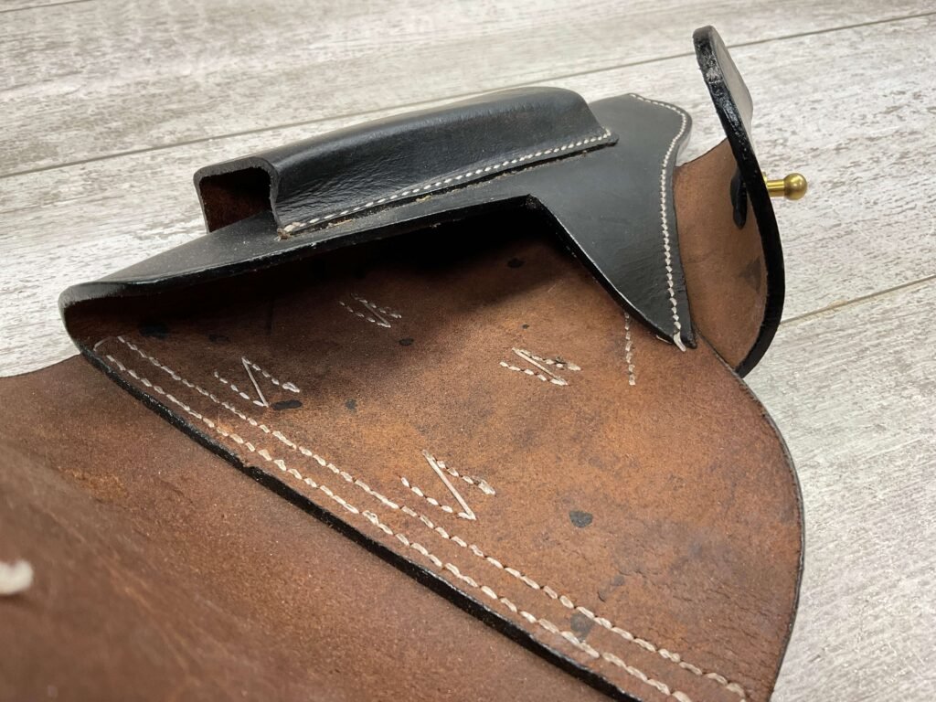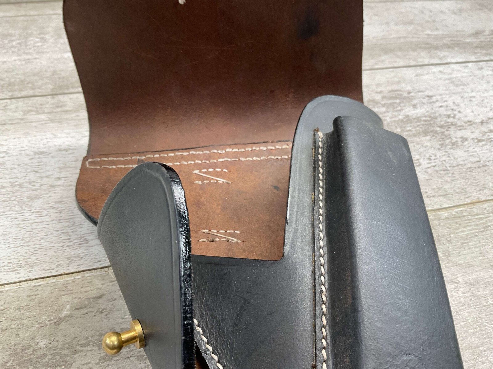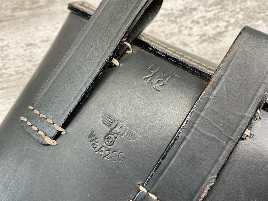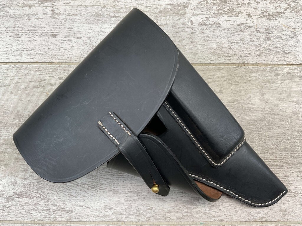 REPRODUCTION GERMAN P38 MARKED BLACK LEATHER HOLSTER, BACK OF HOLSTER MARKED “dvr / 42”, “EAGLE / WaA280”, AND “P38”, BEAUTIFUL REPRODUCTION IN NEW CONDITION.