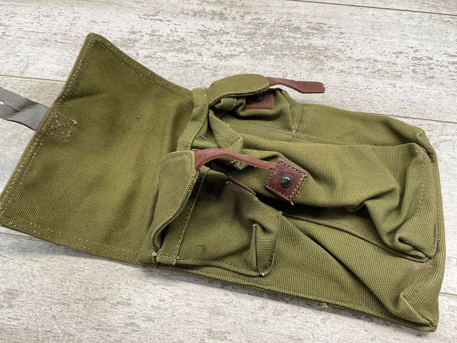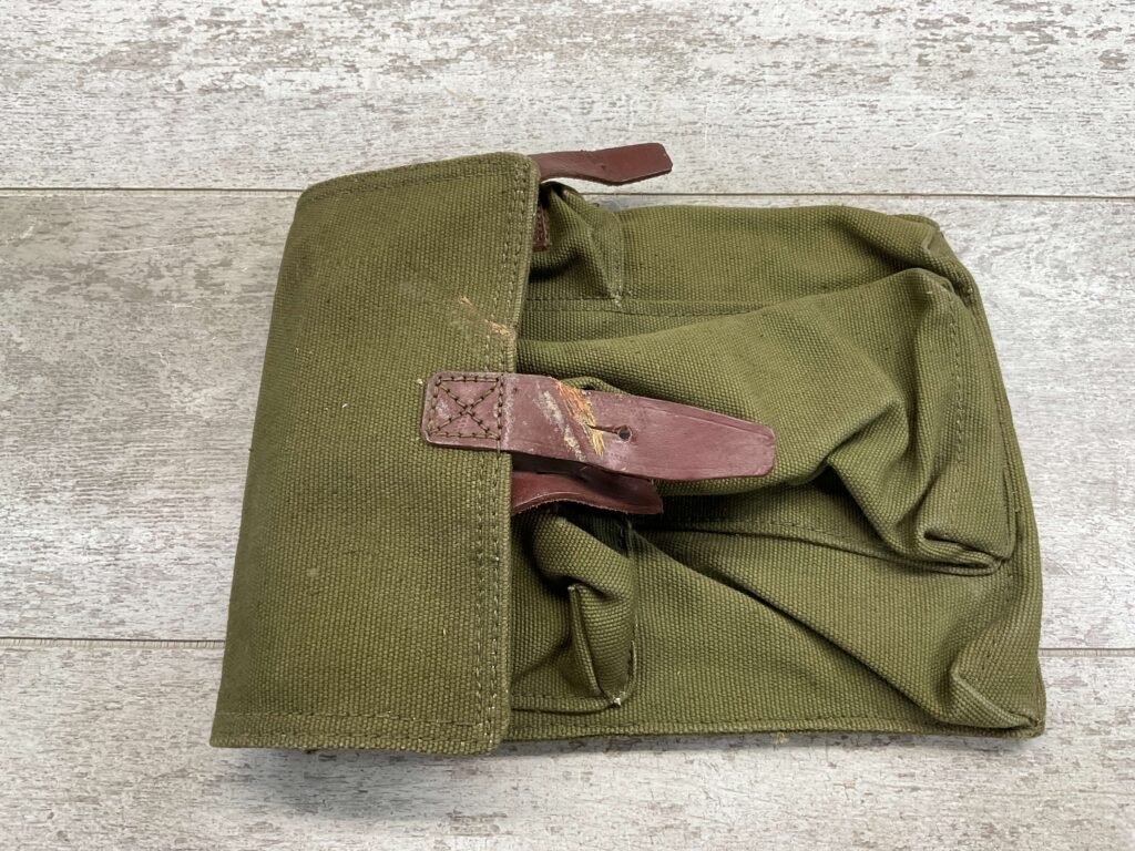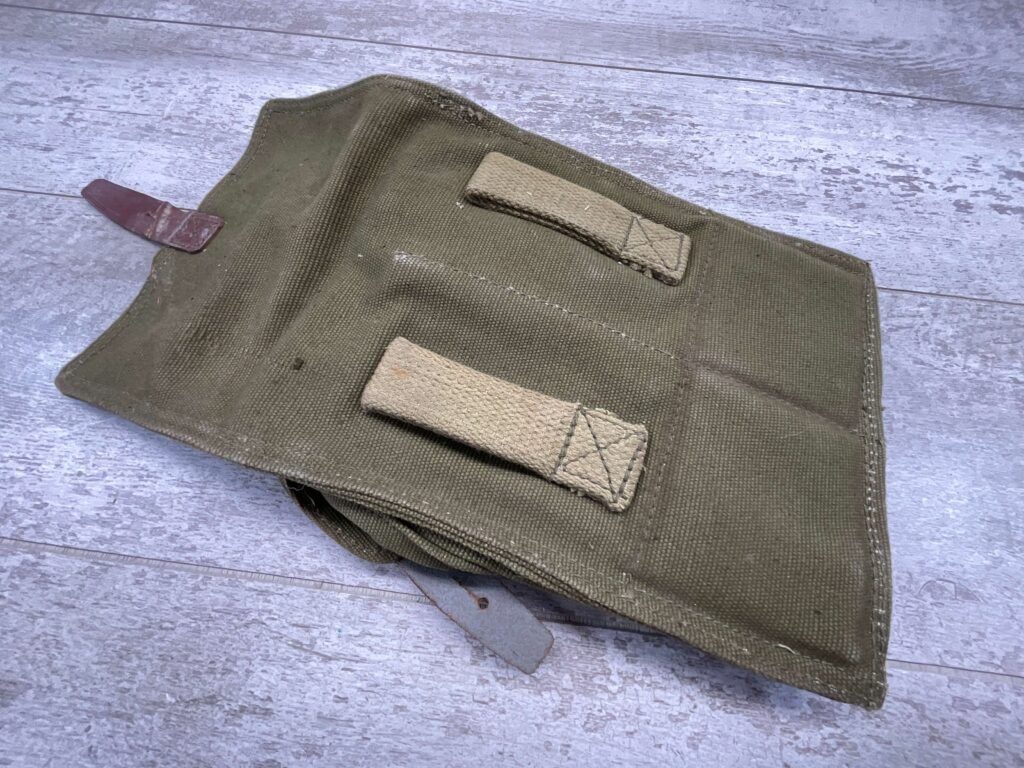 ROMAINIAN AK-47 3 COMPARTMENT MAGAZINE POUCH W/ 2 SMALLER SIDE POUCH, CANVAS BELT LOOPS ON BACK, DAMAGE TO VINYL STRAP, GOOD CONDITION