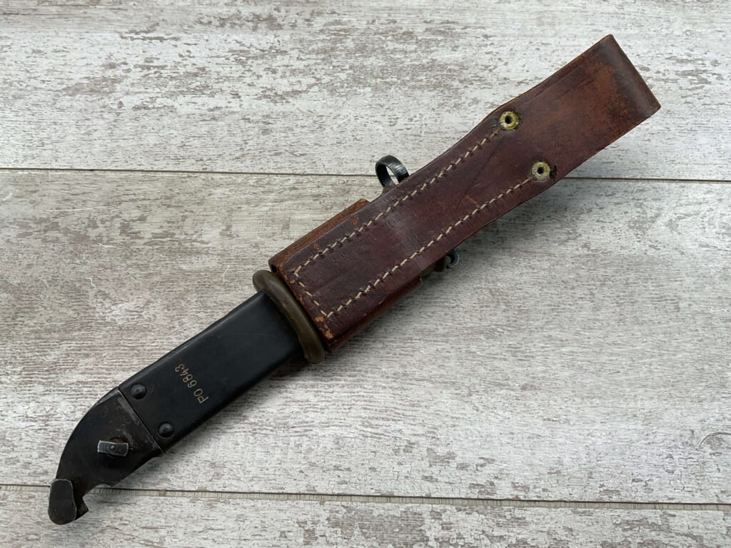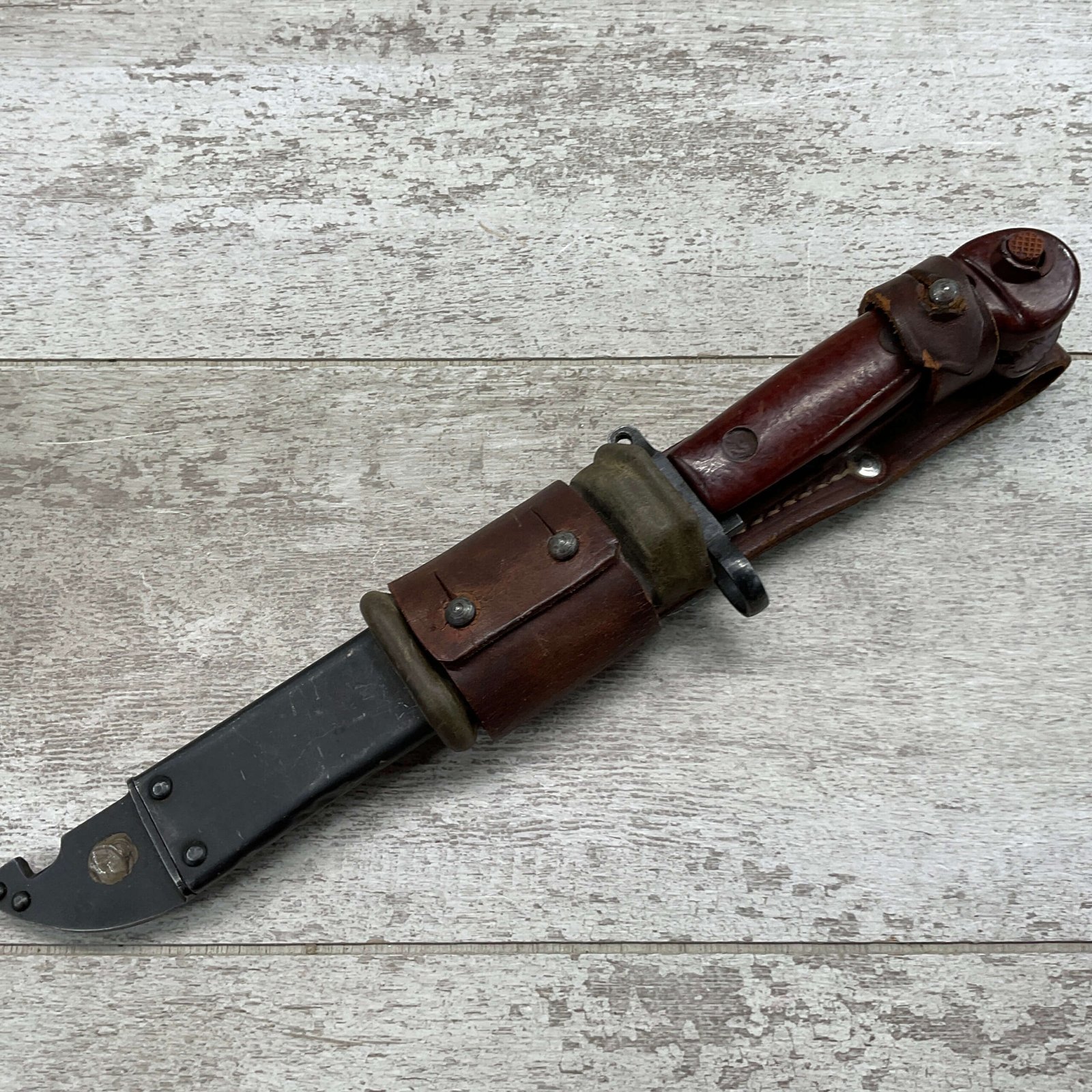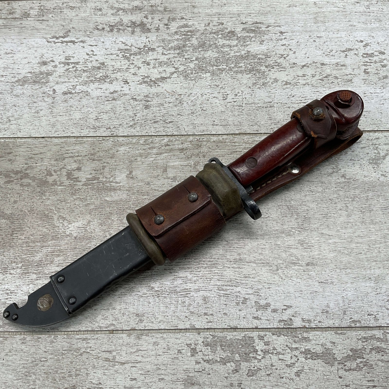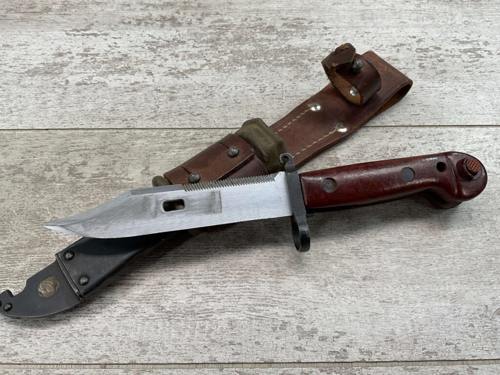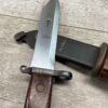 THE ONE-PIECE MOLDED PLASTIC GRIP & POMMEL; AND STAINLESS STEEL BLADE MADE THE BAYONET IMPERVIOUS TO RUST AND ROT. THE UNFULLERED CLIP-POINT BLADE HAD SAWTEETH ALONG THE SPINE. THE STEEL SCABBARD BODY HAD A LUG AT THE POINT THAT ENGAGED A WINDOW CUT INTO THE BLADE, SO THAT BAYONET AND SCABBARD COULD BE COMBINED AS A WIRECUTTER. THE SCABBARD BODY HAD A RUBBER INSULATOR, MAKING IT SAFE TO CUT ELECTRIFIED WIRE.
