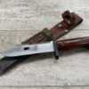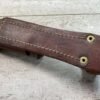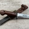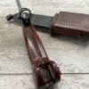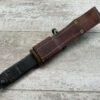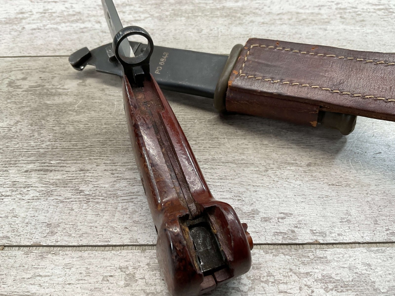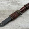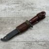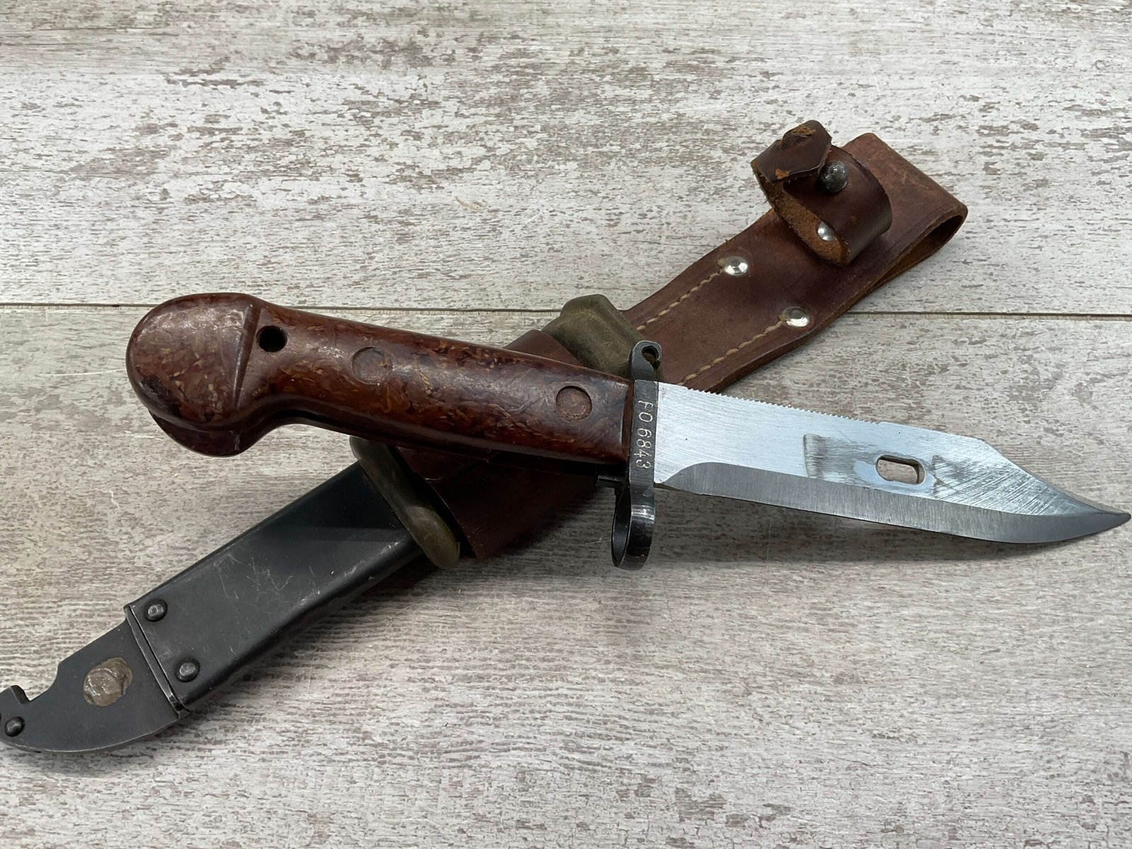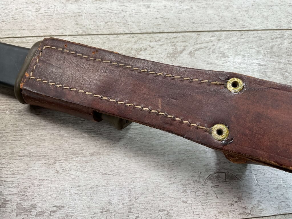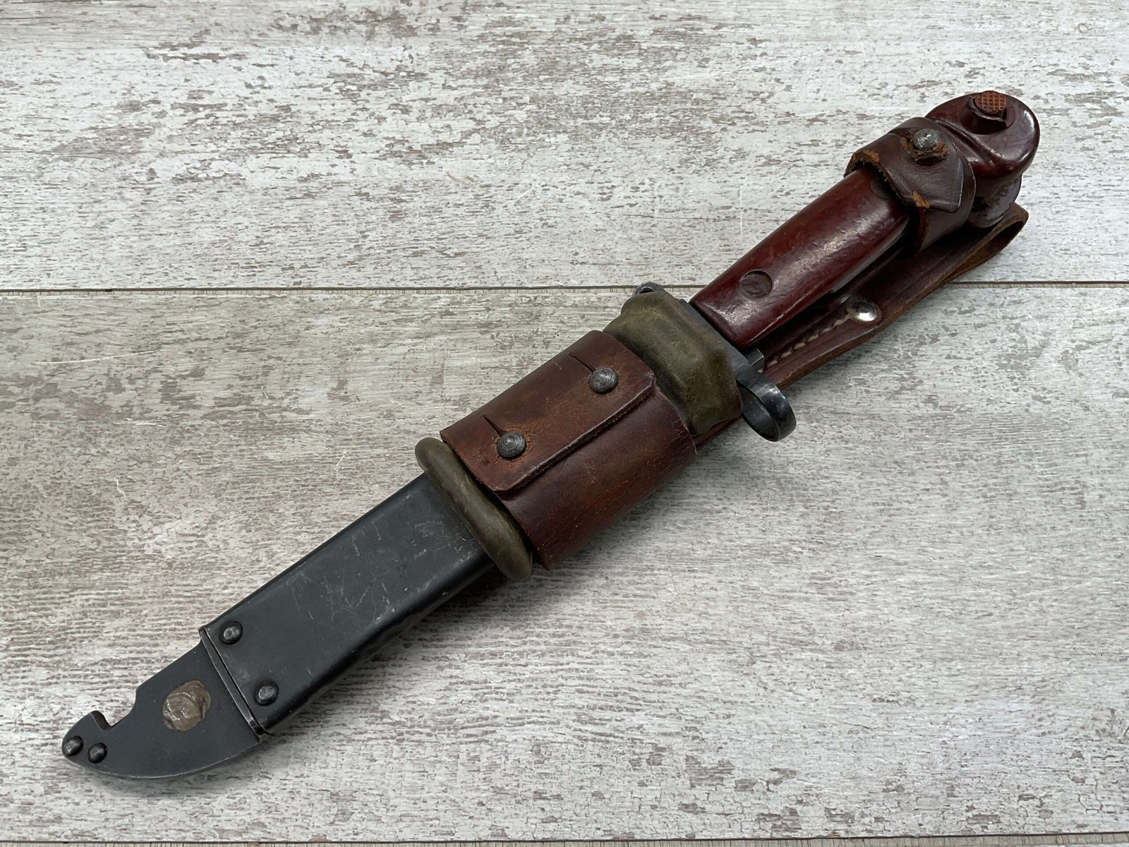 THE ONE-PIECE MOLDED PLASTIC GRIP & POMMEL; AND STAINLESS STEEL BLADE MADE THE BAYONET IMPERVIOUS TO RUST AND ROT. THE UNFULLERED CLIP-POINT BLADE HAD SAWTEETH ALONG THE SPINE. THE STEEL SCABBARD BODY HAD A LUG AT THE POINT THAT ENGAGED A WINDOW CUT INTO THE BLADE, SO THAT BAYONET AND SCABBARD COULD BE COMBINED AS A WIRECUTTER. THE SCABBARD BODY HAD A RUBBER INSULATOR, MAKING IT SAFE TO CUT ELECTRIFIED WIRE.